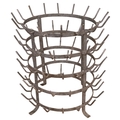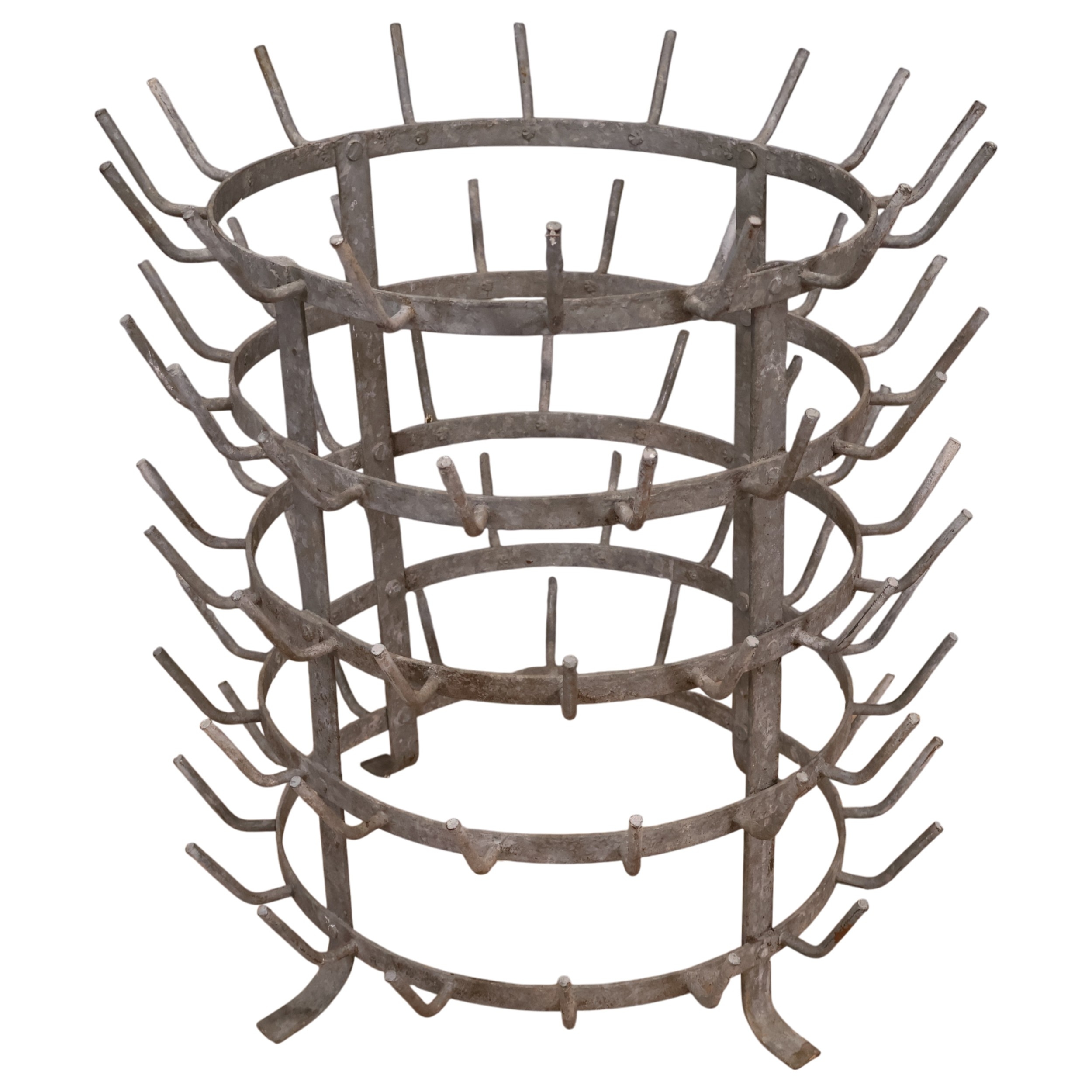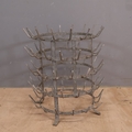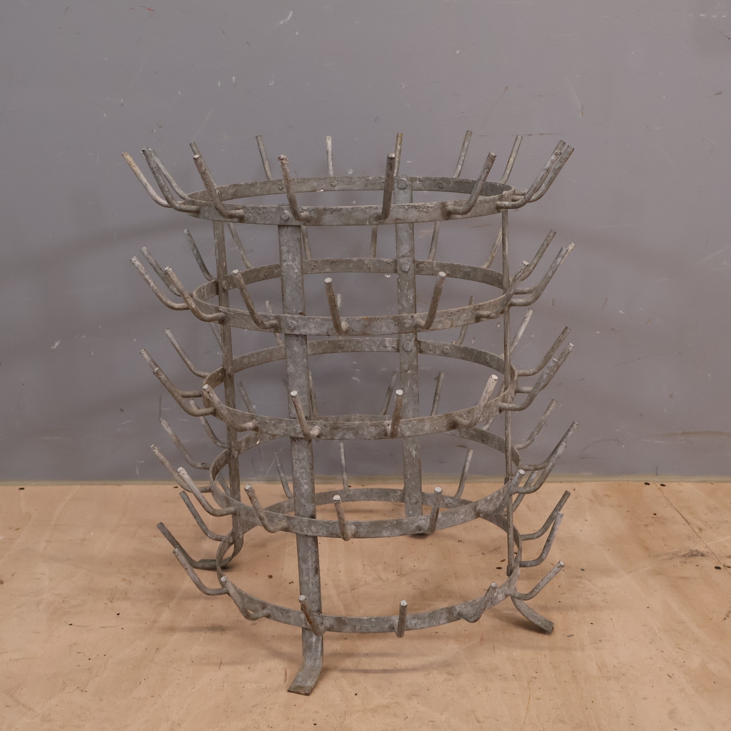 A vintage French galvanised metal bottle drying rack. Diameter 47cm, height 54cm.