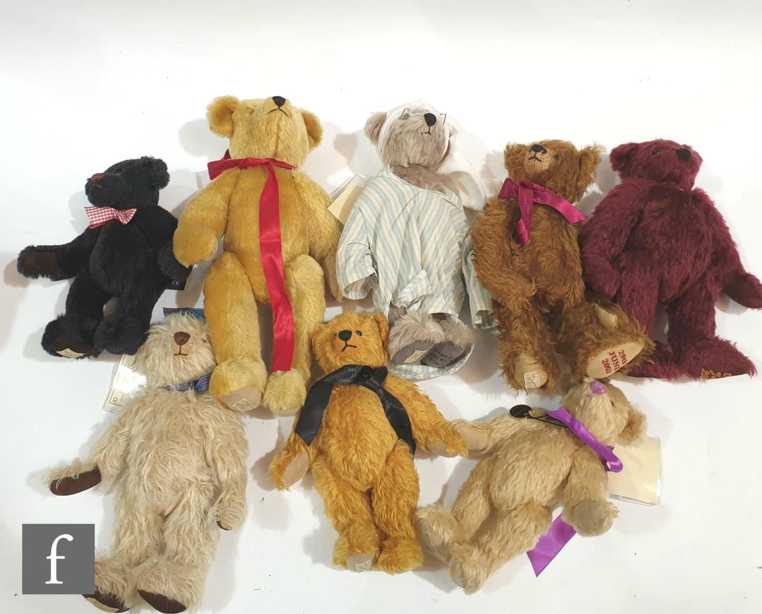 A collection of Dean's Rag Book teddy bears, comprising Dicken's Collection Scrooge, limited edition 197 of 2450, Majesty, 100th Birthday Bear, limited edition 598 of 1000, Henry, Hogarth, Jamboree Bear, Tennyson, limited edition 58 of 200, and one golden teddy bear. (8)