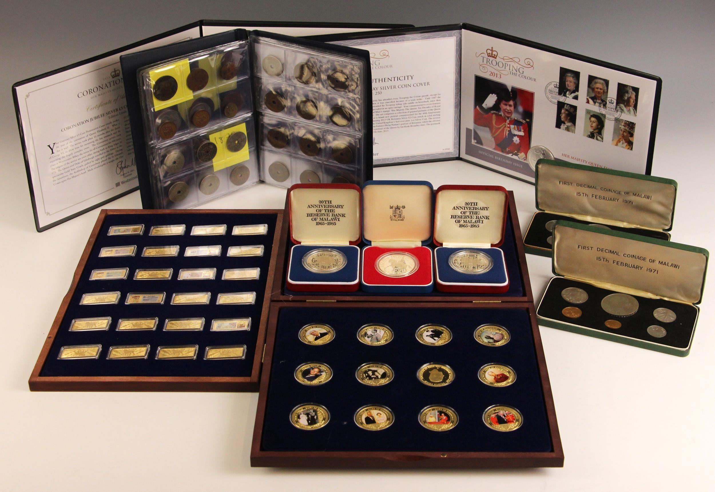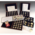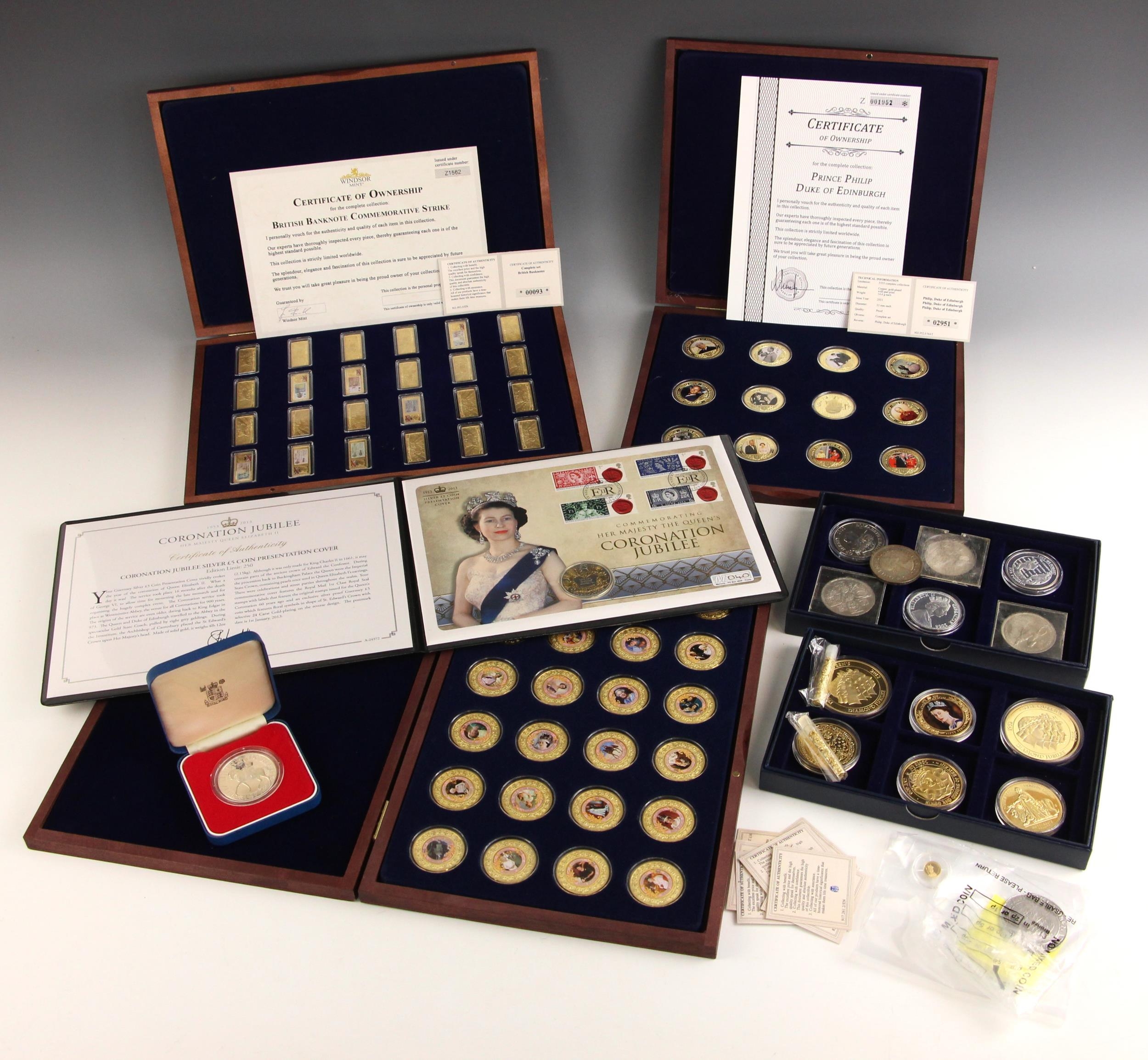 A large accumulation of British and Continental commemorative pre decimal, decimal, copper, nickel and cupro-nickel coins, to include; a 1/8th Sovereign Queen Elizabeth II Diamond Jubilee commemorative coin, the British Banknote Commemorative Strike collection, with certificate numbered Z1562, each encapsulated and within fitted case, the complete collection Prince Philip Duke of Edinburgh, with certificate, each encapsulated and within fitted case and a similar Queen Elizabeth 24 coin collection, within fitted case, along with a quantity of loose coins and folios (Qty)