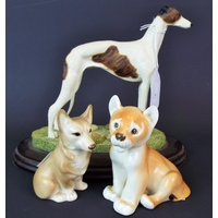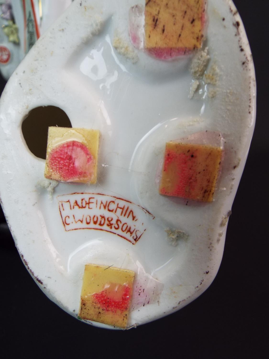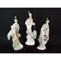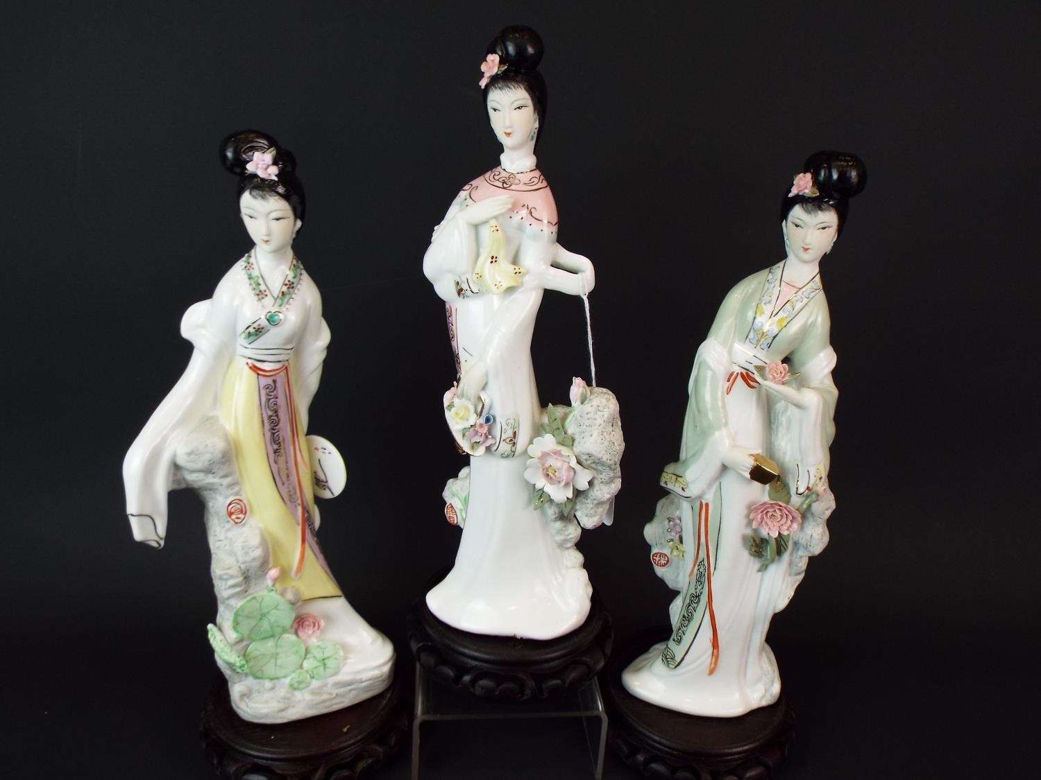 Trio of porcelain Oriental ladies. Each standing on a carved hardwood plinth. Each measures 13 inches tall and marked Wood & Son to base.