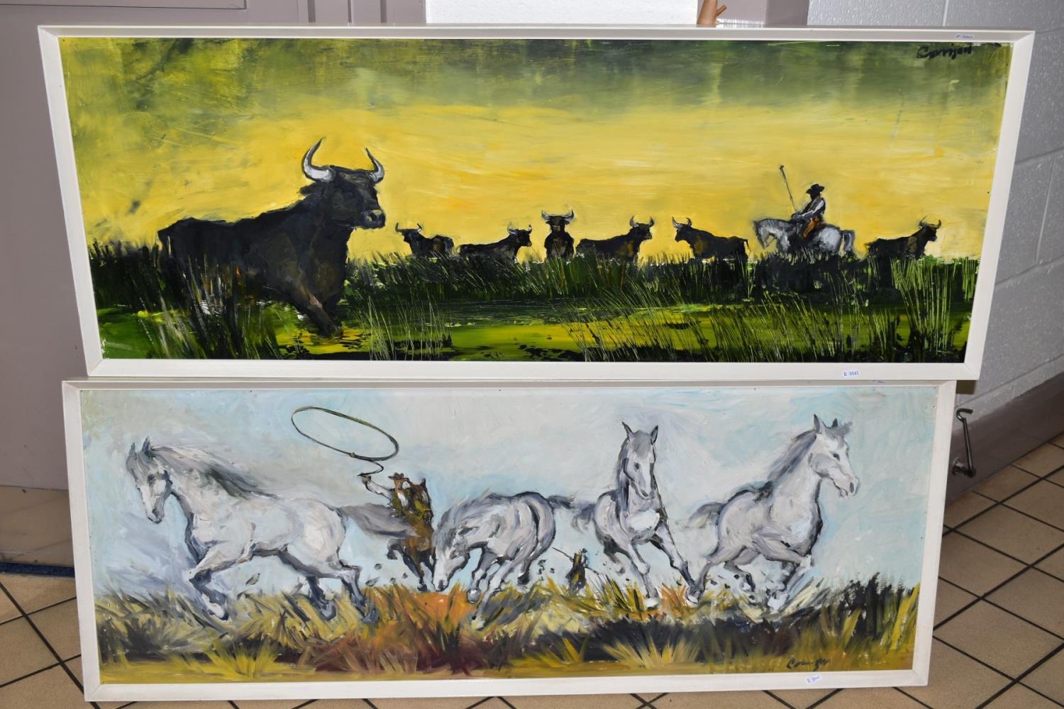 CAVAN CORRIGAN (BRITISH 1942), 'Camargue White Horses', French cowboys lassoing wild horses, signed bottom right, oil on board, framed, approximately 44cm x 120cm, together with 'Camargue Black Bulls', French cowboys rounding up wild bulls, signed top right, framed, approximately 44cm x 120cm