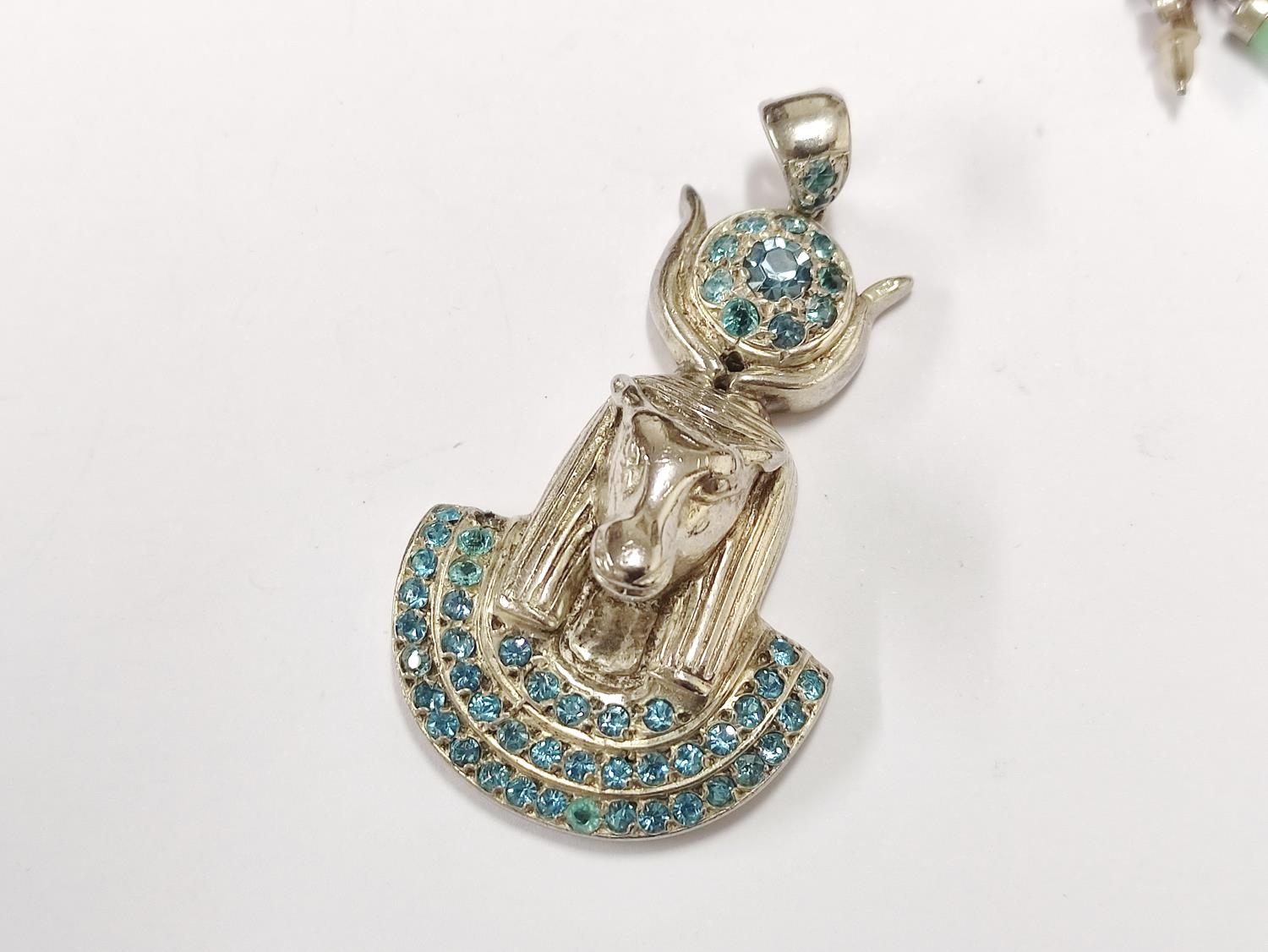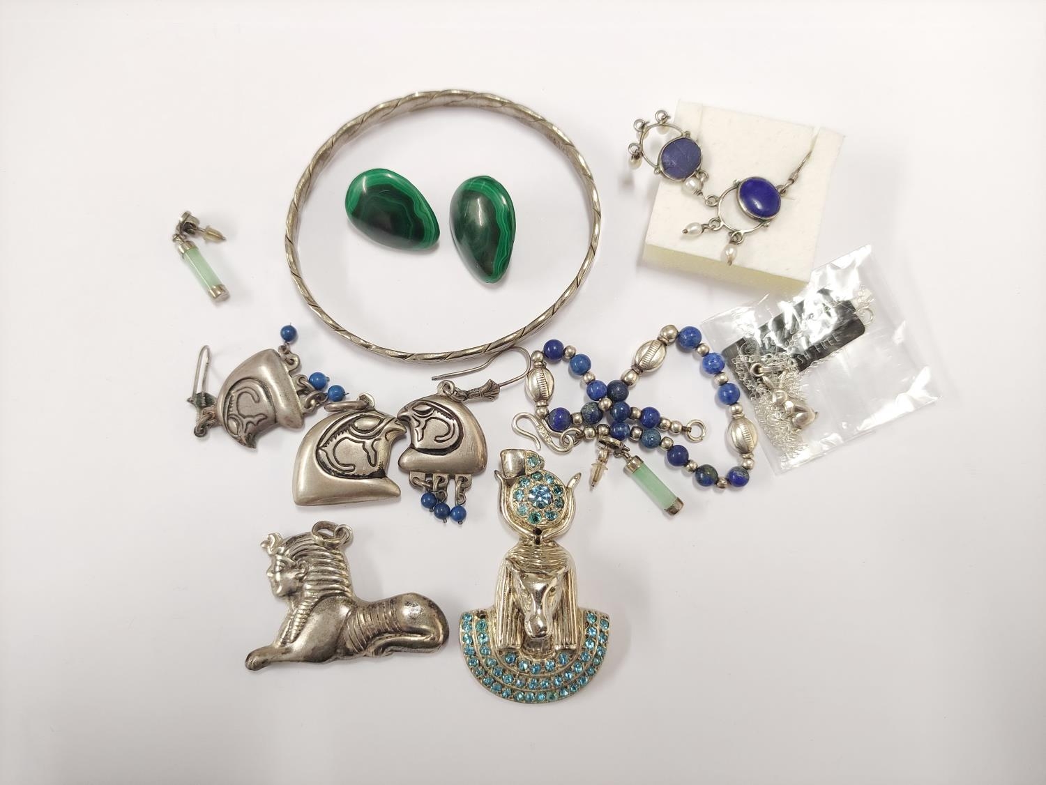 Quantity of mixed costume jewellery to include white metal Sphinx pendant, bangle, Egyptian-style pendant, earrings etc.
