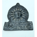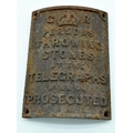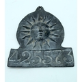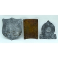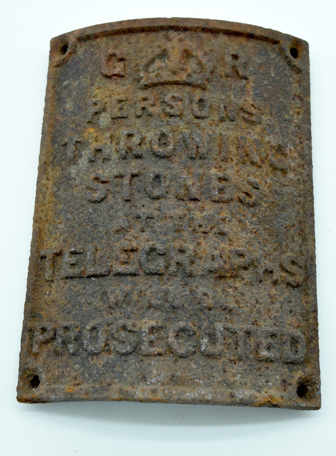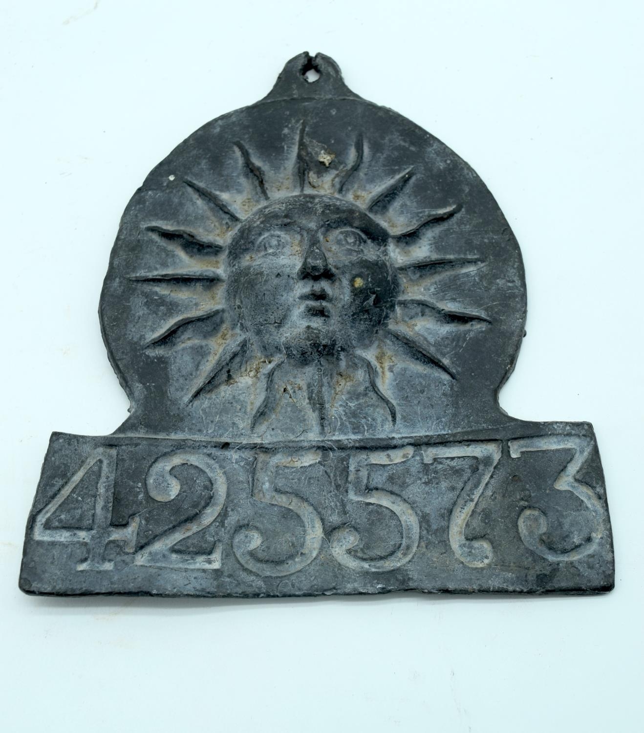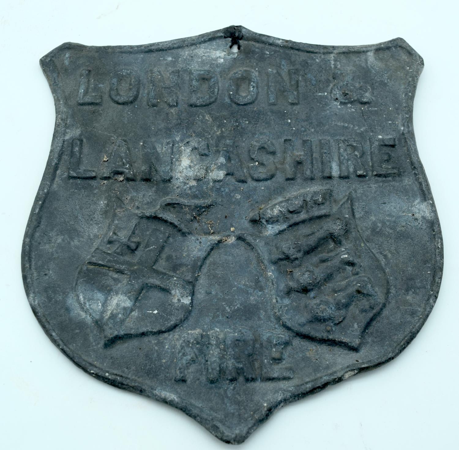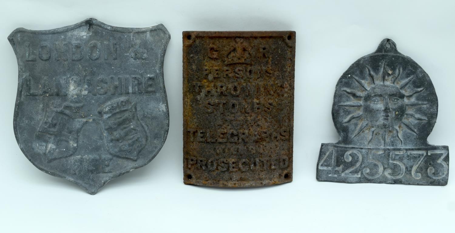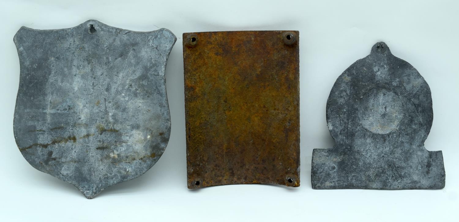 An antique London and Lancashire Fire Insurance lead plaque together with another lead plaque and cast iron plaque from a telegraph pole. 23 x21cm (3).