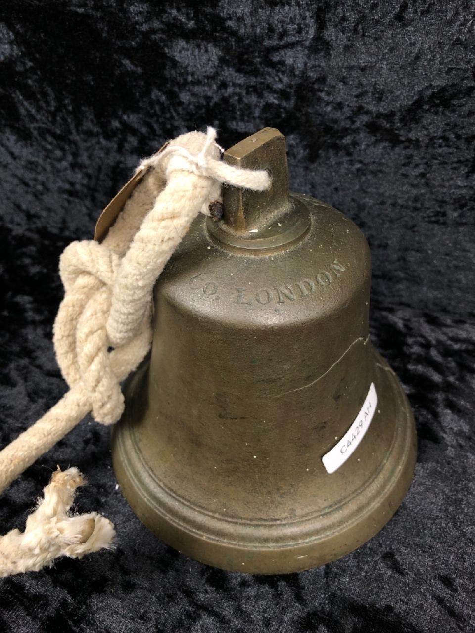 Old Mears & Co London bell - filled with cement and converted to a door stop. Crack to bell. Approx H14cm.