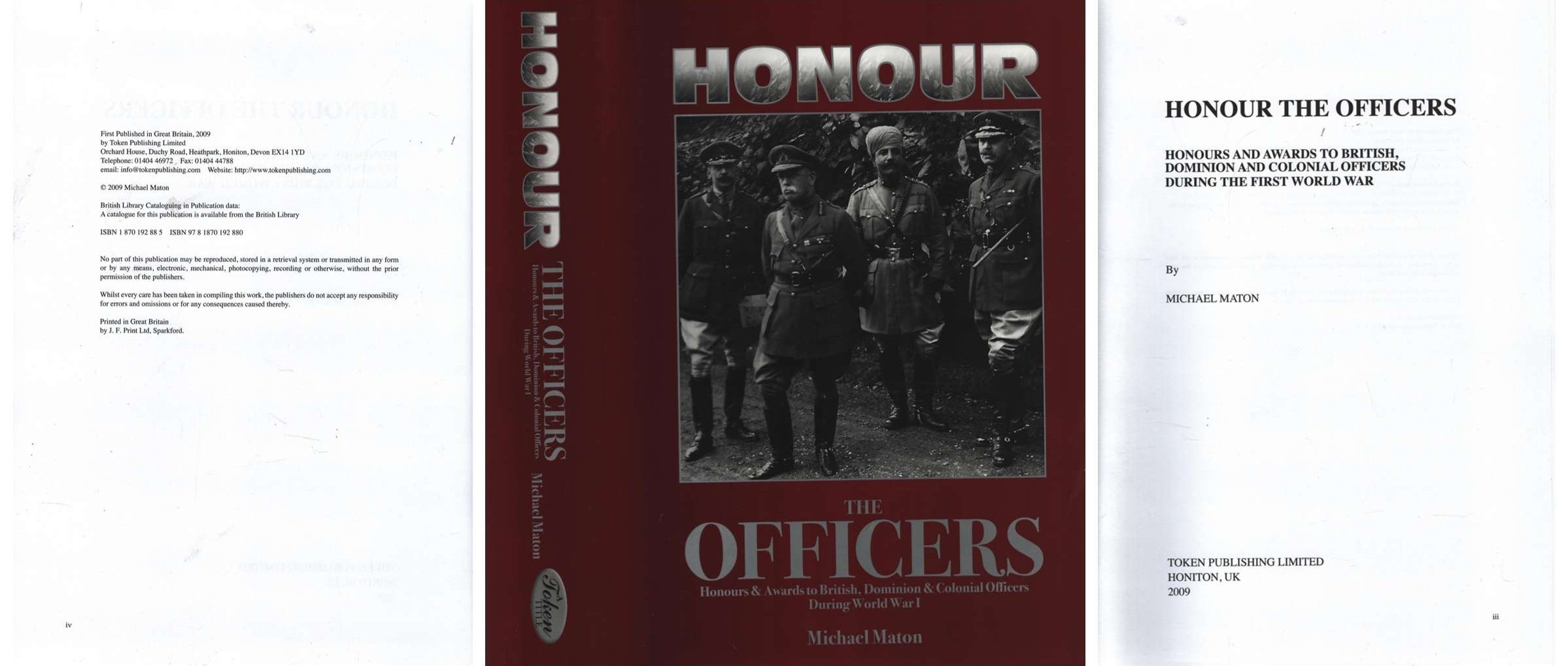 Honour the Officers Honours and Awards to British Dominion and Colonial Officers During the First World War Hardback Book. Author: Michael Maton. Publisher: Token. Published: 2009.