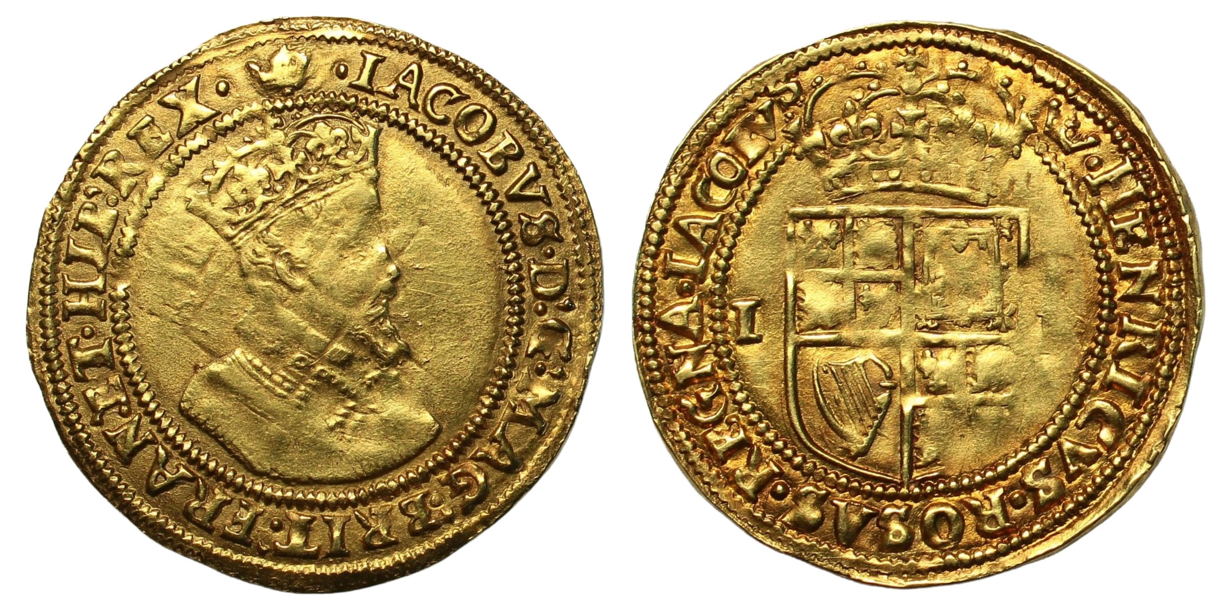 James I (1603-1625) Double Crown Second coinage, fourth crowned bust right, rev. crowned shield dividing IR, mm.coronet over grapes/coronet, 4.89g, (SCBC 2622, N.2087). Flipped in the die and showing traces of the shield on the portrait, otherwise a neat round coin and nearly very fine