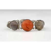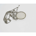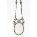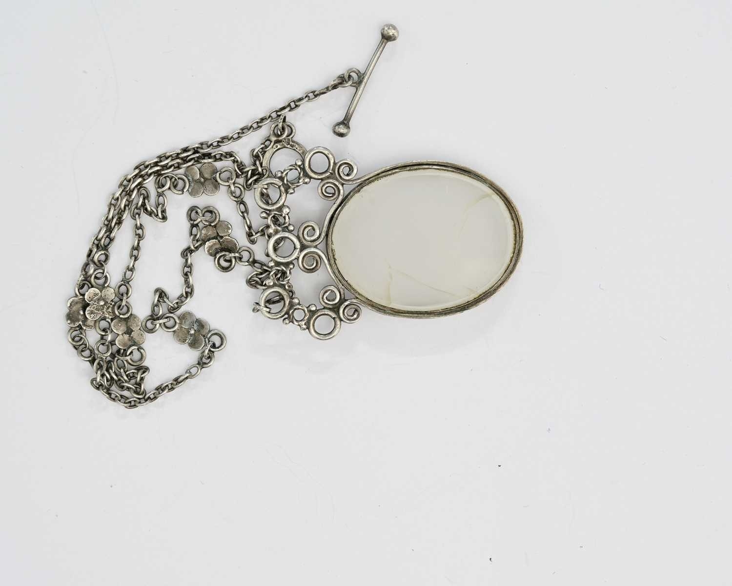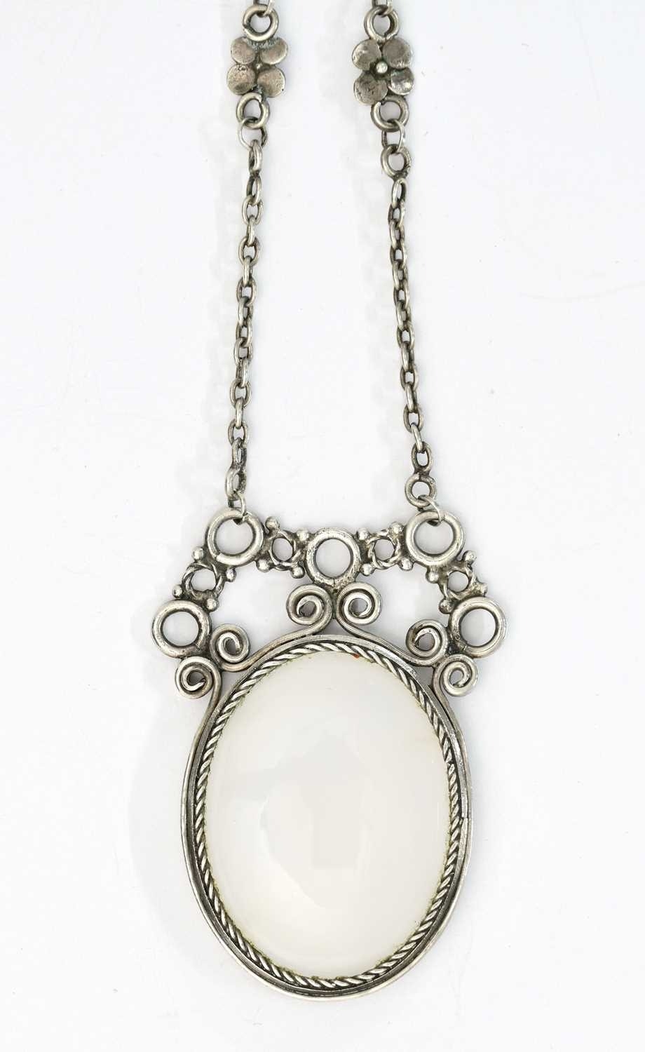 An Arts and Crafts silver and agate necklace, the central polished oval stone within a ropetwist frame, surmounted by coiled wire and conjoined ring, suspended on quatrefoil and round link chains, 5cmm 43.5cm long, 16.7g