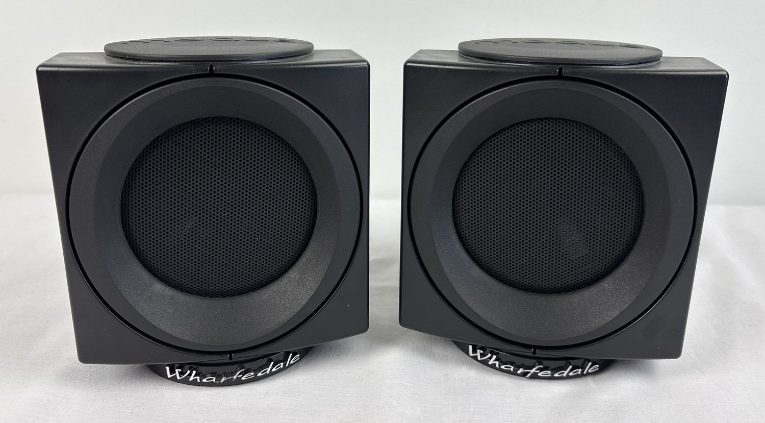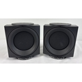 A pair of Wharfedale Modus surround sound bookshelf cube speakers, in black. Each approx. 16cm tall.