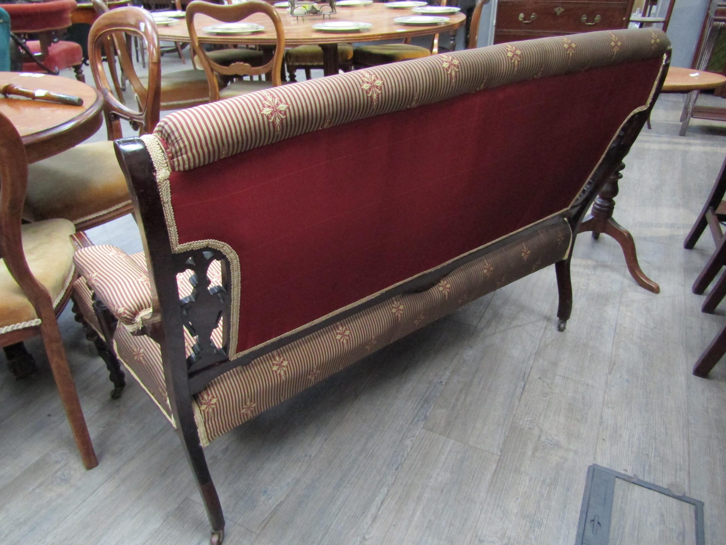 An Edwardian mahogany satinwood inlaid sofa with overstuffed striped silk upholstery, on turned supports to castors, 125cm long, 87cm tall (R) £150