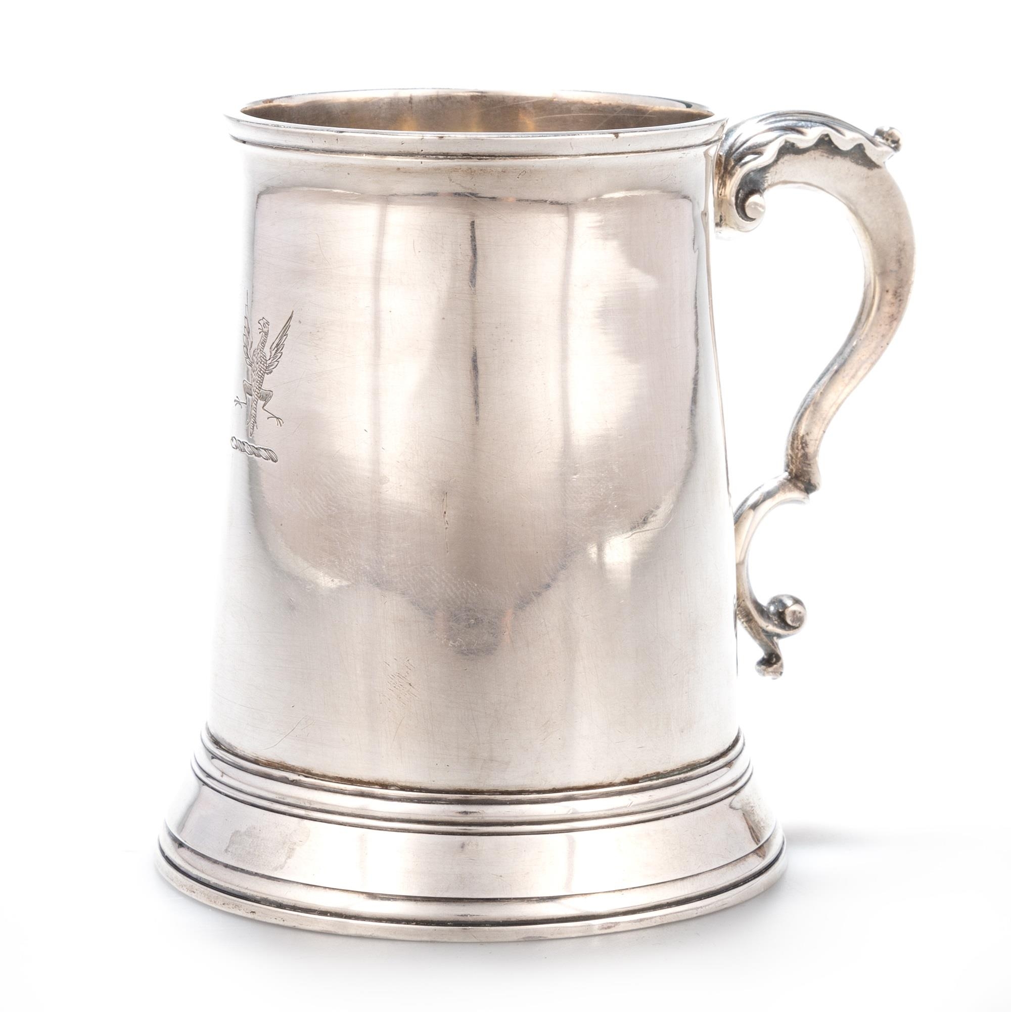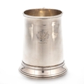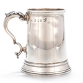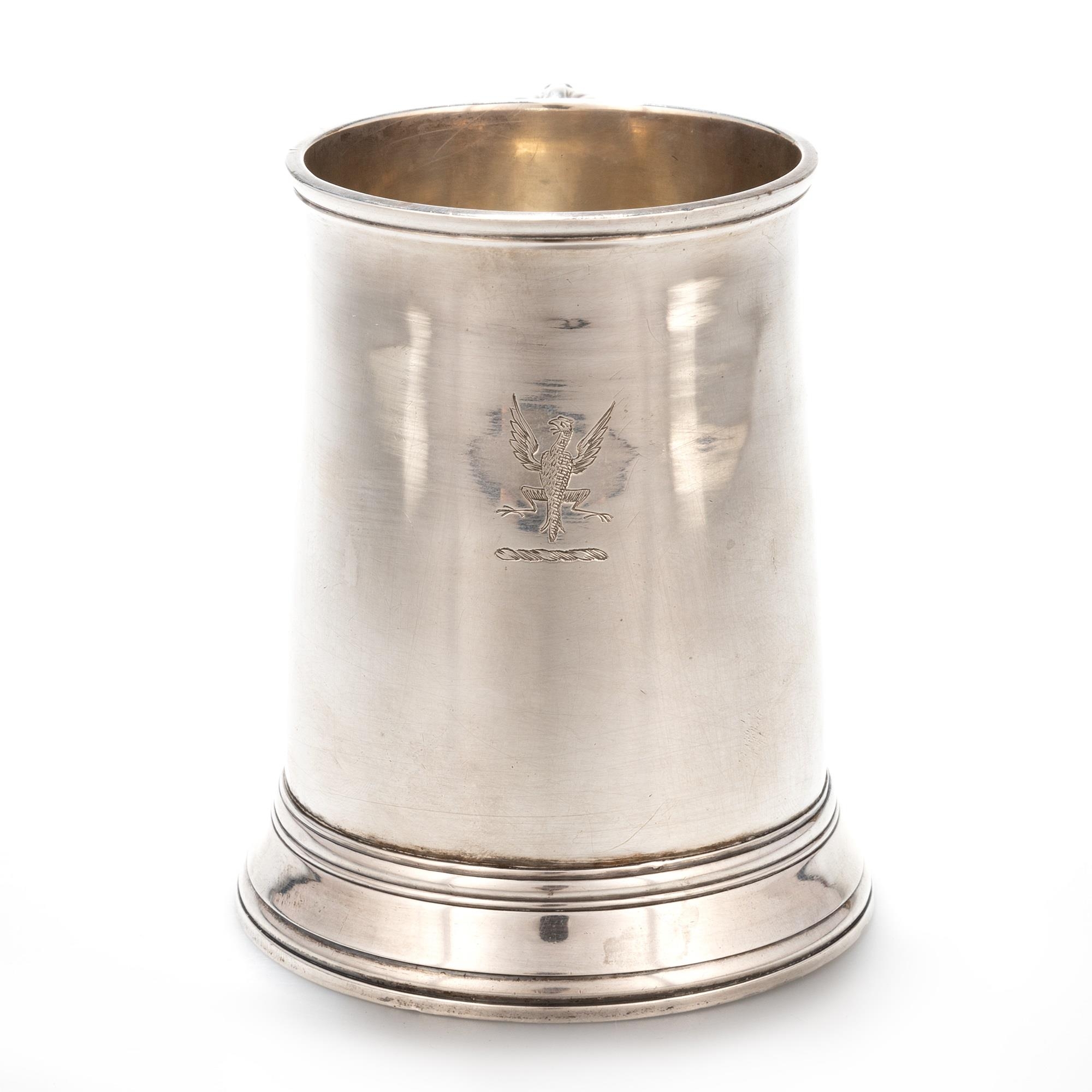 by Hester Bateman, London 1786, of straight-sided tapering form with high foot, the S-scroll handle with leaf-form thumbpiece, engraved with a crest. 10.5cm high, 7.7 troy ounces