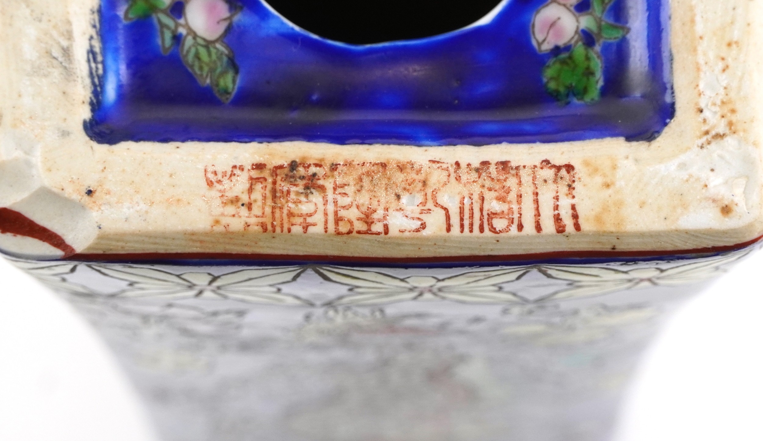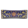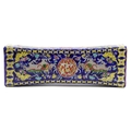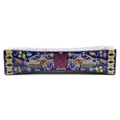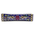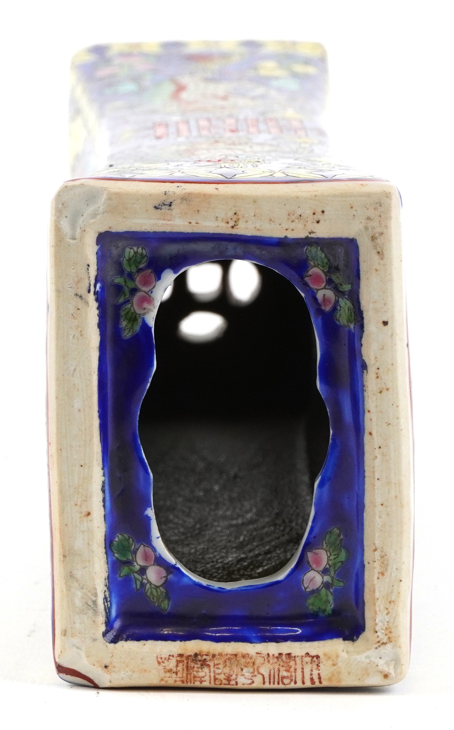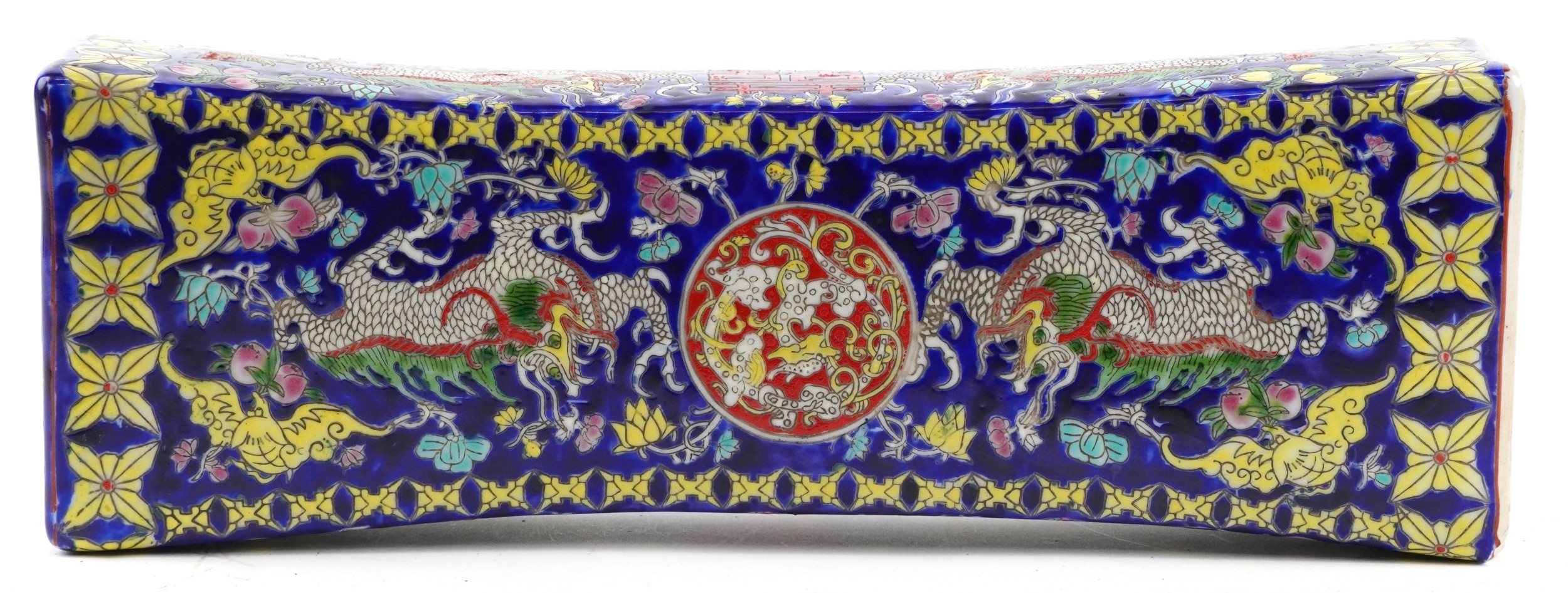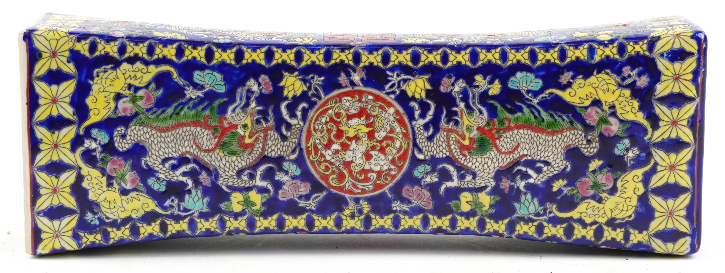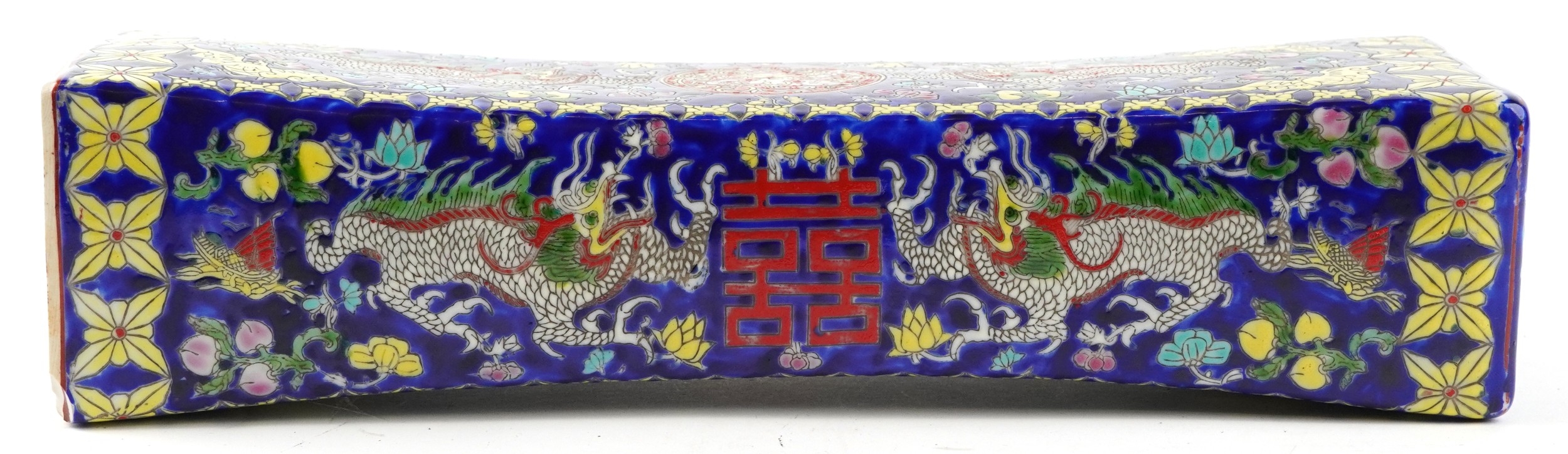 A Chinese porcelain opium pillow finely hand painted with dragons and scrolling foliage, character marks to the base, 34cm wide.