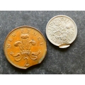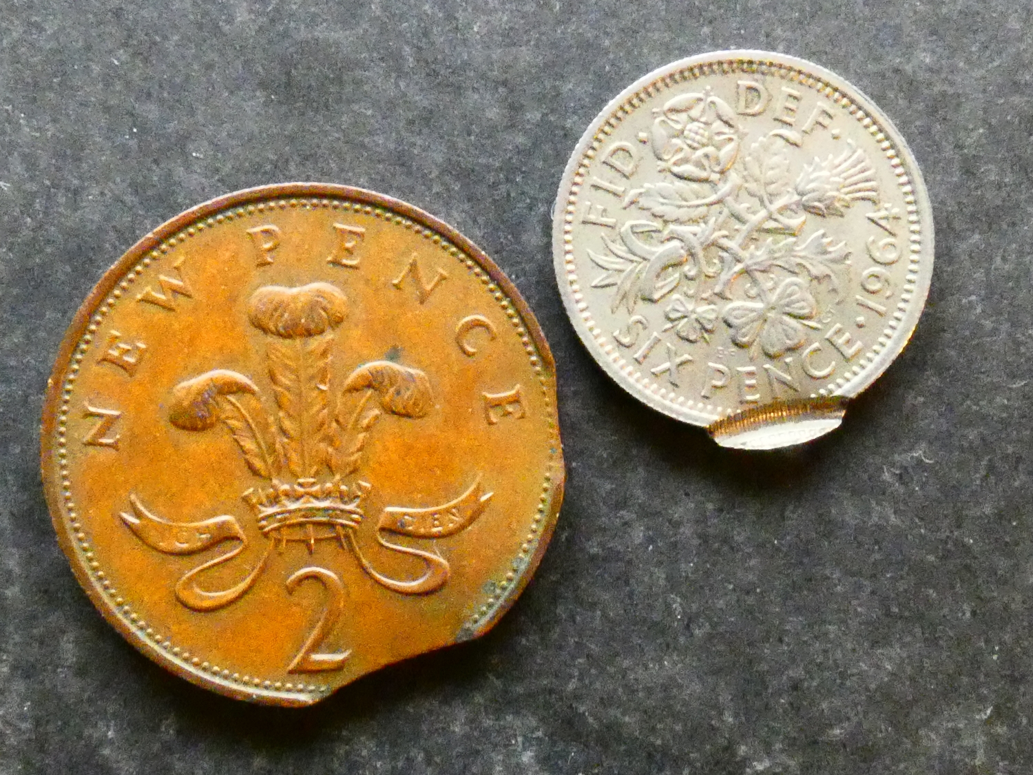 COIN. United Kingdom, Elizabeth II (1952-2022), minting errors; copper-nickel Sixpence, 1964, S-4149, offset double strike, VF, together with bronze 2 New Pence, 1971, S-C1, exhibiting two small flan clips, VF (2)