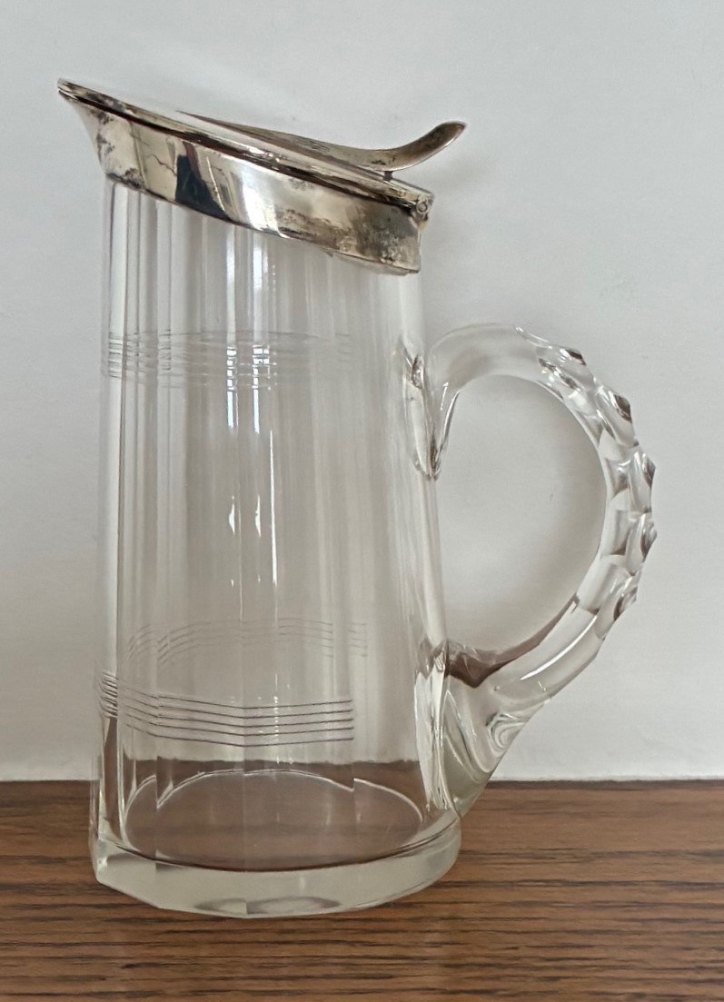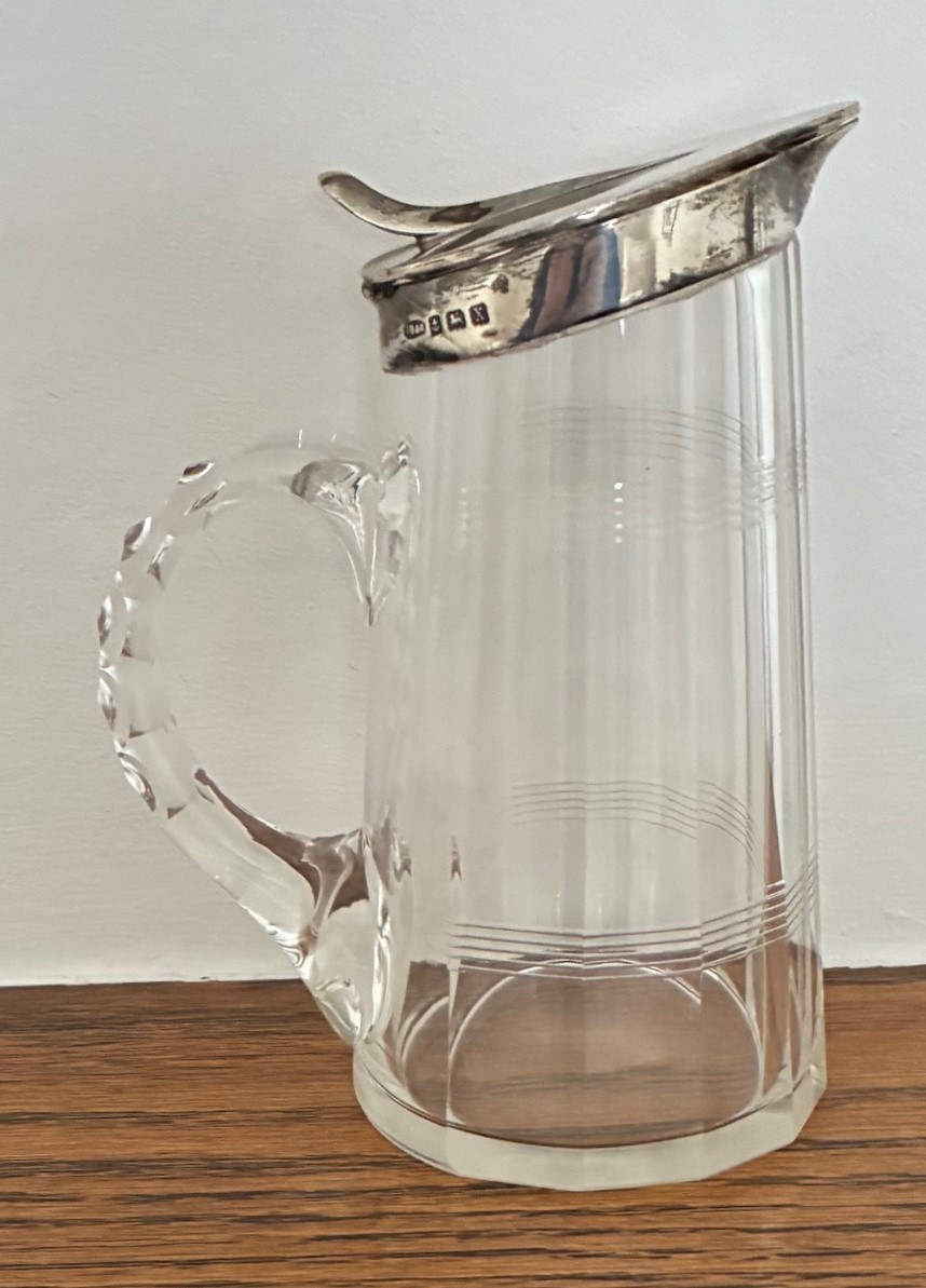 Silver mounted glass whisky toddy or water jug, Birmingham 1...