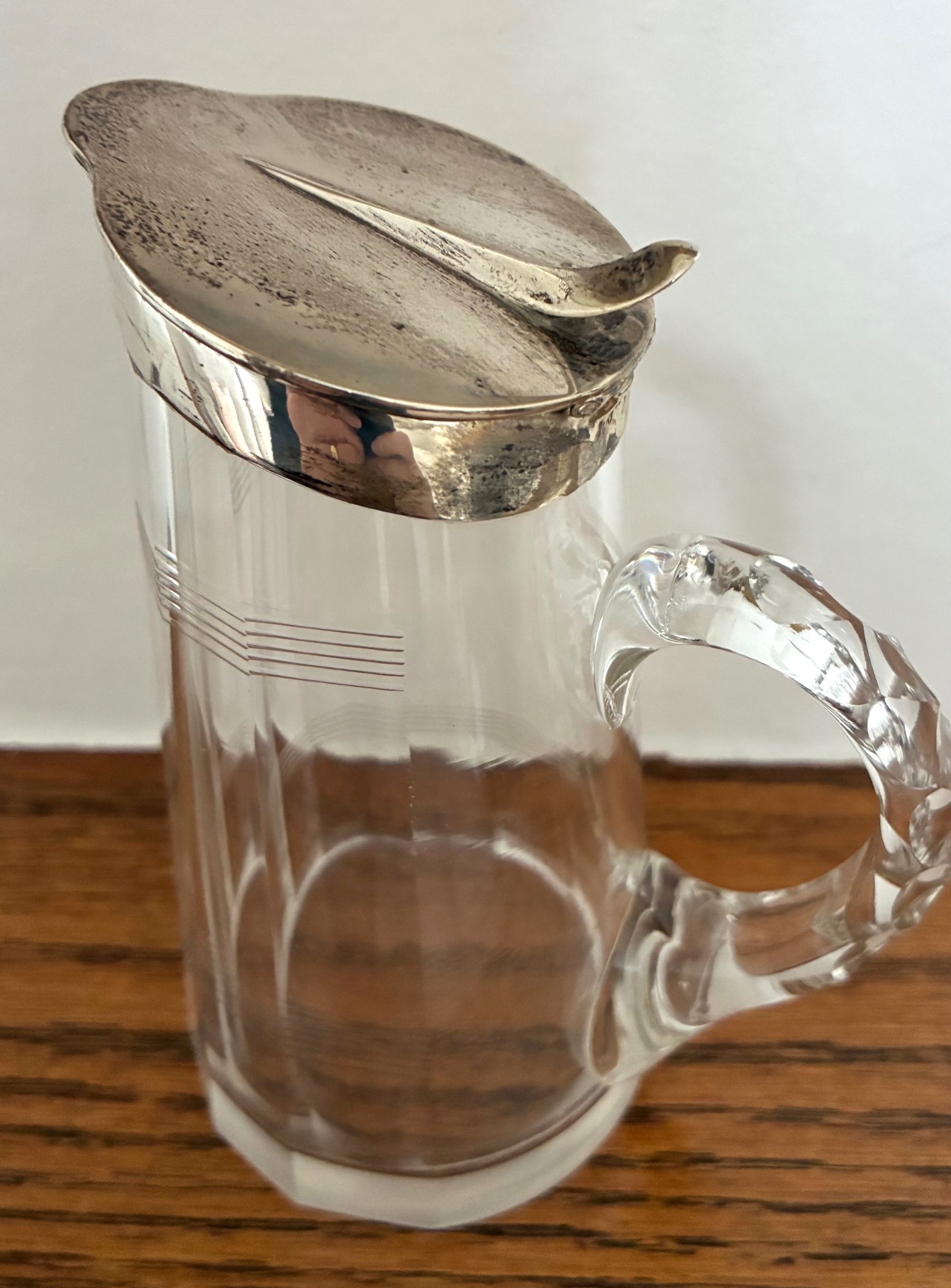 Silver mounted glass whisky toddy or water jug, Birmingham 1922 by J. Gloster, with halmarked and hinged silver lid above the hallmarked collar, hexagonal conical jug, and facet cut handle, 14cm high.