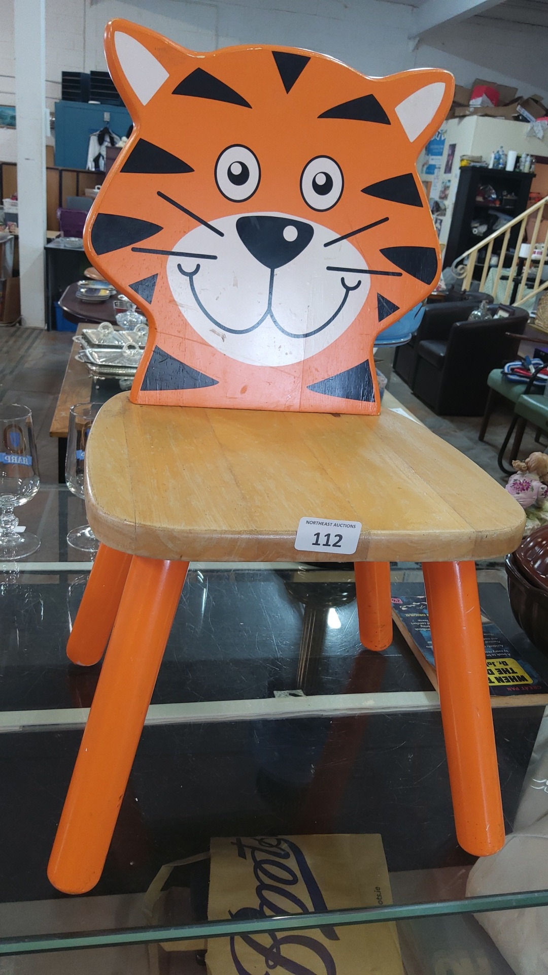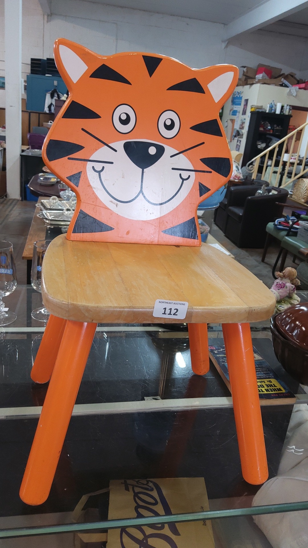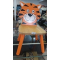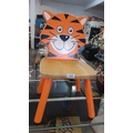 Children’s painted wooden chair with tiger-form back splat, natural wood seat, and splayed cylindrical legs in orange finish; the cartoon face with striped decoration in orange, black, and white.