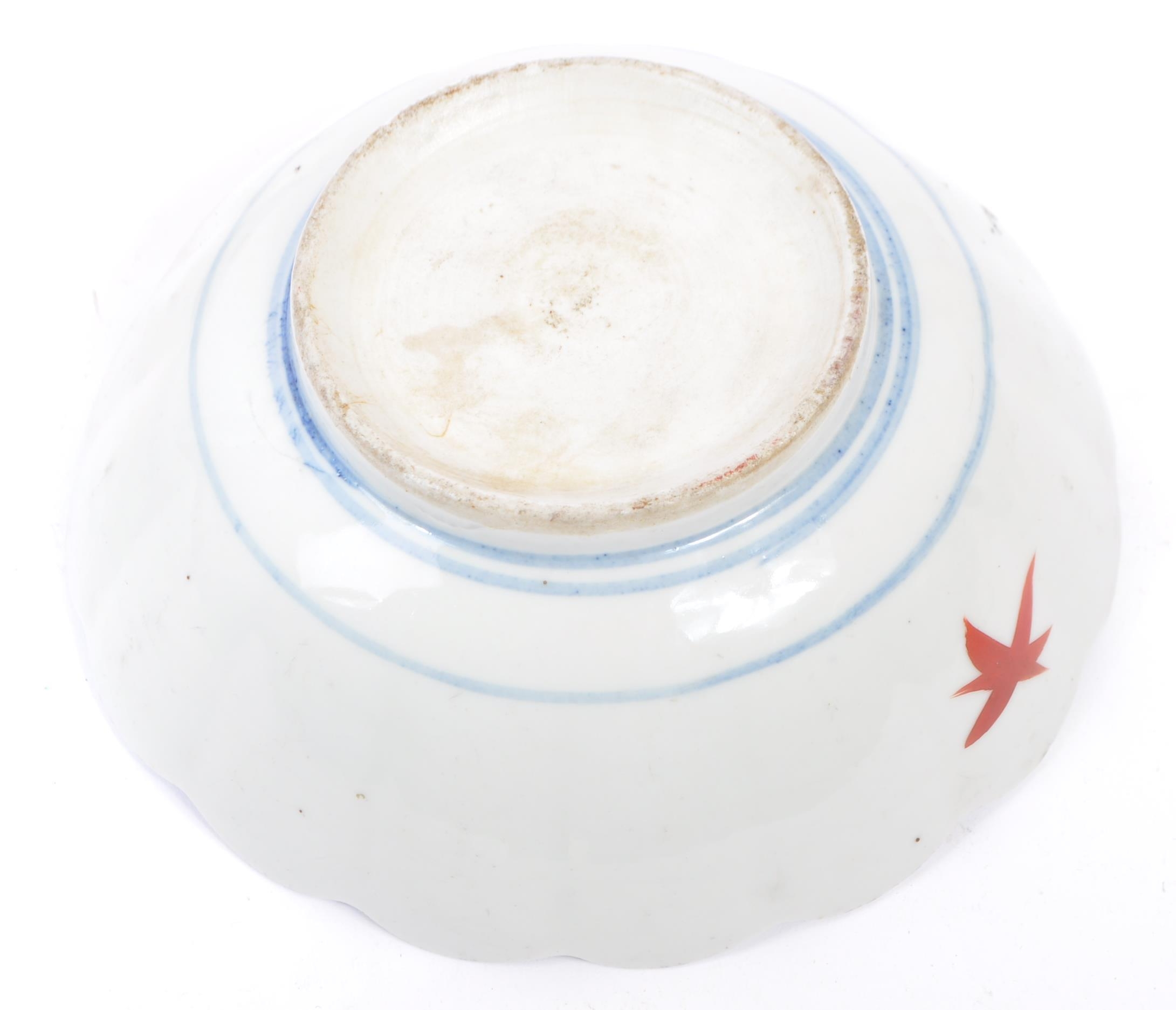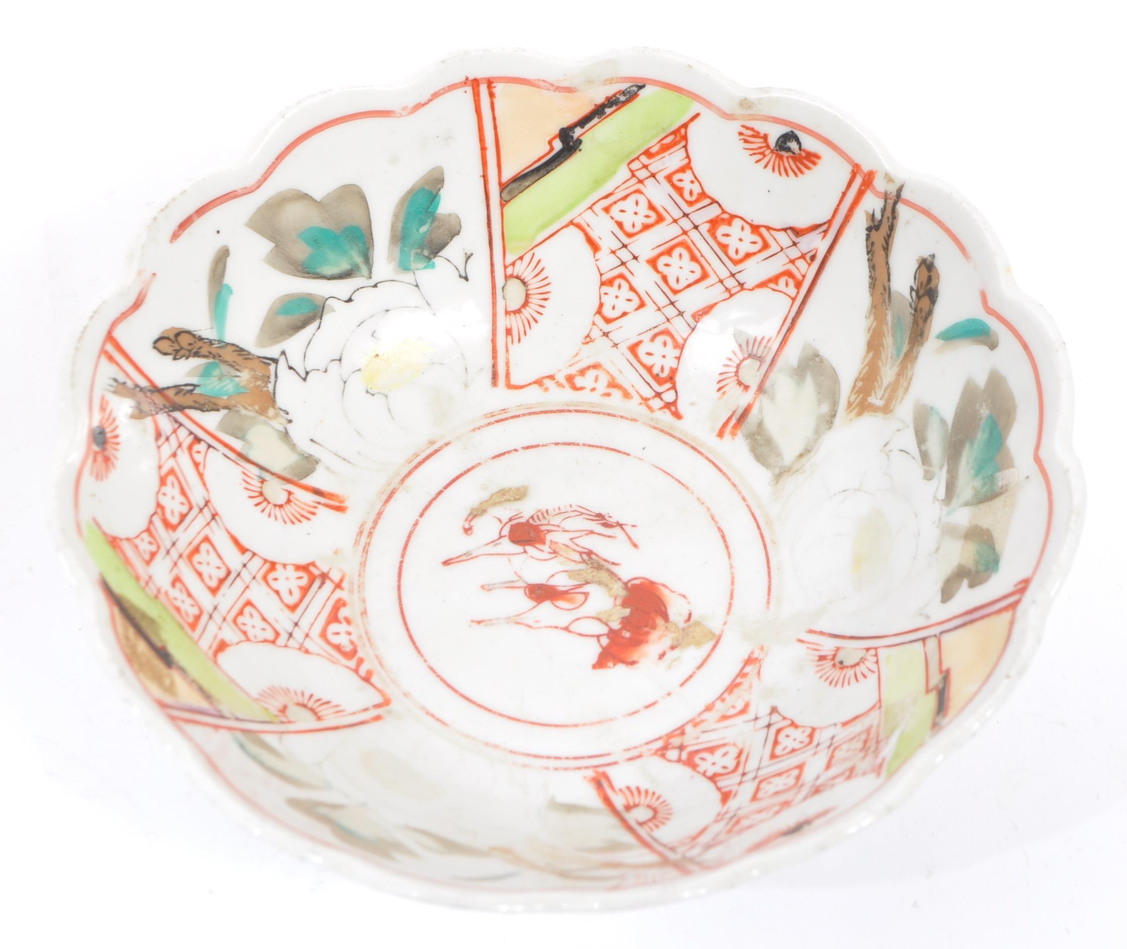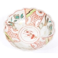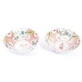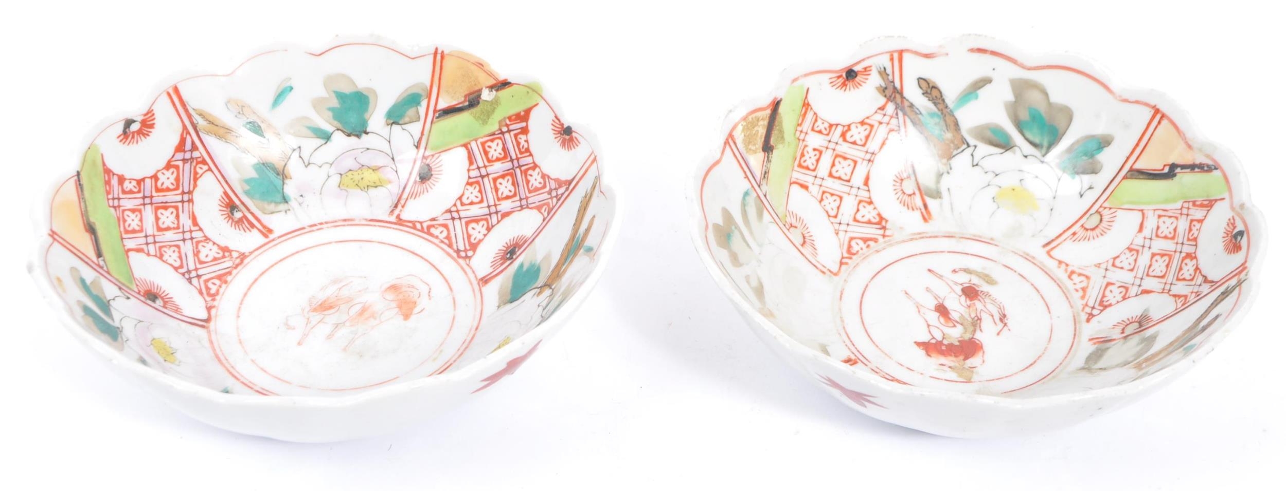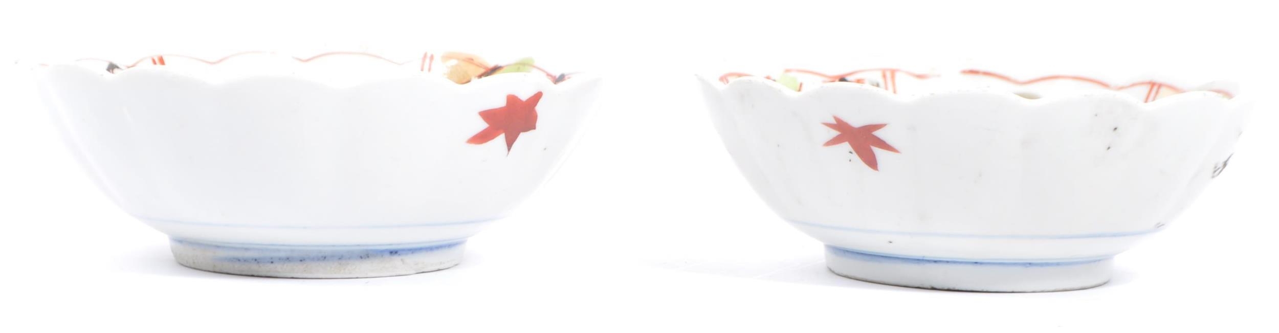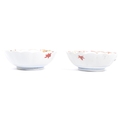 A pair of early 20th century Chinese bowls with floral shaped rims, featuring six segments of pattern with a central cow motif. White ground with pink lotus in three segments and a geometric red poppy pattern in three segments; featuring two red flowers to outside. Unmarked to base. Measures approx. 17.5cm in diameter.