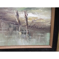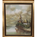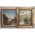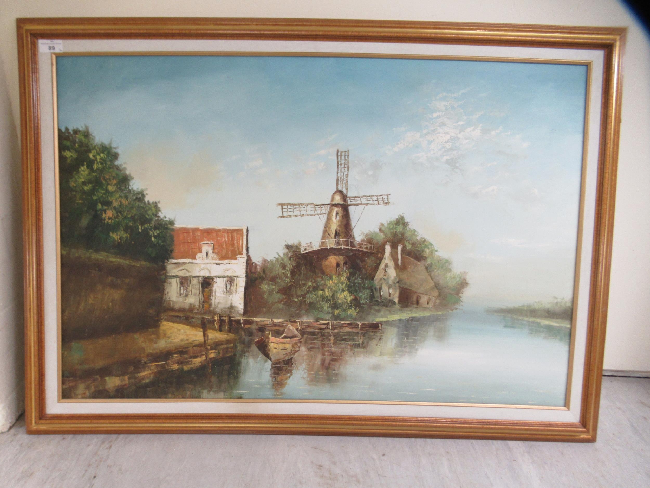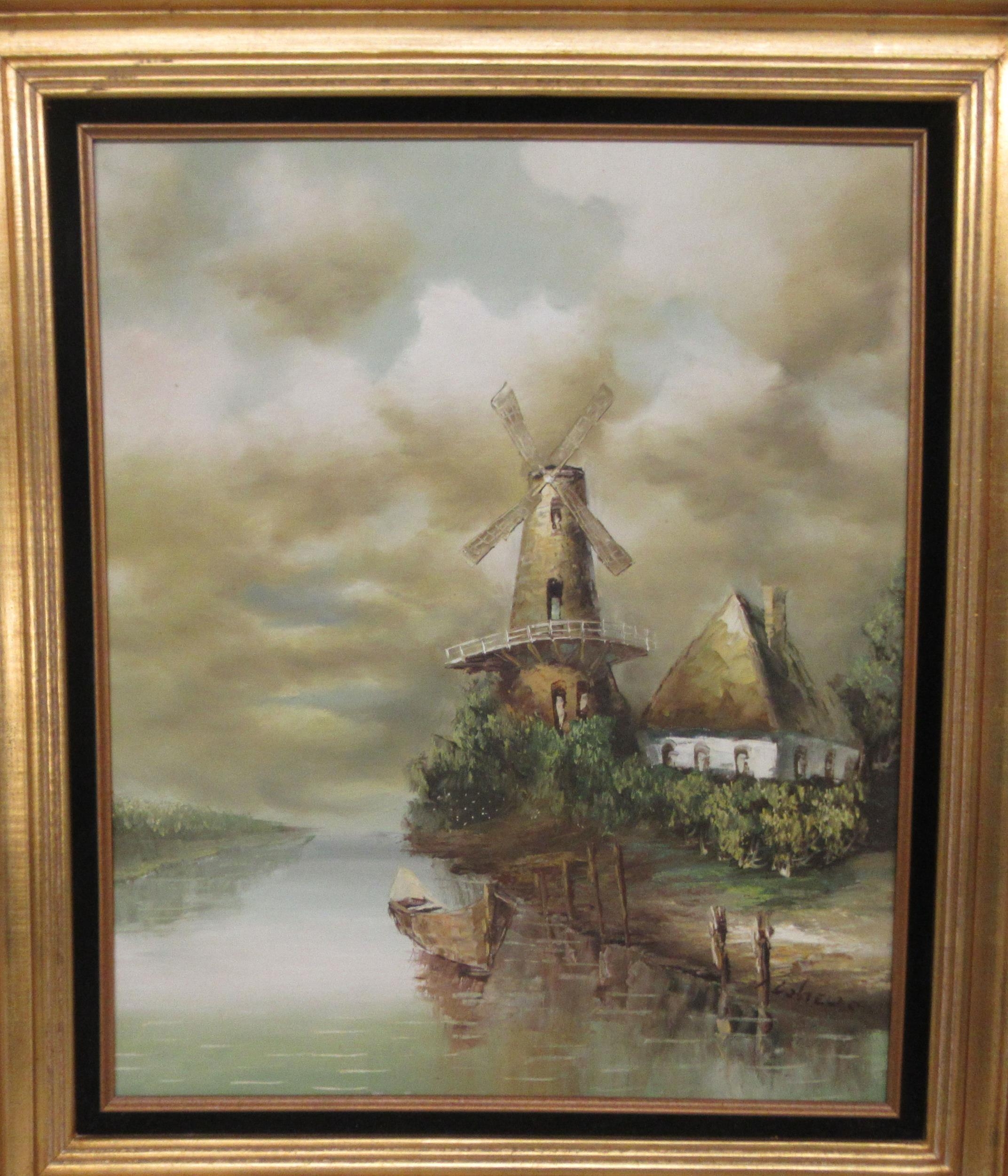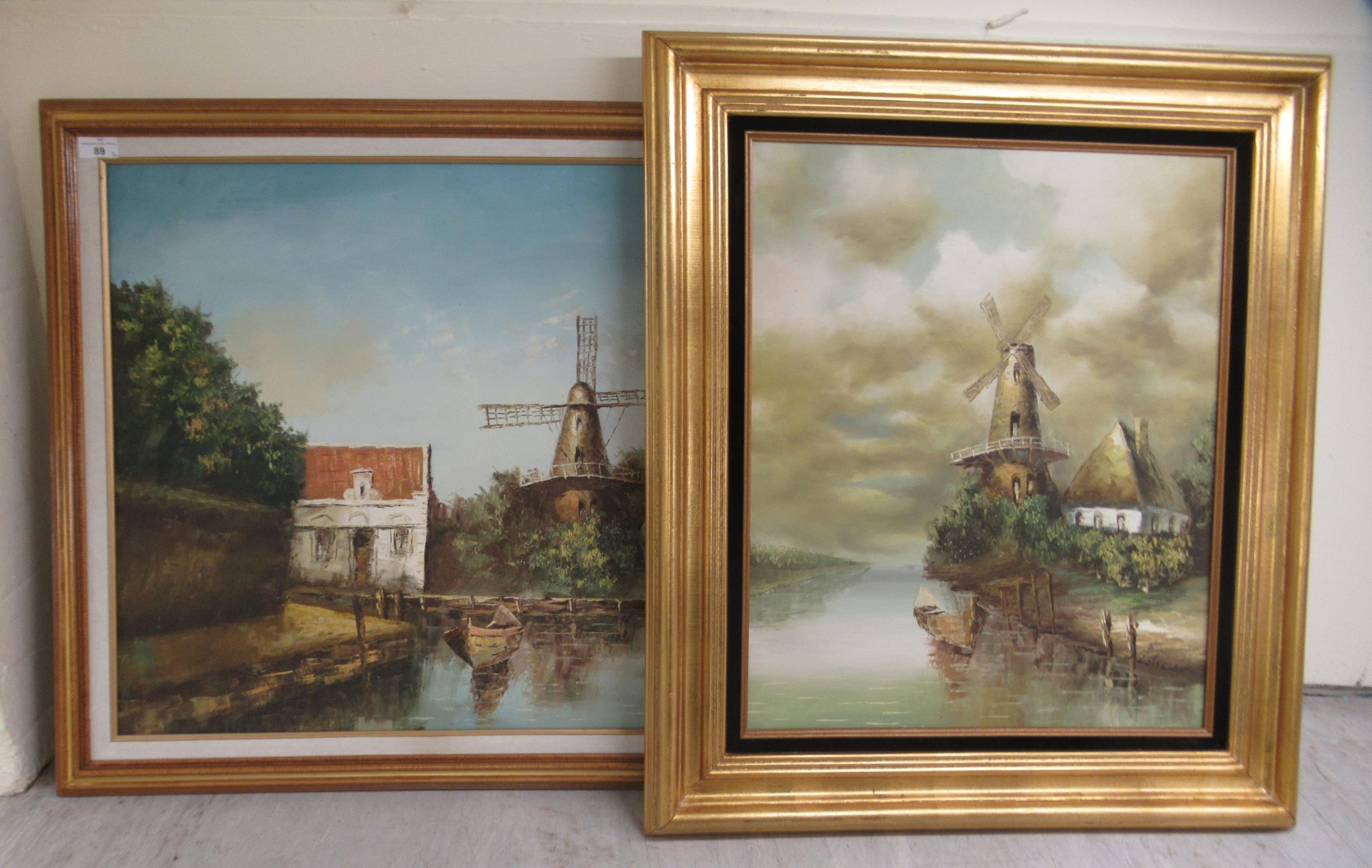 20thC Continental School - a windmill beside still water oil on canvas 23" x 25" framed; and another similar, the same subject bears an indistinct signature 23" x 19" framed