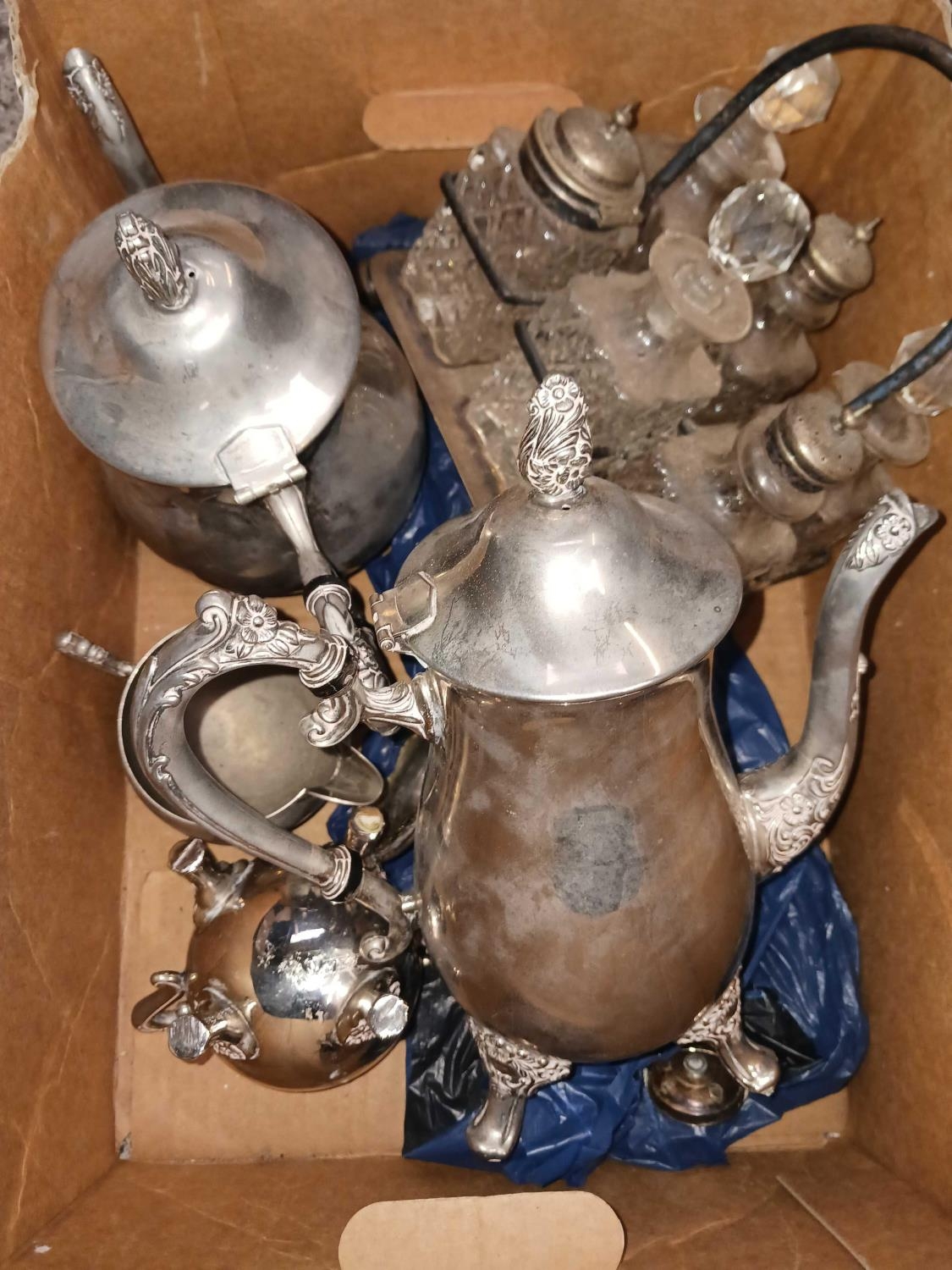 CARTON OF MISC PLATEDWARE INCL; WATER POTS & A CRUET