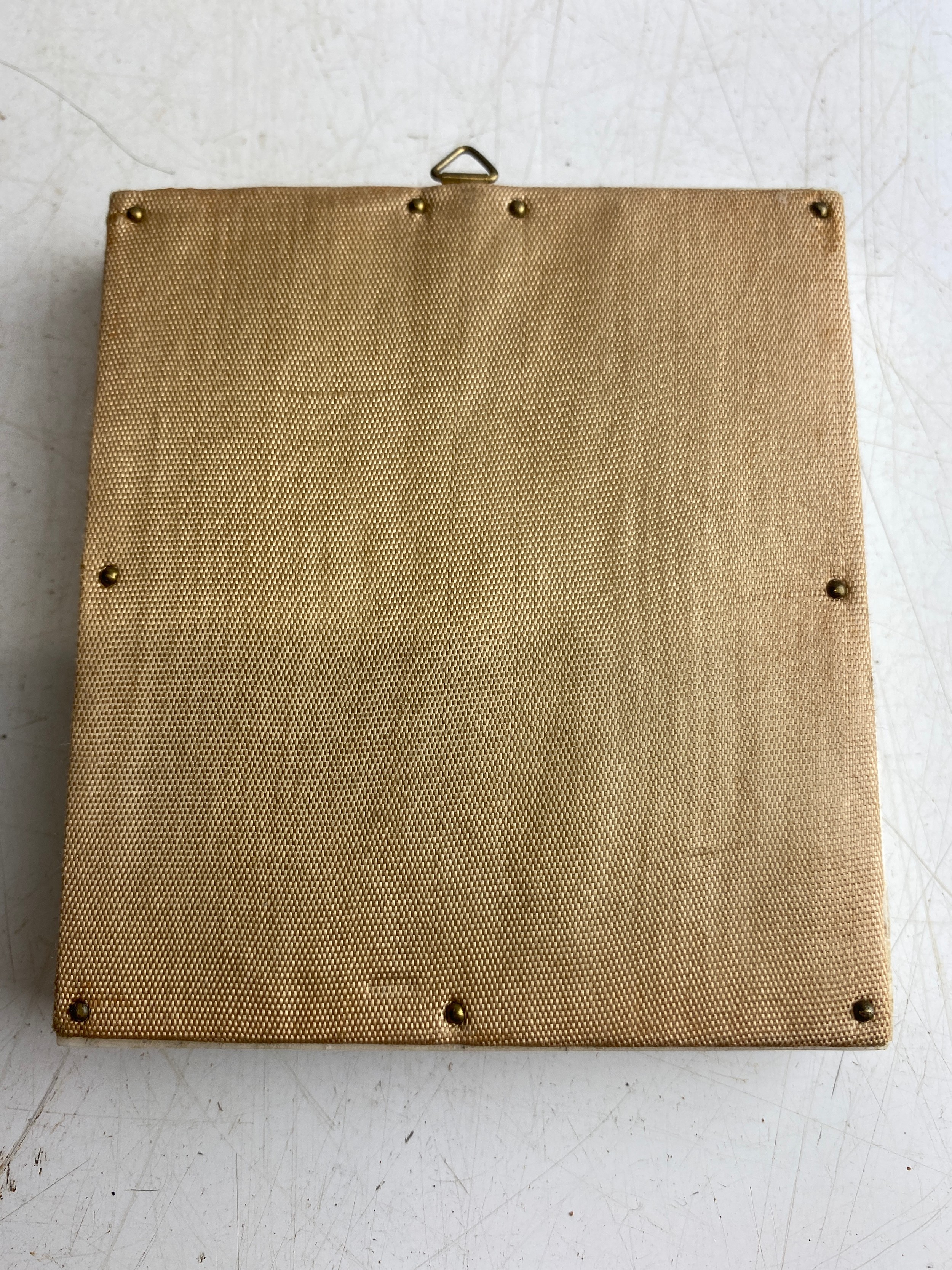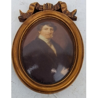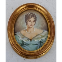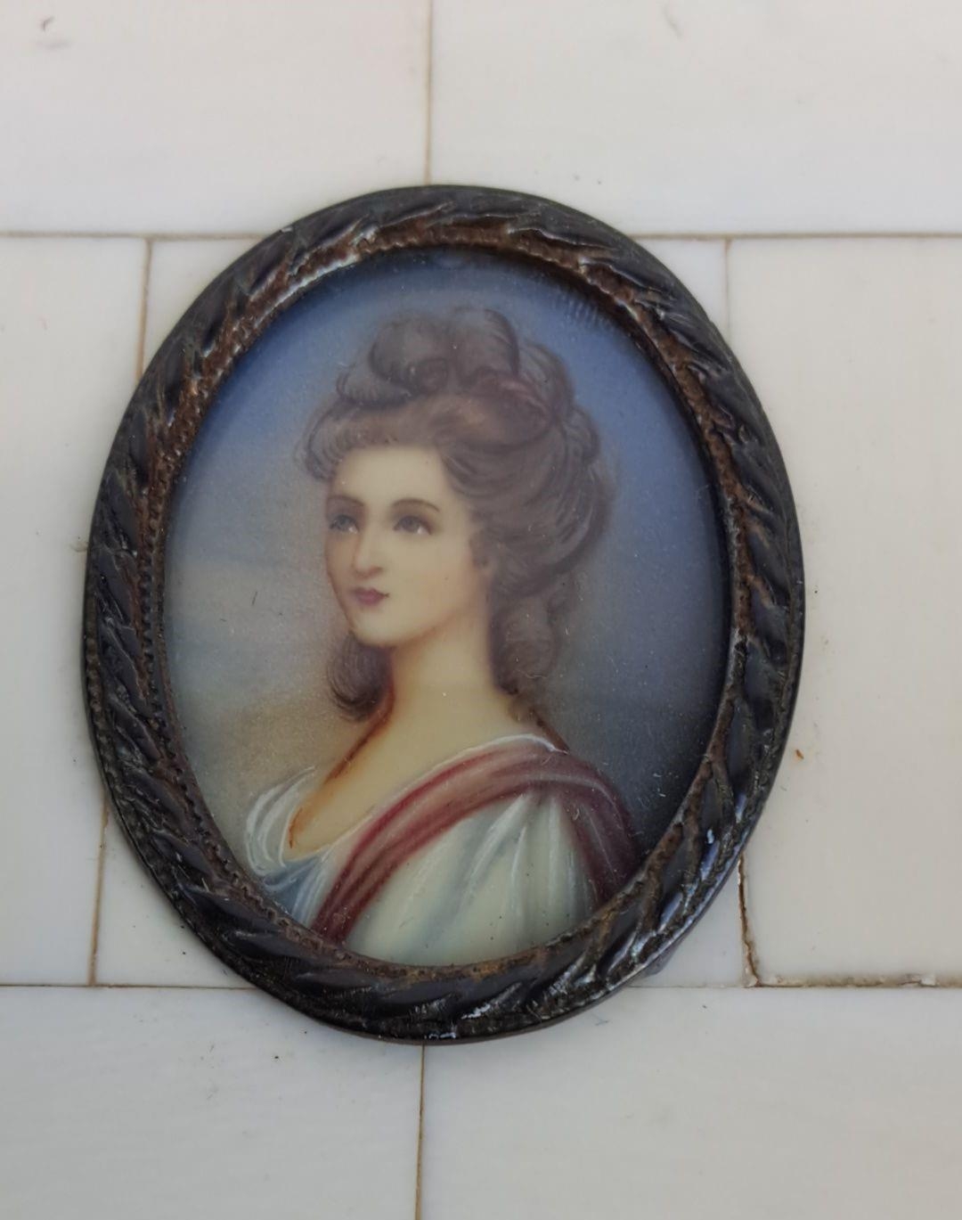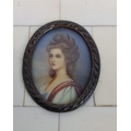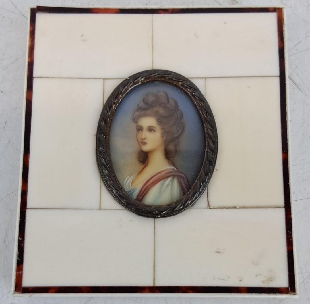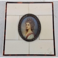 Antique miniature hand painted on porcelain portrait of a Georgian lady, framed in an bone and metal bordered panel, measuring 8cm x 9cm.