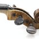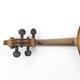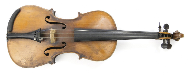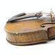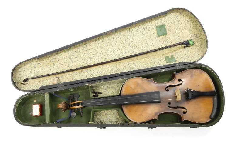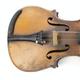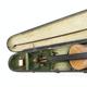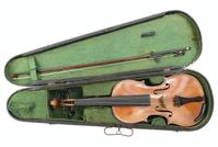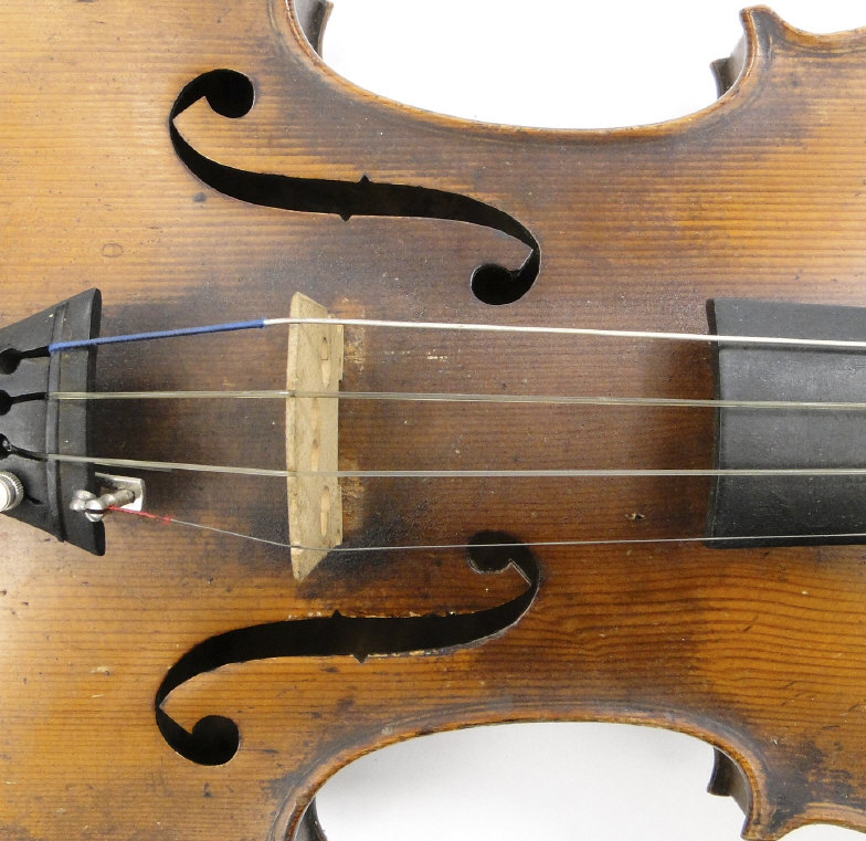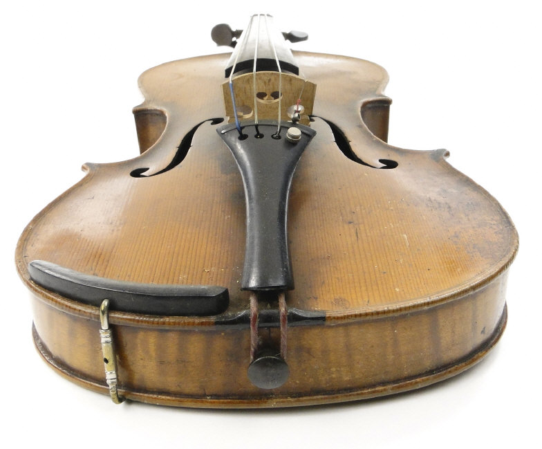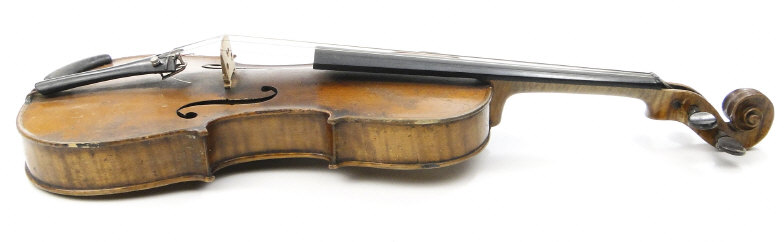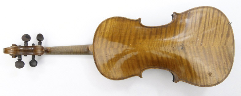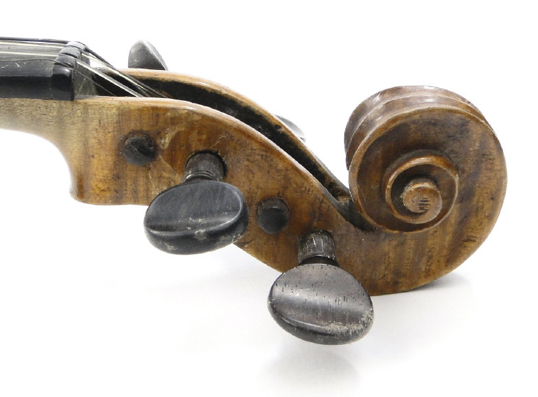 Old wooden violin with two piece back and ebonised fittings, bearing a paper label to the interior printed Nikolaus Amali, together with a mother of pearl inlaid bow and wooden case, the violin body 36cm in length