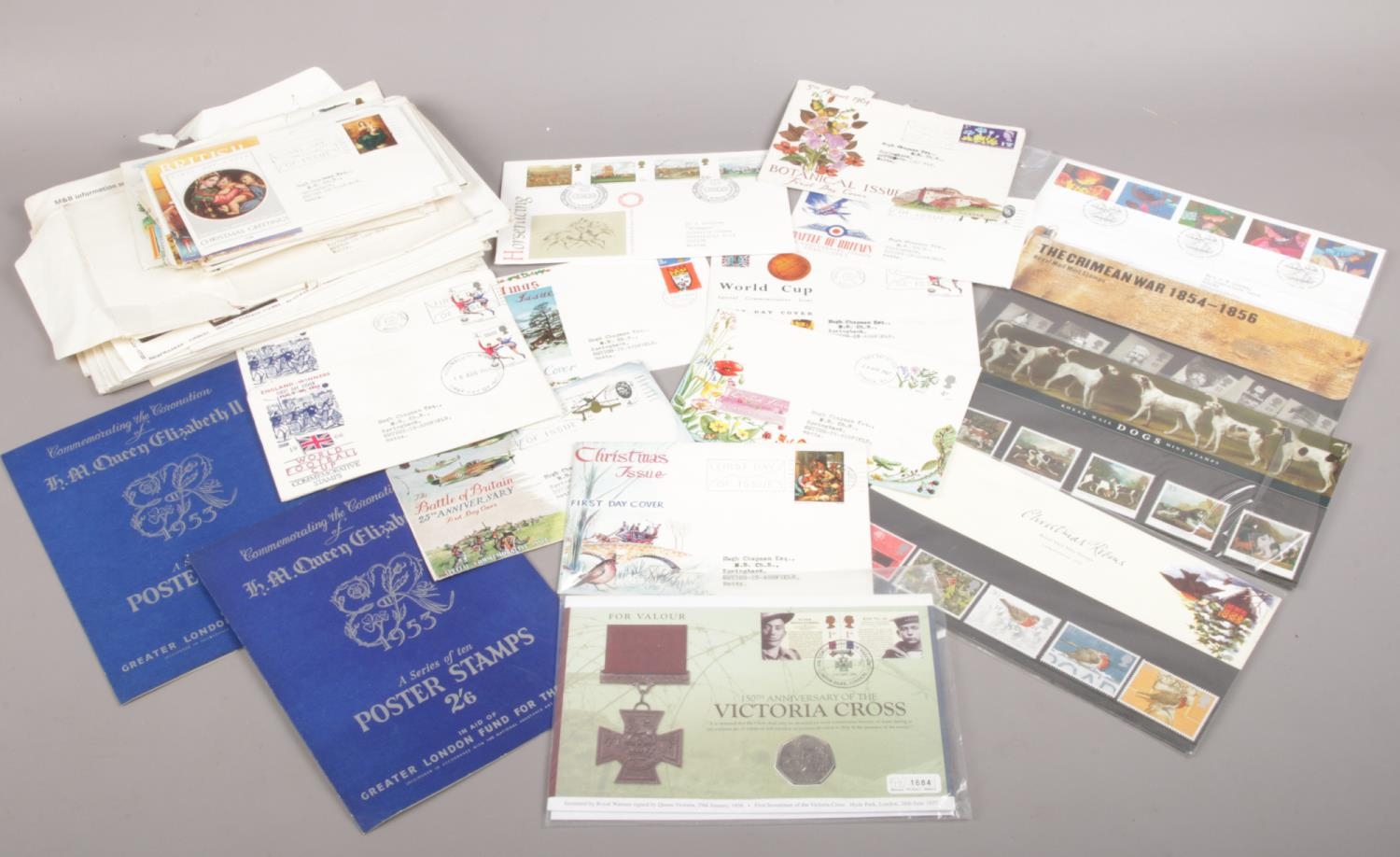 A collection of British & World stamps/first day covers. To include a commemorative Victoria cross coin and stamp set.