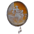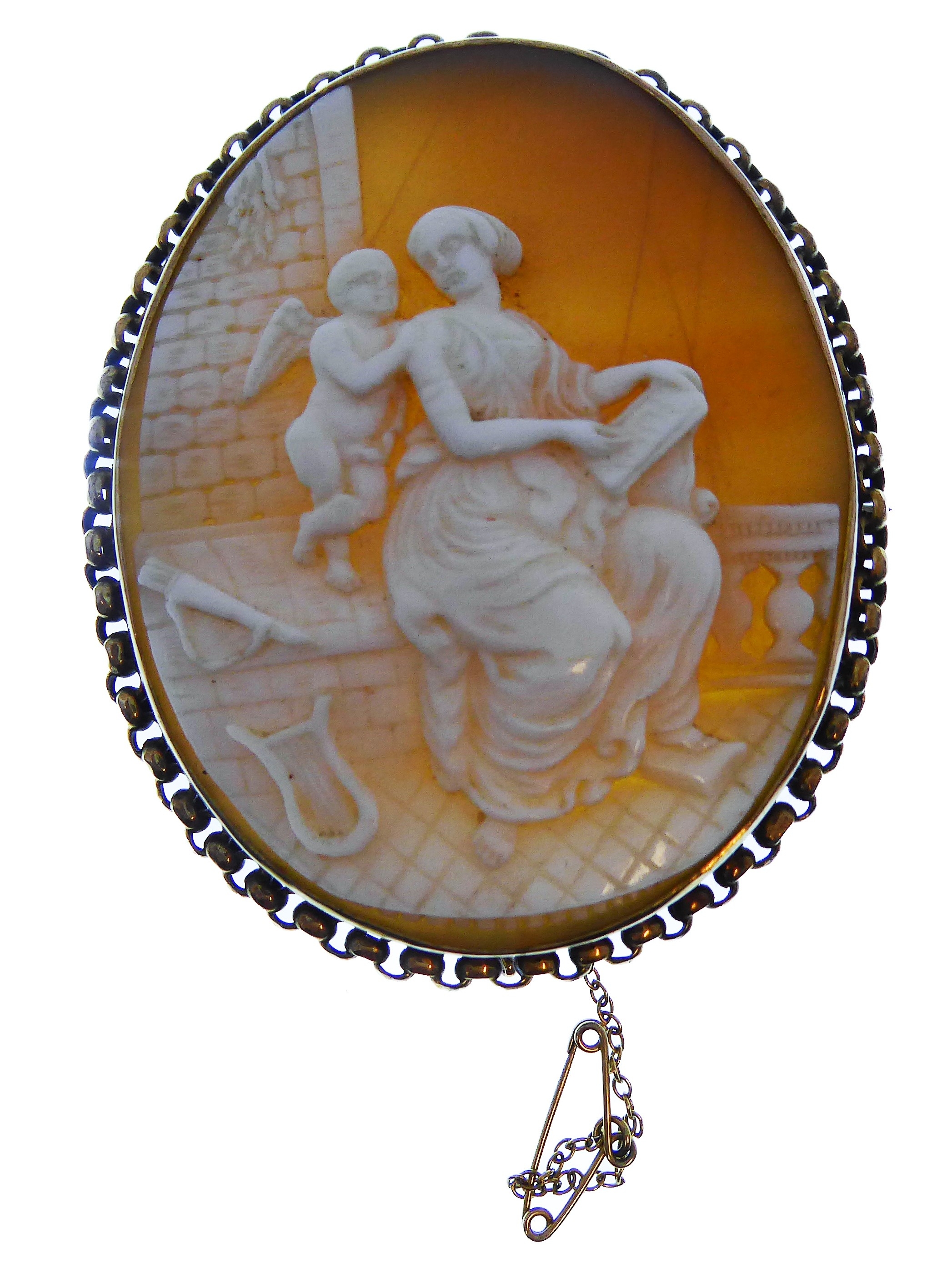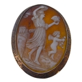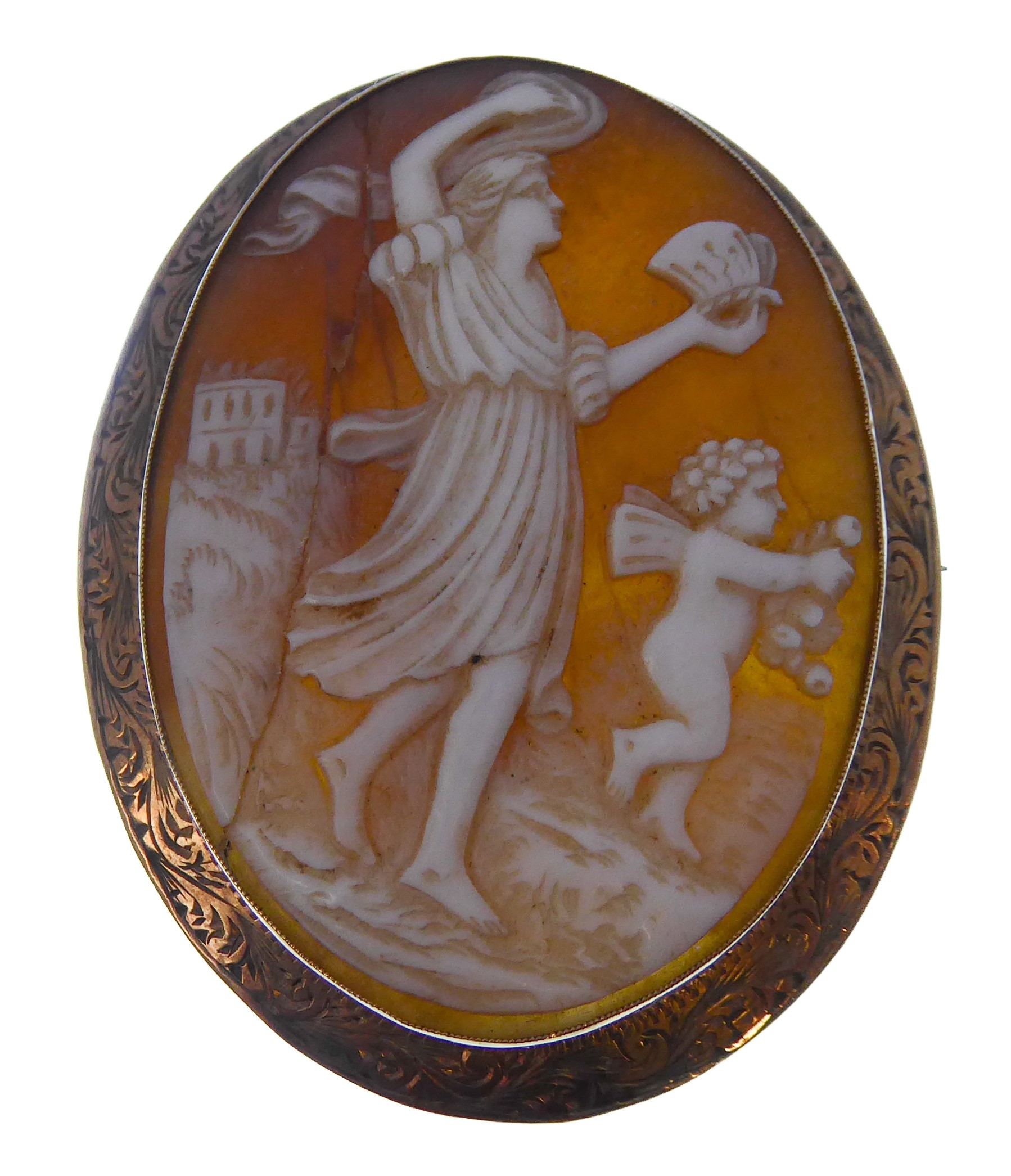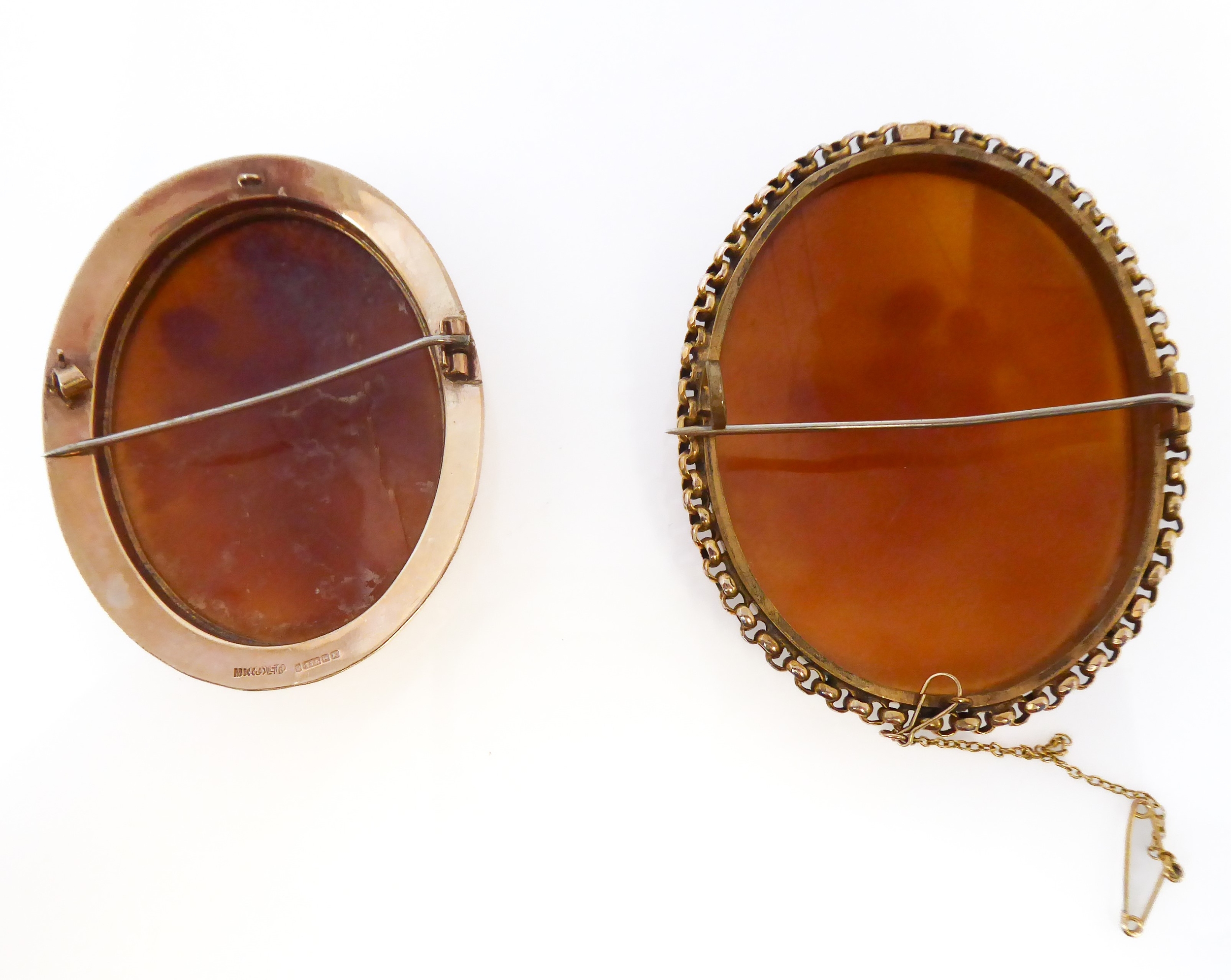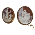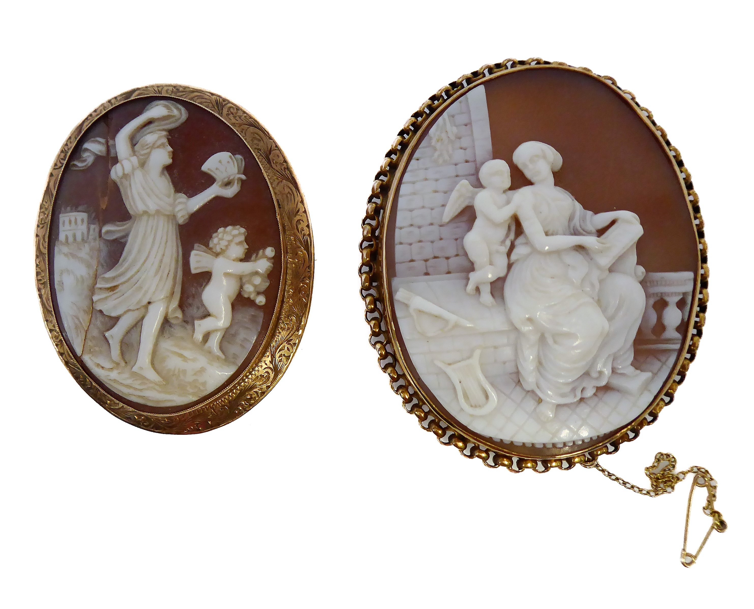 Two oval shell cameo brooches: the first depicting a seated lady reading to Cupid within a collet and rope twist border stamped '9CT' (overall 6cm high x 5cm wide, crazed), the second depicting a maiden and Cupid walking in a landscape to a 9-carat yellow gold collet and engraved border, Birmingham hallmark (overall 5.2cm high x 4.2cm wide cracked), combined gross weight 30.6g)