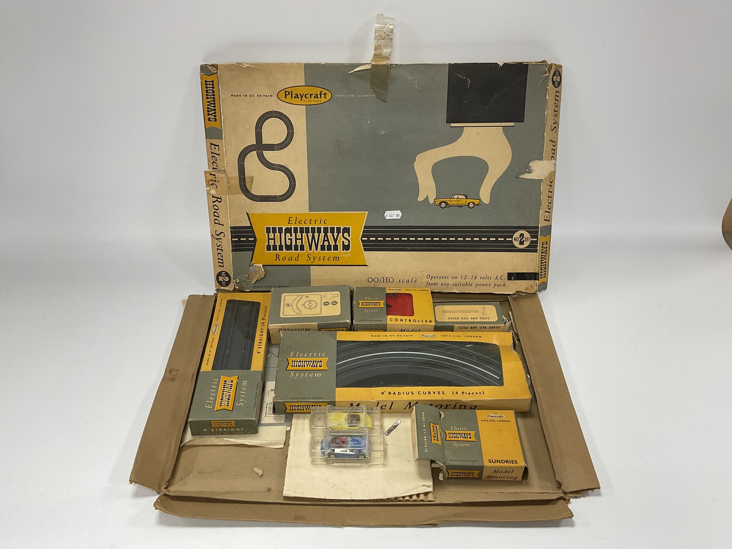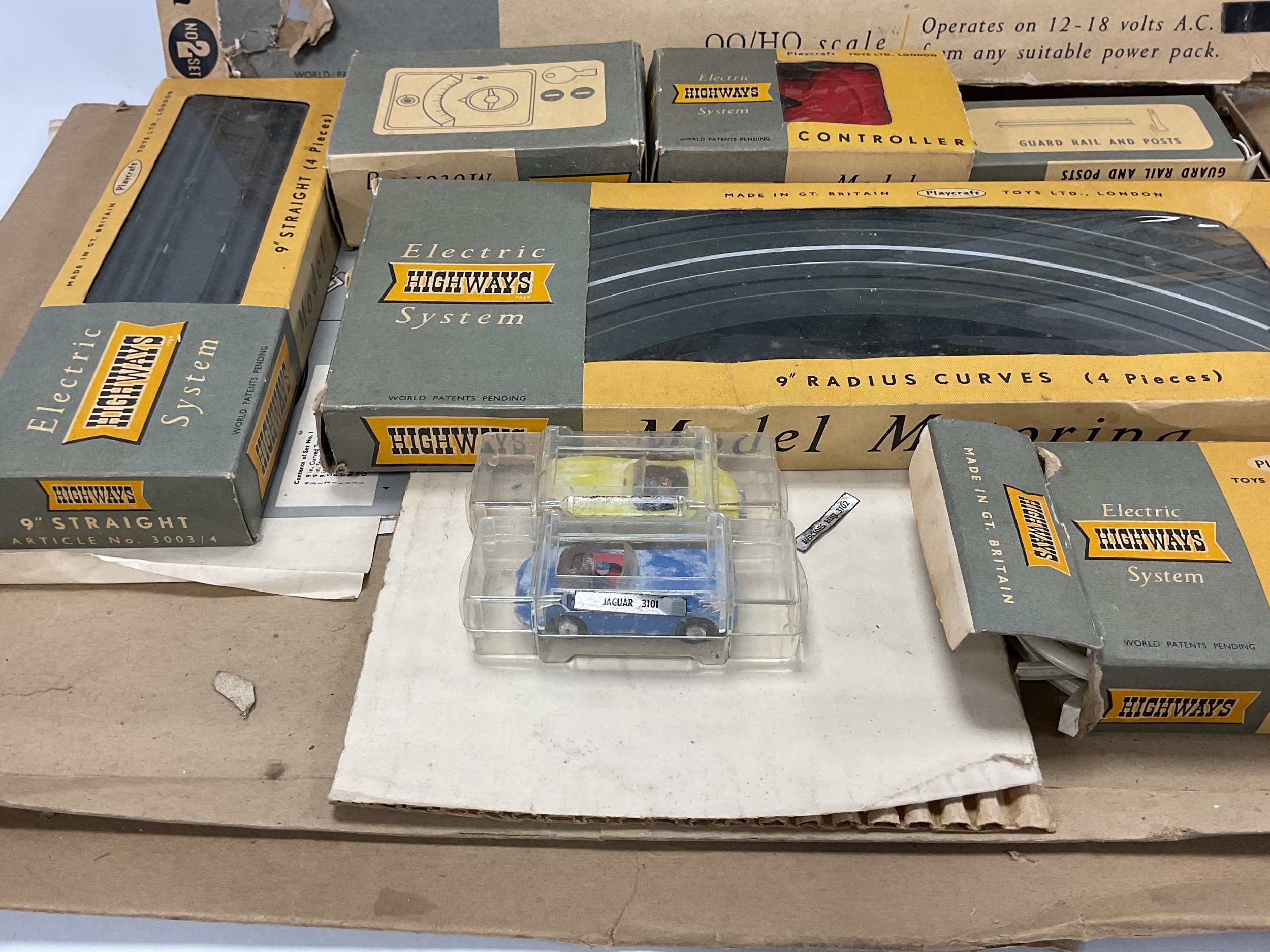 A boxed Playcraft Electric Highways Road System No.2 Set with Jaguar and Mercedes cars, with track, controller, and accessories in original internal boxes, untested, original outer box in poor condition.