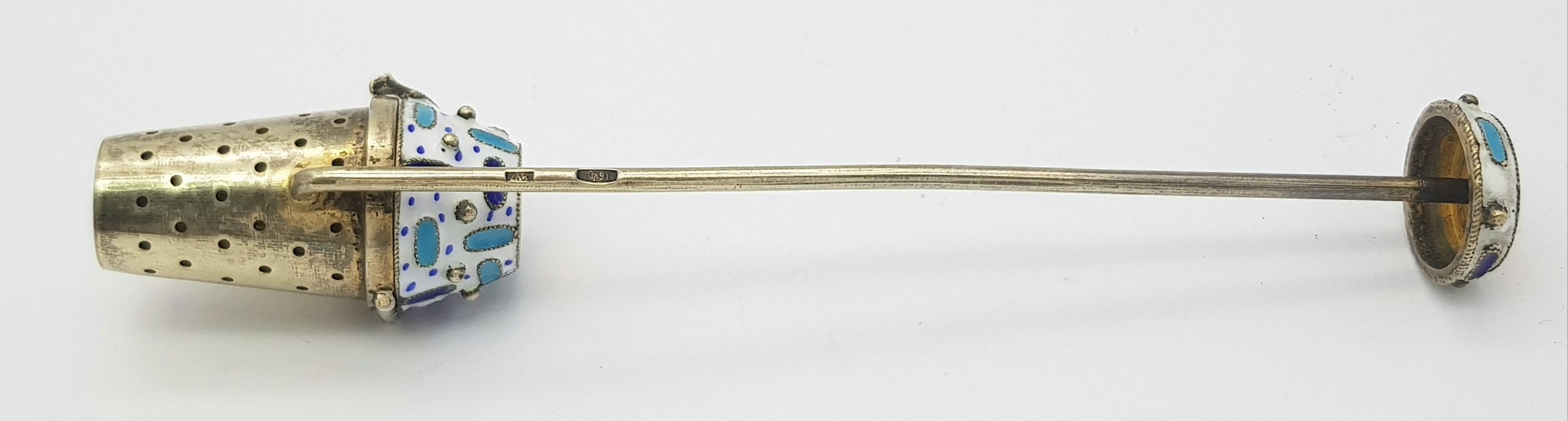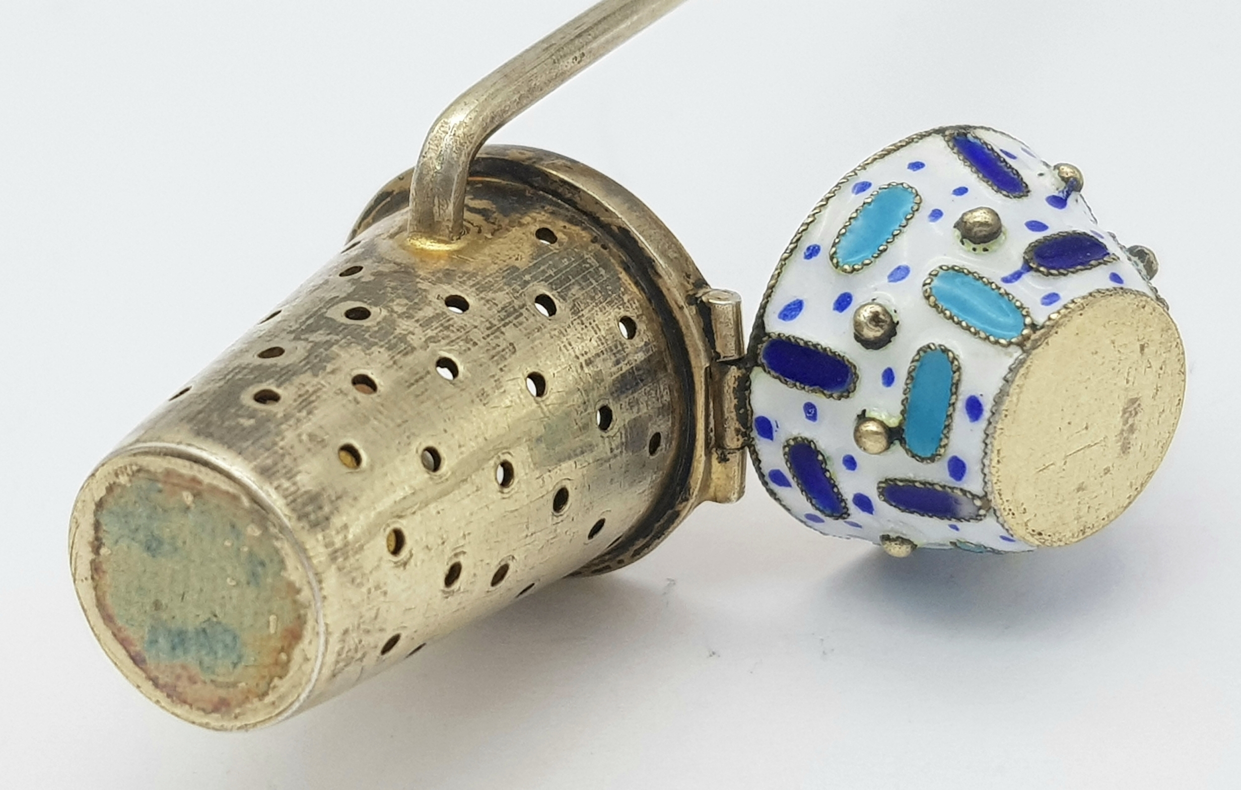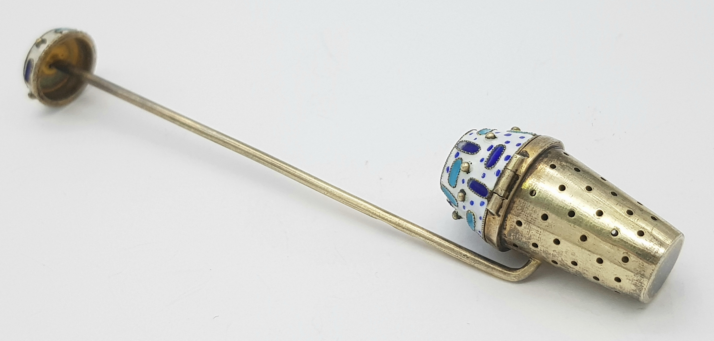 An Antique Russian 916 Silver and Enamel Cloisonne Tea Strainer. 11cm. 18.7g.