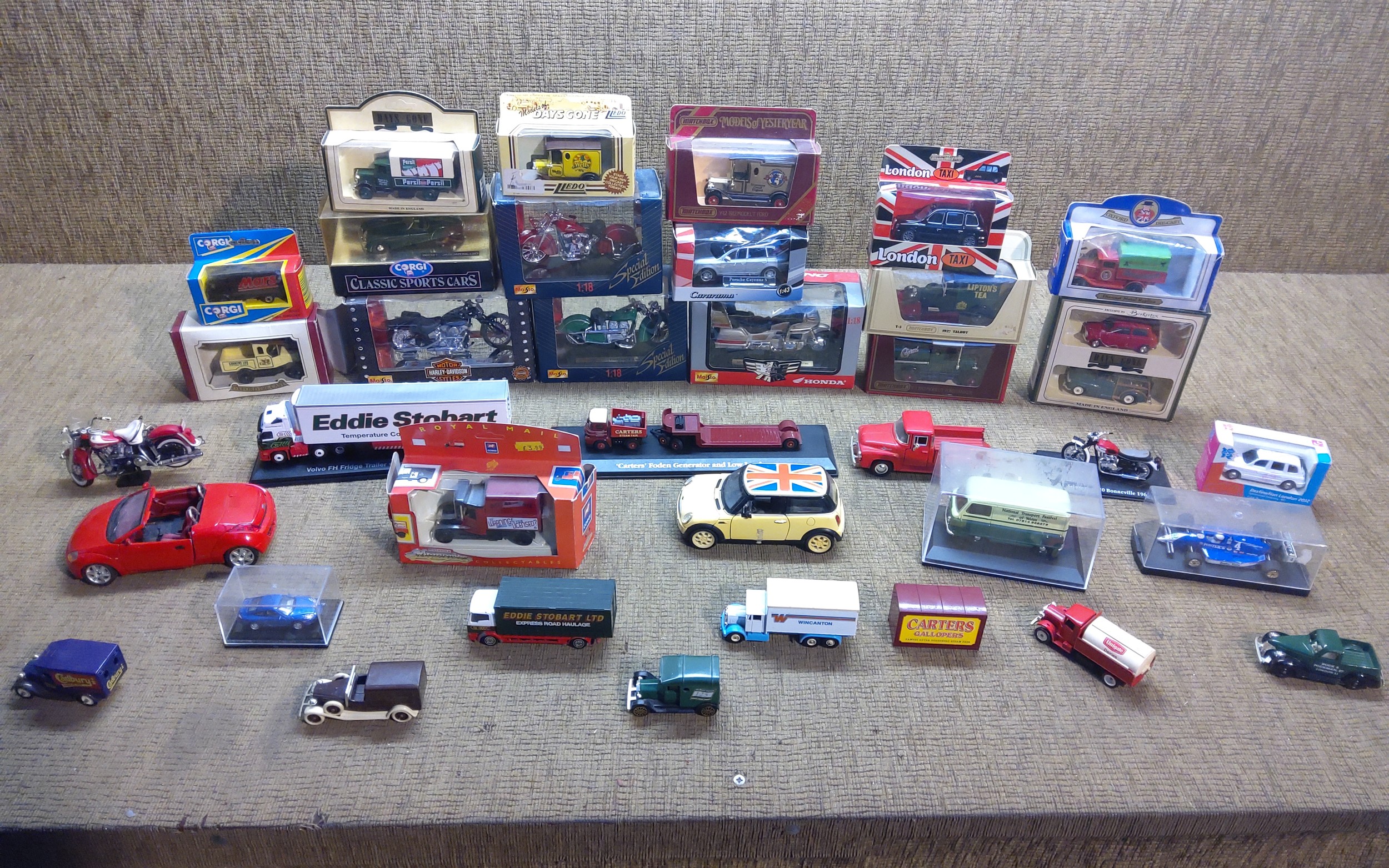 Large quantity of diecast cars and trucks some boxed includes Corgi and Maisto.