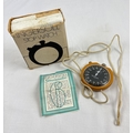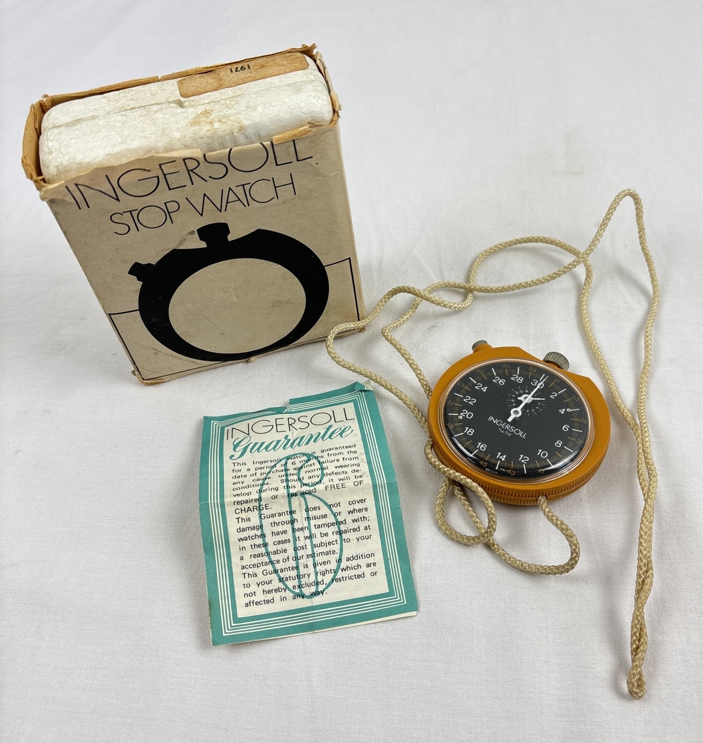 A vintage 1970's Ingersoll 1/10th stopwatch with original packaging and guarantee (dated 1976). With brown coloured plastic case, black face and white cord.