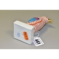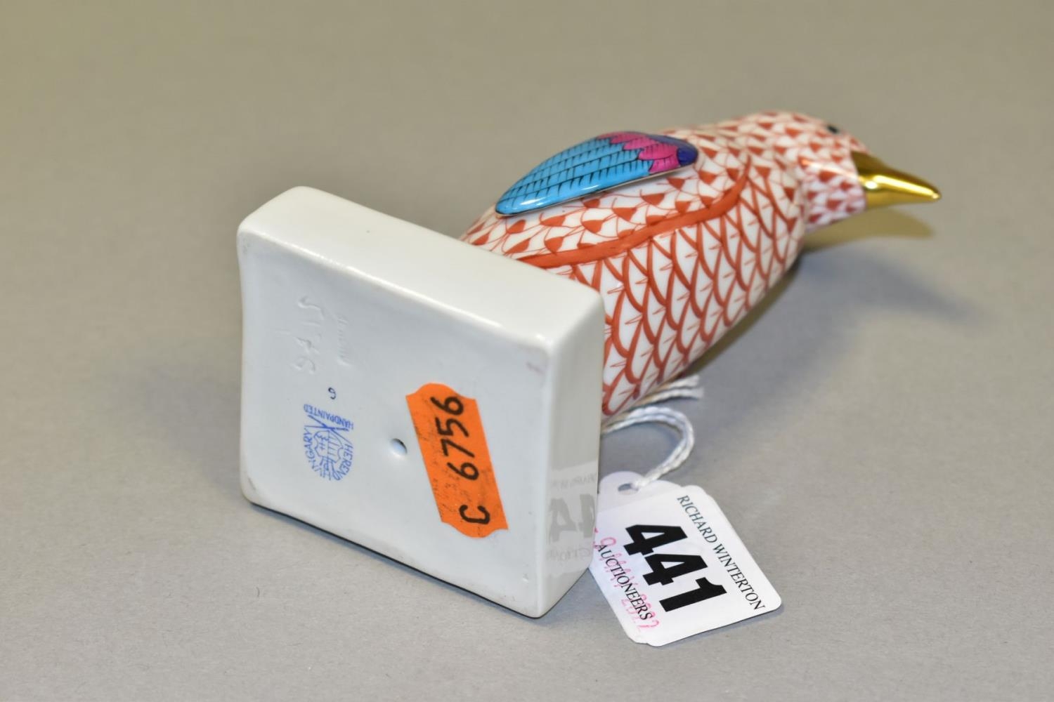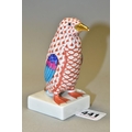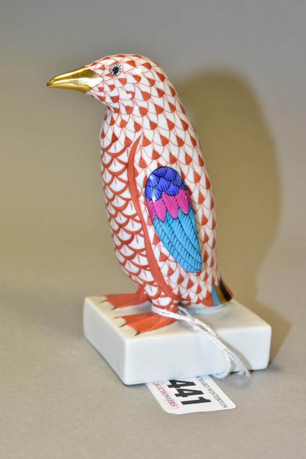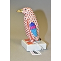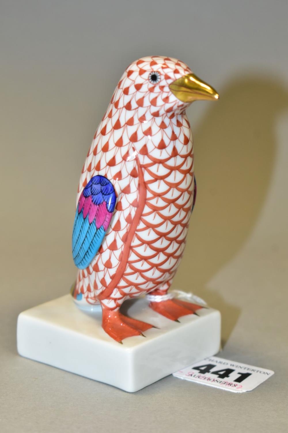 A HEREND RED FISHNET FIGURE OF A PENGUIN STANDING ON A SQUARE BASE, model no. 5176, gilt beak, multi coloured wings and tail feathers, printed, impressed and incised marks, height 10.5cm (Condition report: in good condition)