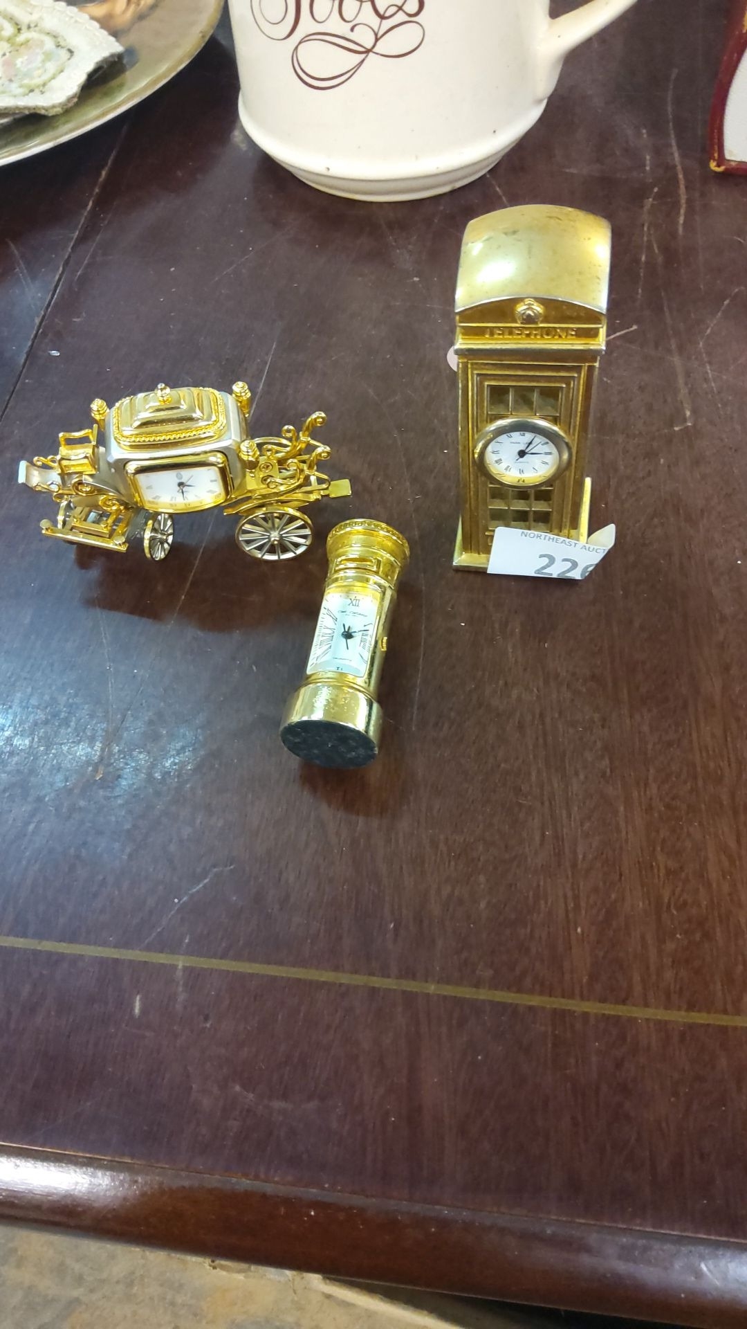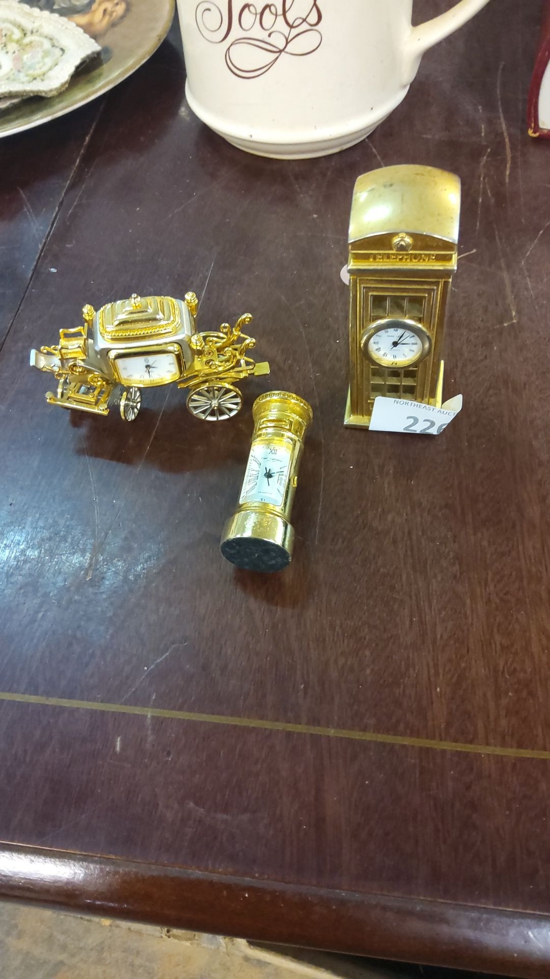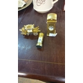 Three miniature carriage clocks in gold-tone metal, featuring ornate designs. Includes a carriage, pillar, and telephone booth clock motif.