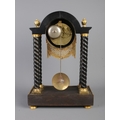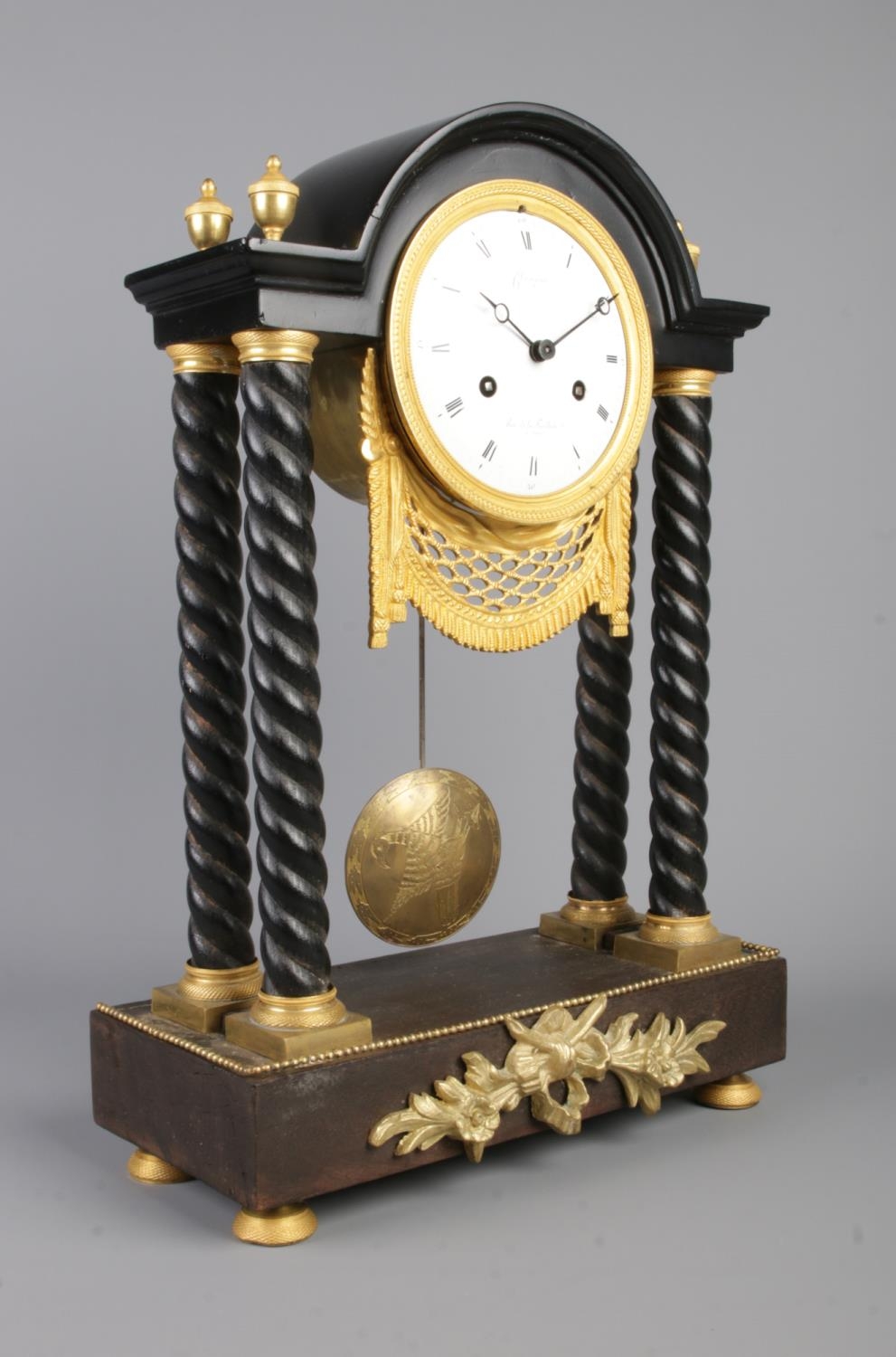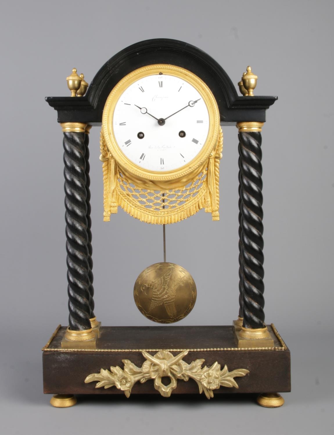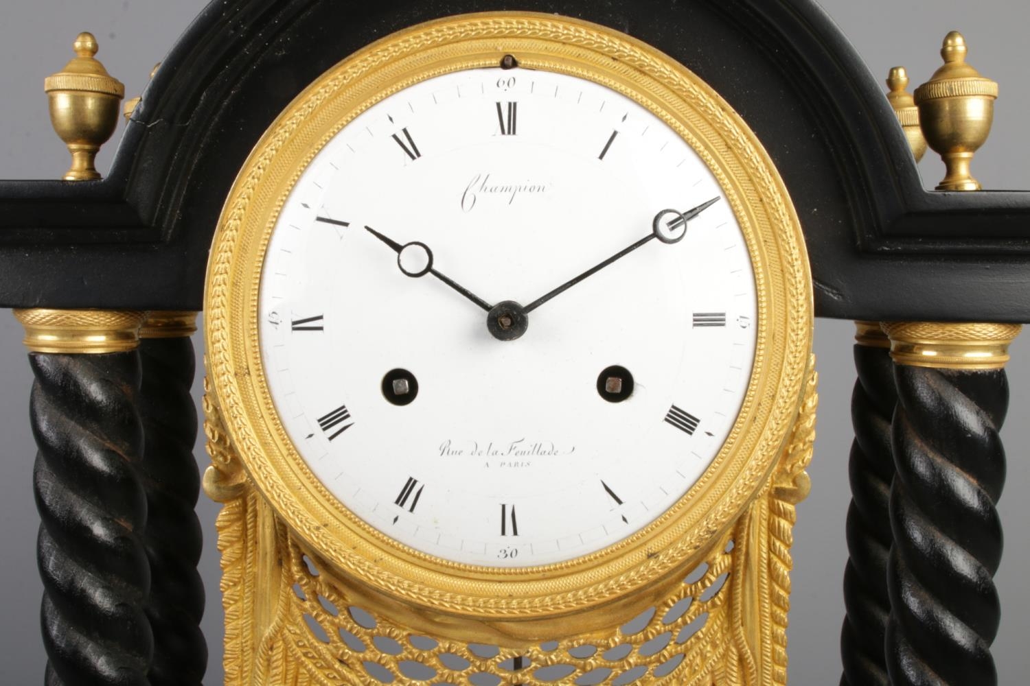A 19th century French ebonised and gilt metal Portico clock. The dial stamped Champion, Rue de la Feuillade, Paris. Height 42.5cm.