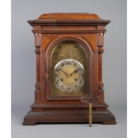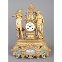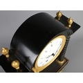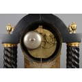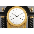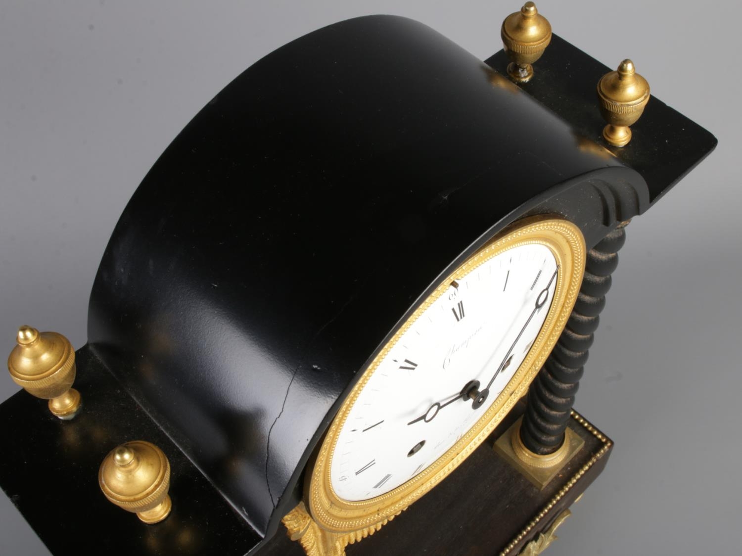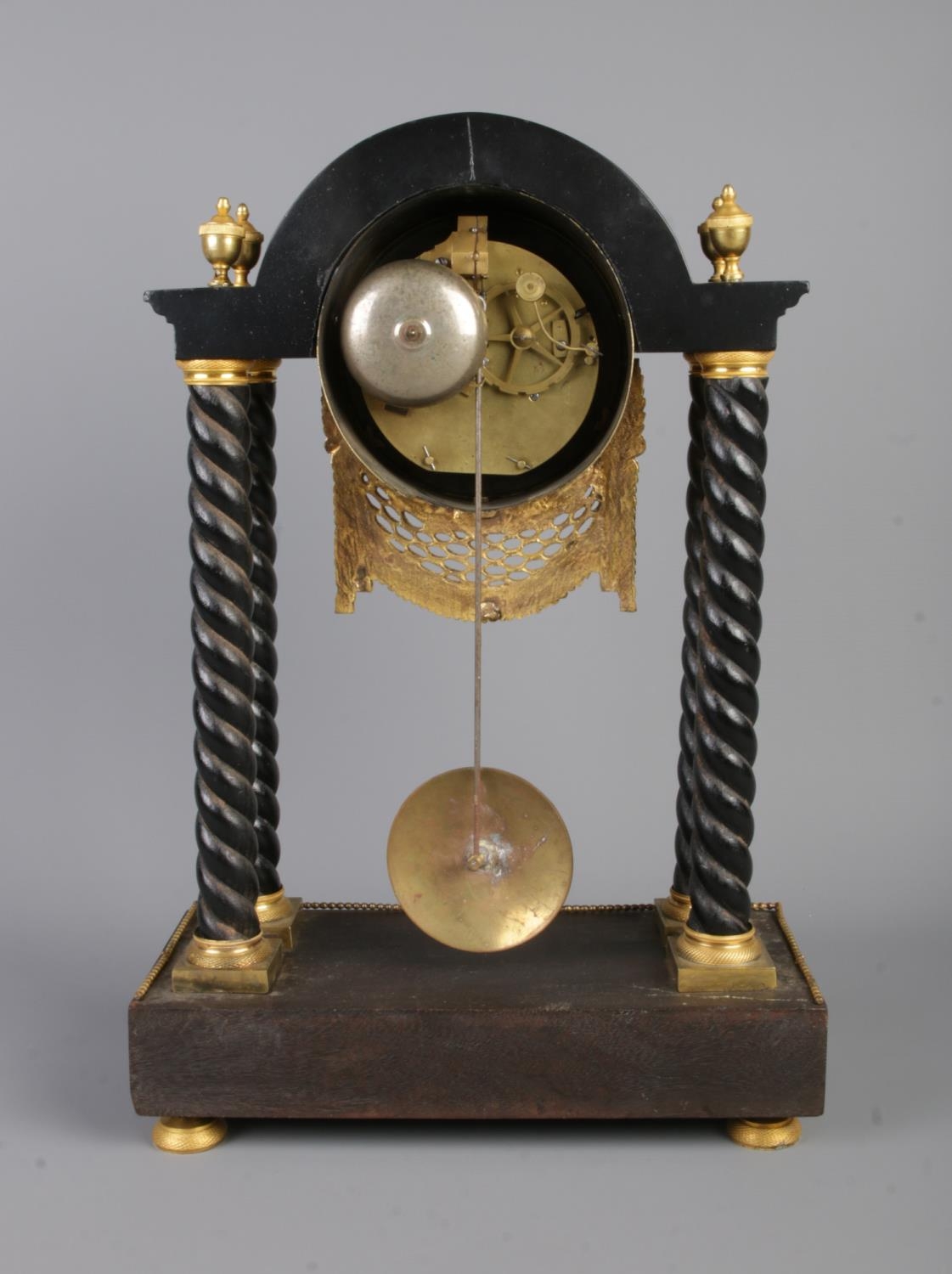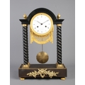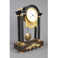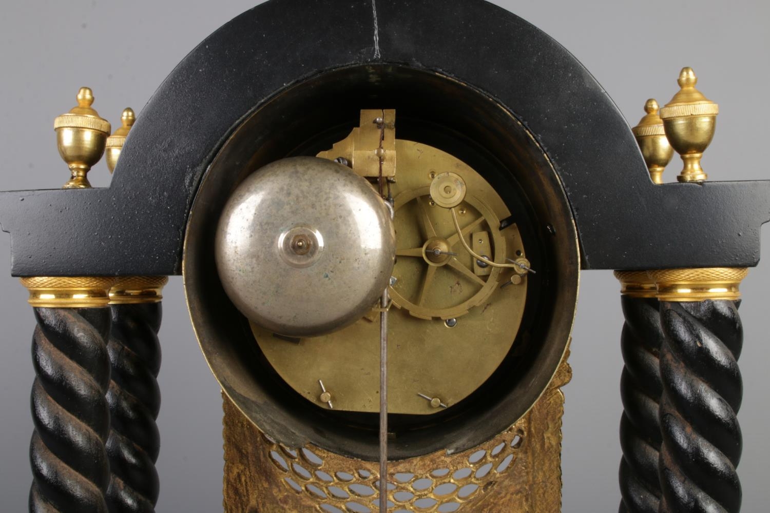 A 19th century French ebonised and gilt metal Portico clock. The dial stamped Champion, Rue de la Feuillade, Paris. Height 42.5cm.