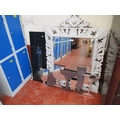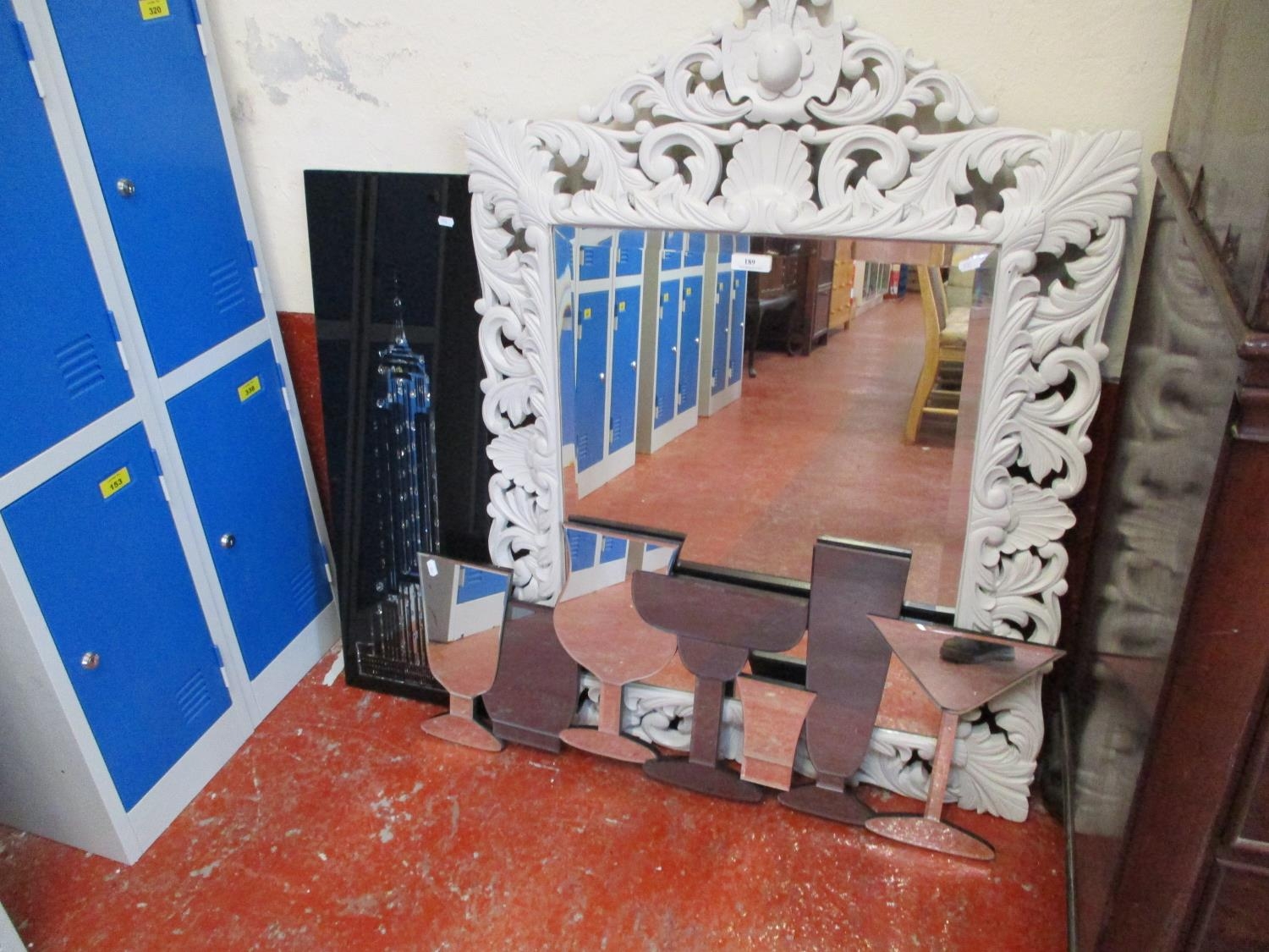 An ornate white framed mirror and illuminated mirror of the Empire State Building together with a mirror modelled in the form of wine glasses