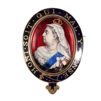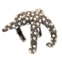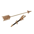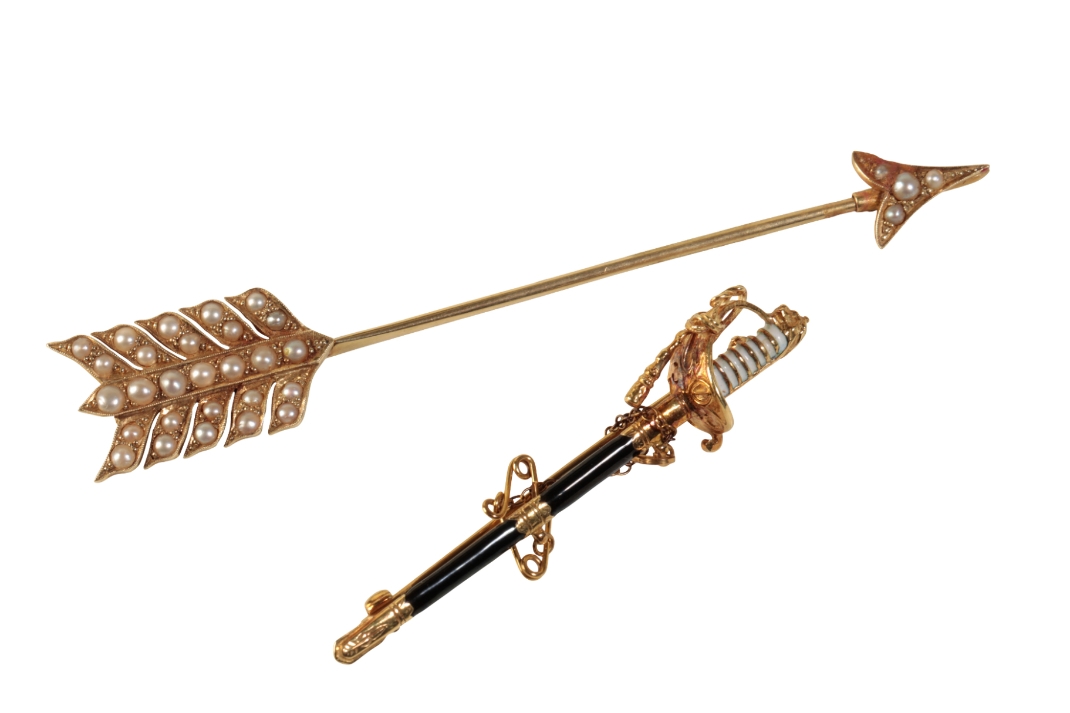 AN UNMARKED YELLOW METAL JABOT PIN SET WITH SEED PEARLS,, 10cm long, together with a military sword brooch, the pin stamped "750", 6cm long (2)