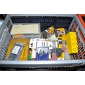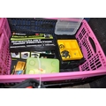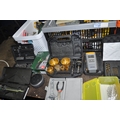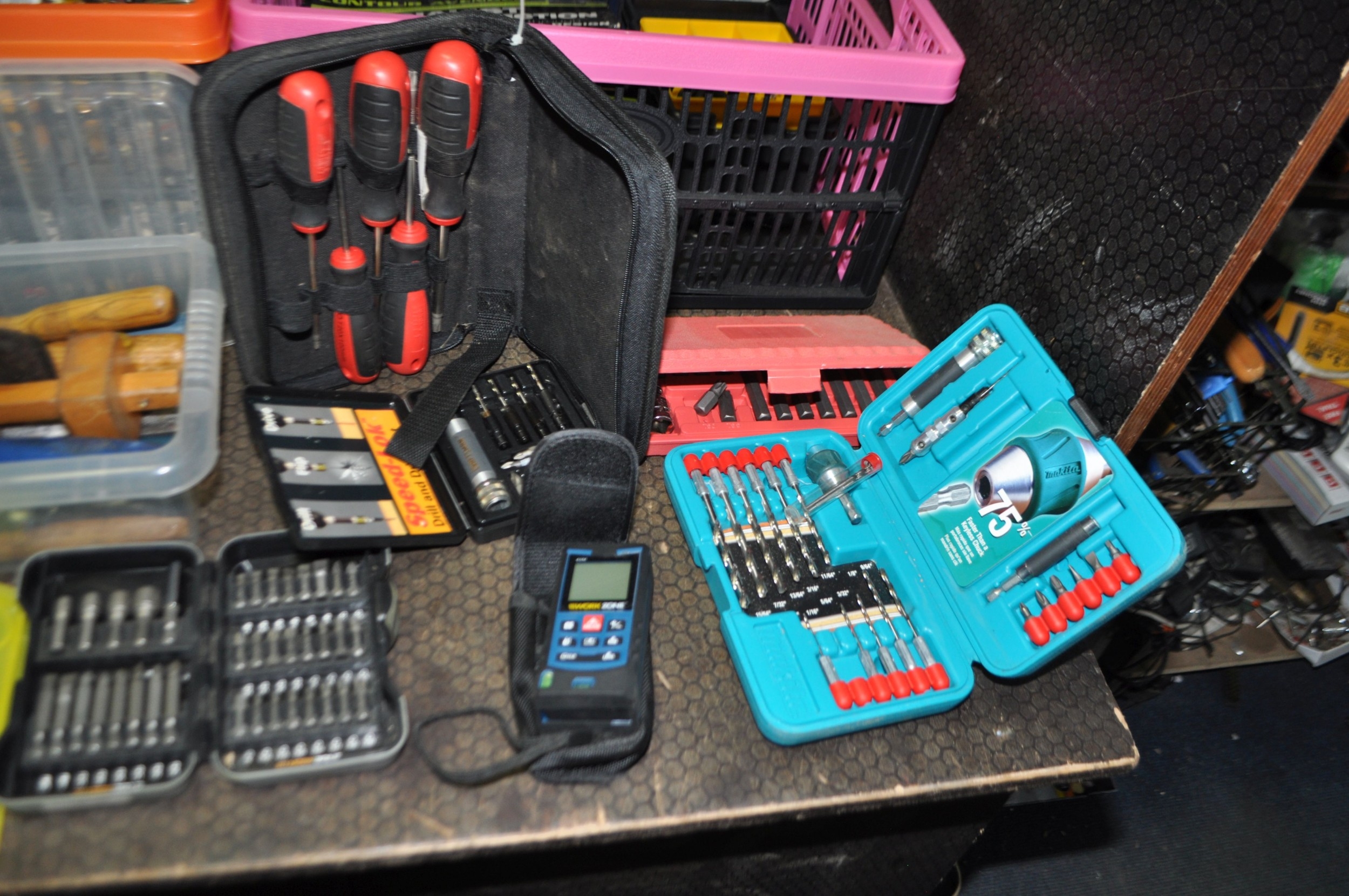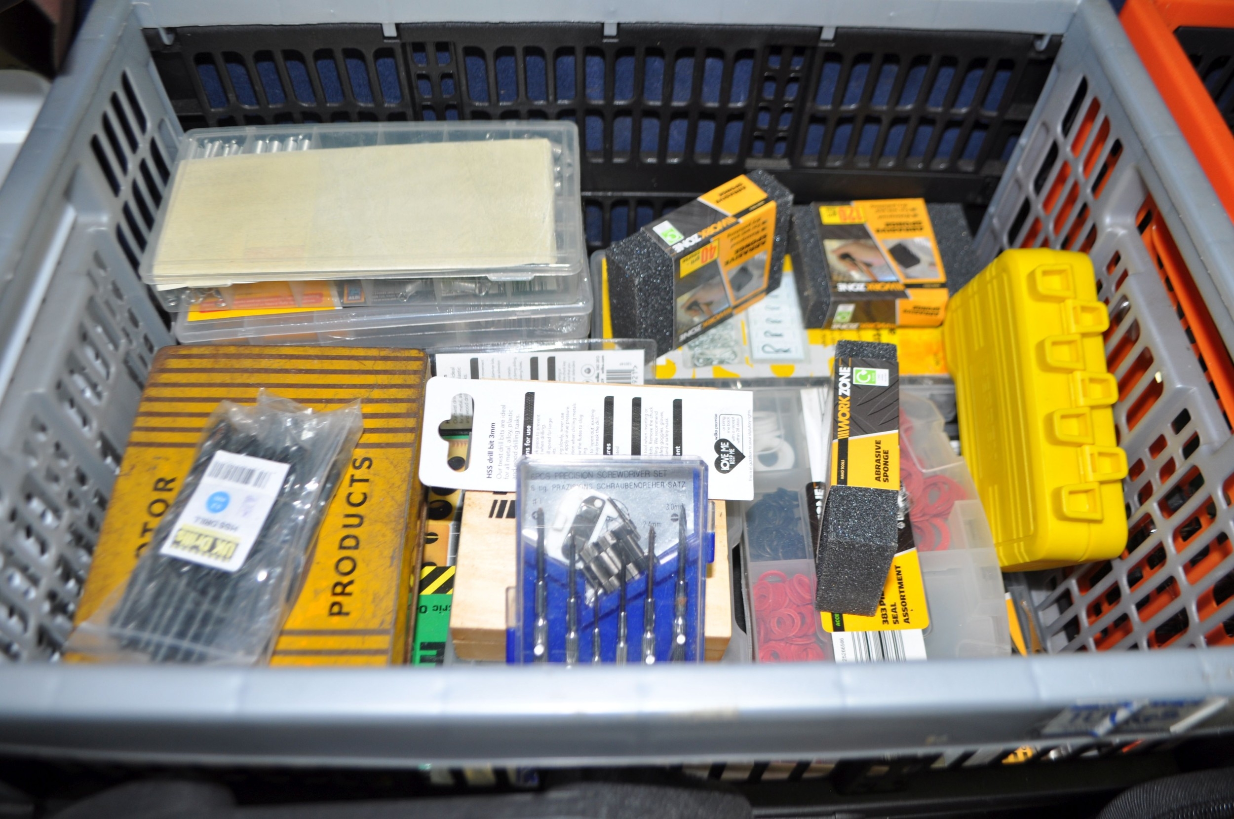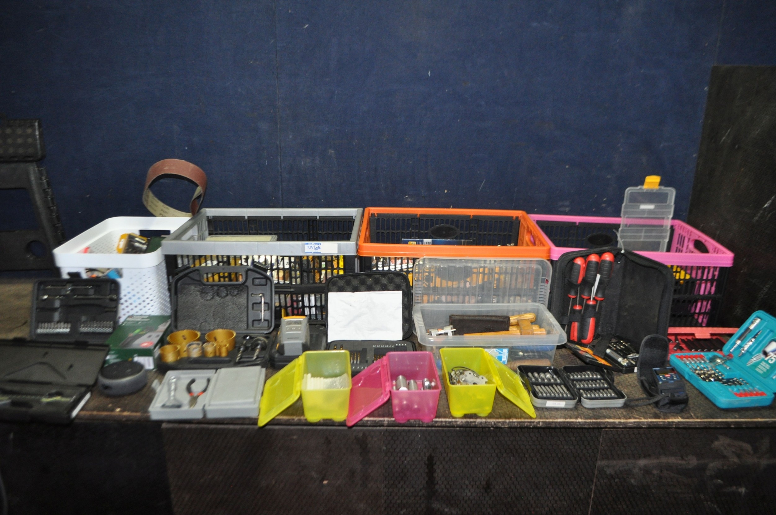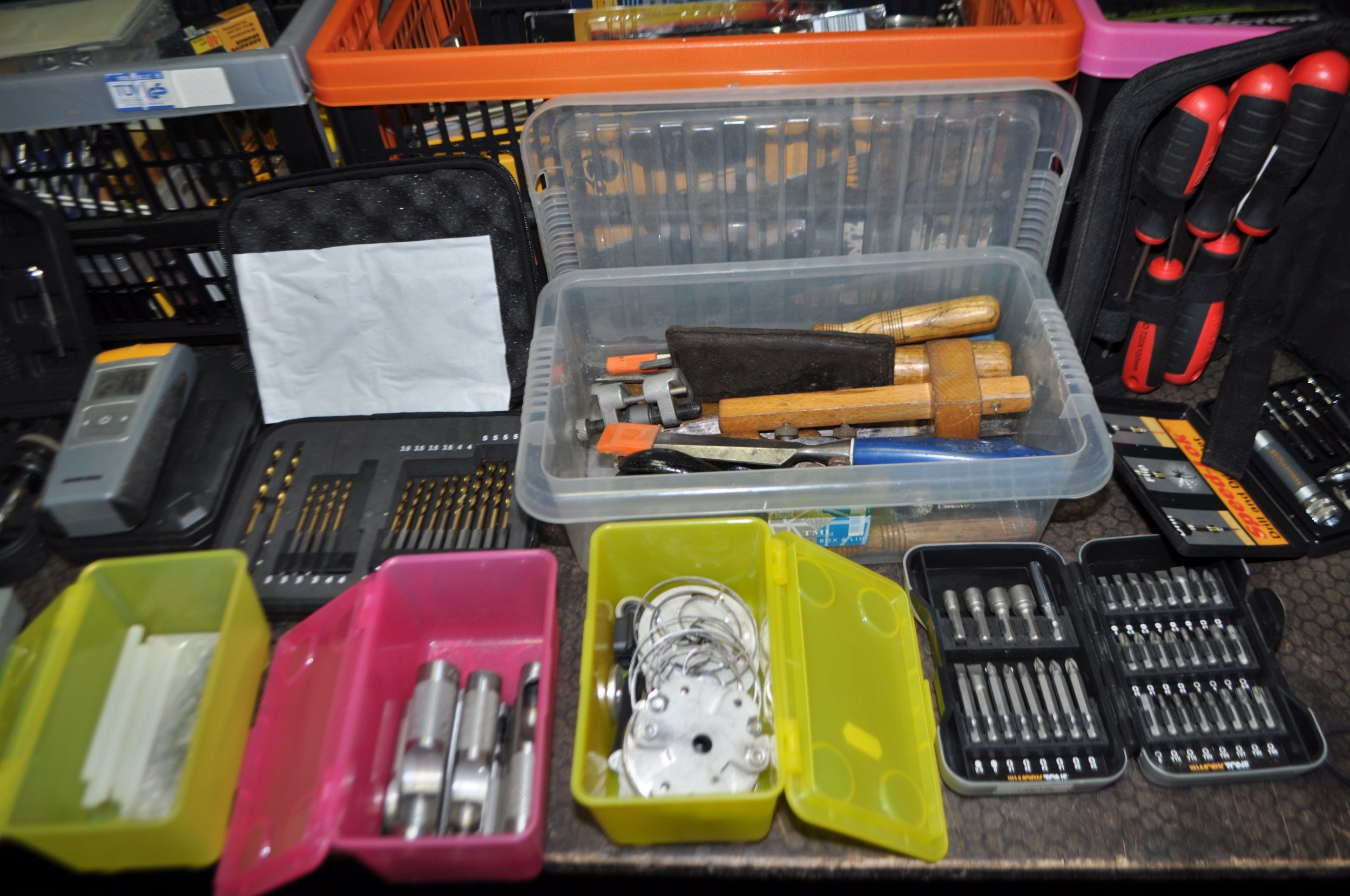 FOUR TRAYS CONTAINING DIY AND ENGINEERING HARDWARE AND CONSUMABLES including drill bits, screwdriver sets, chisels, two Stanley spokeshaves, hole saws, a Mitutoyo digital vernier caliper, etc