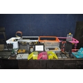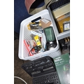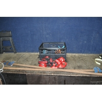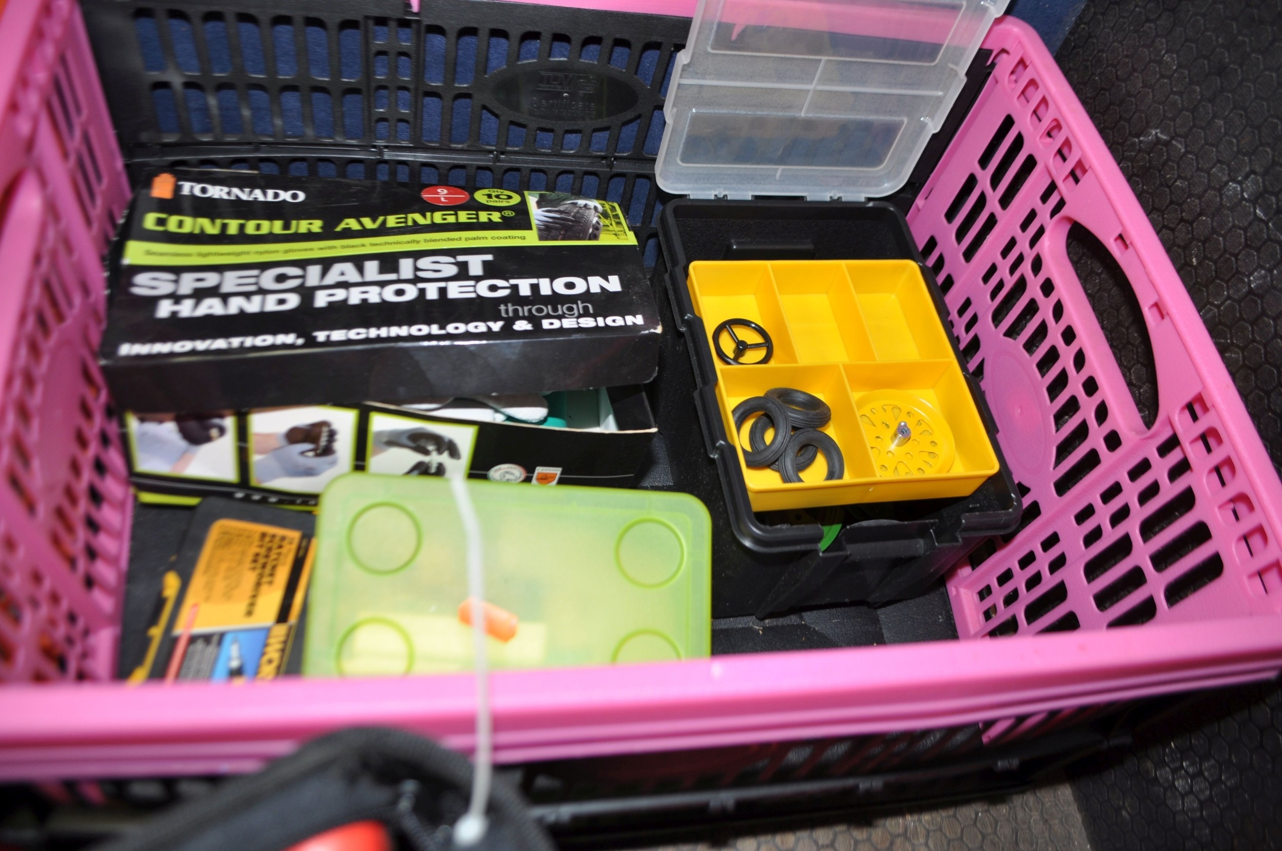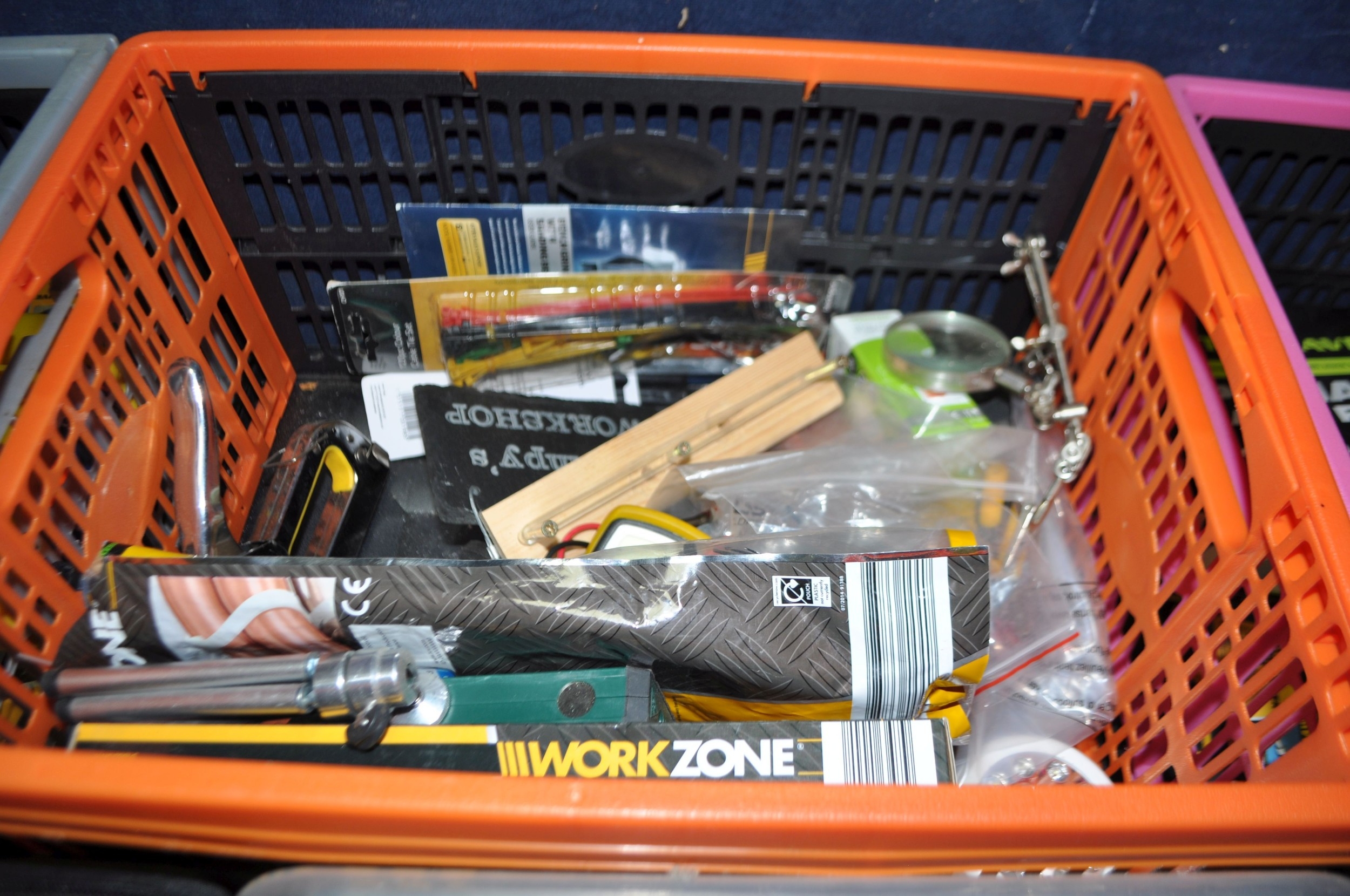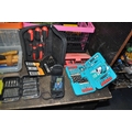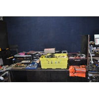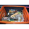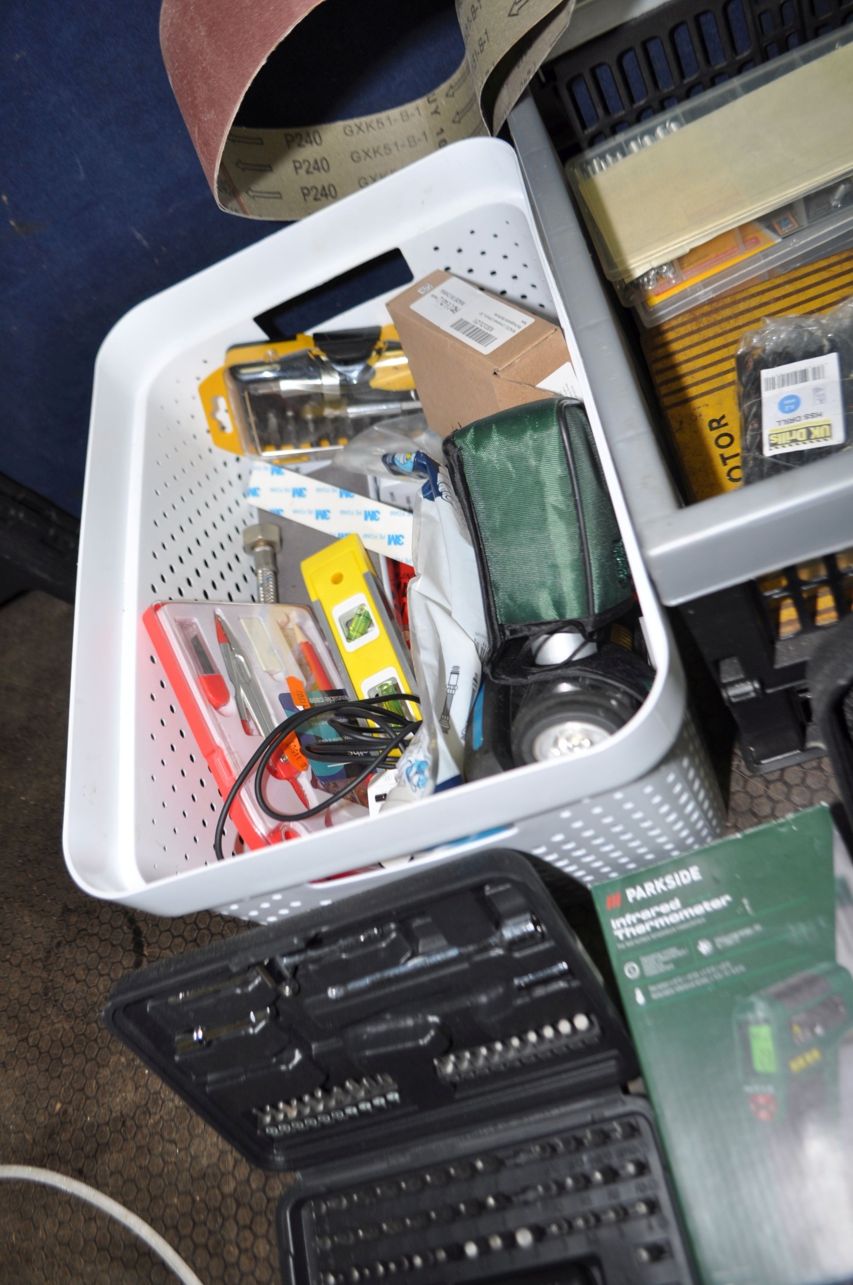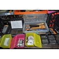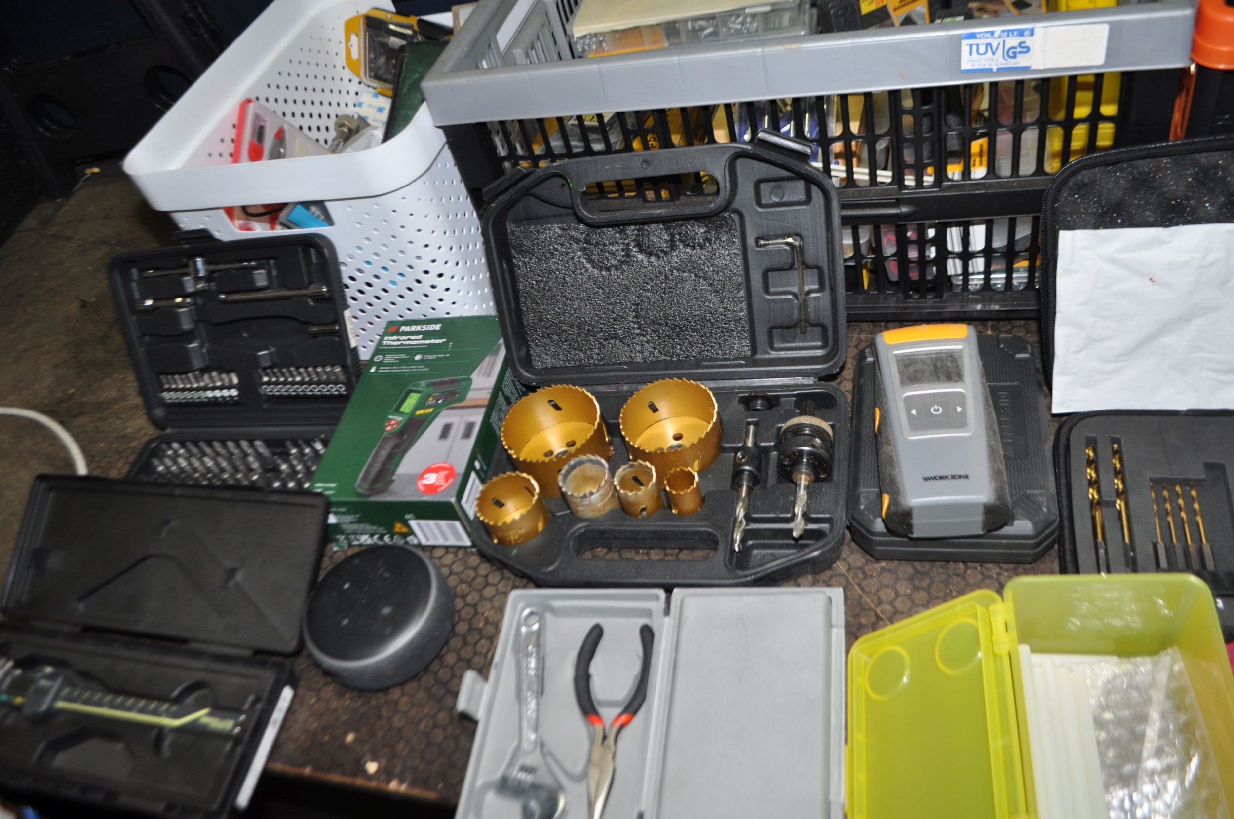 FOUR TRAYS CONTAINING DIY AND ENGINEERING HARDWARE AND CONSUMABLES including drill bits, screwdriver sets, chisels, two Stanley spokeshaves, hole saws, a Mitutoyo digital vernier caliper, etc