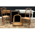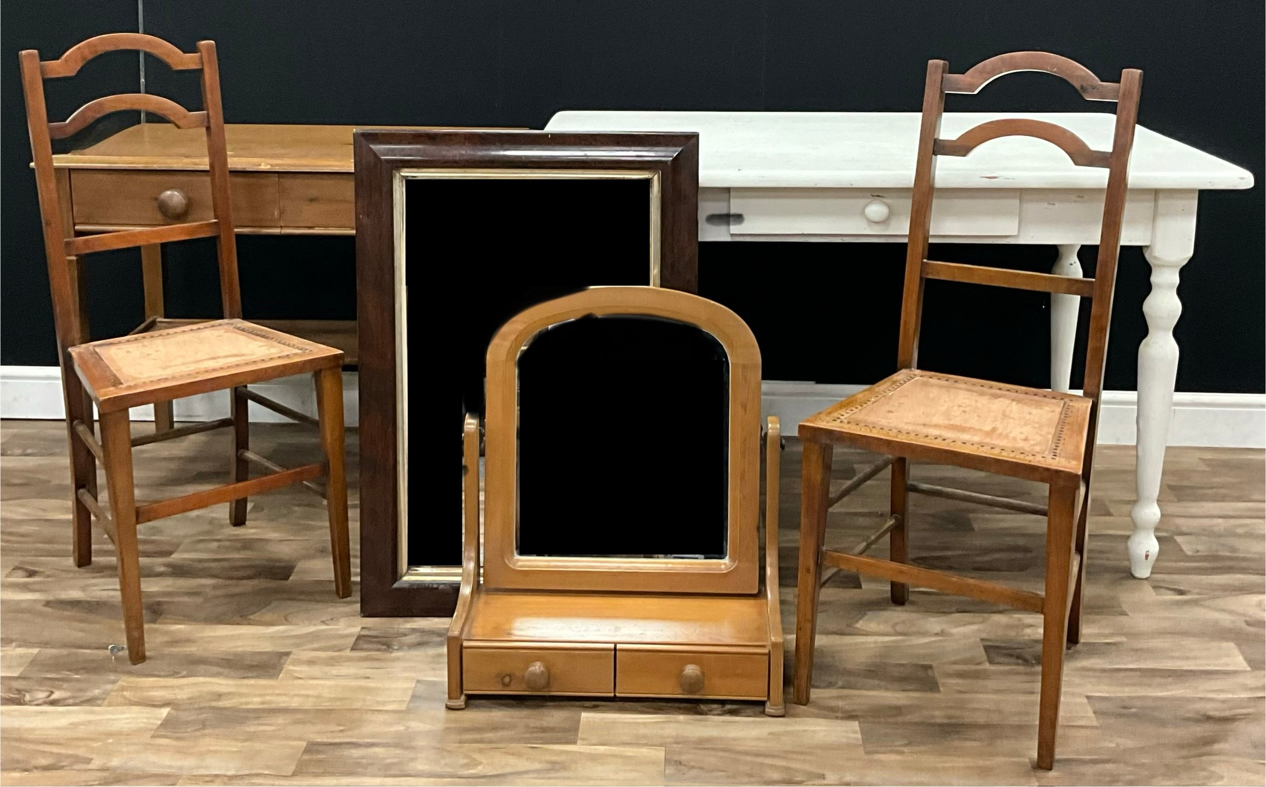 A Victorian pine hall table, 70cm high, 89cm wide, 50.5cm deep; a white pine farmhouse dining table, 73.5cm high, 119.5cm wide, 80cm deep; a pair of arts and crafts style oak ladder back side chairs; a pine dressing table mirror; another mirror, (6)