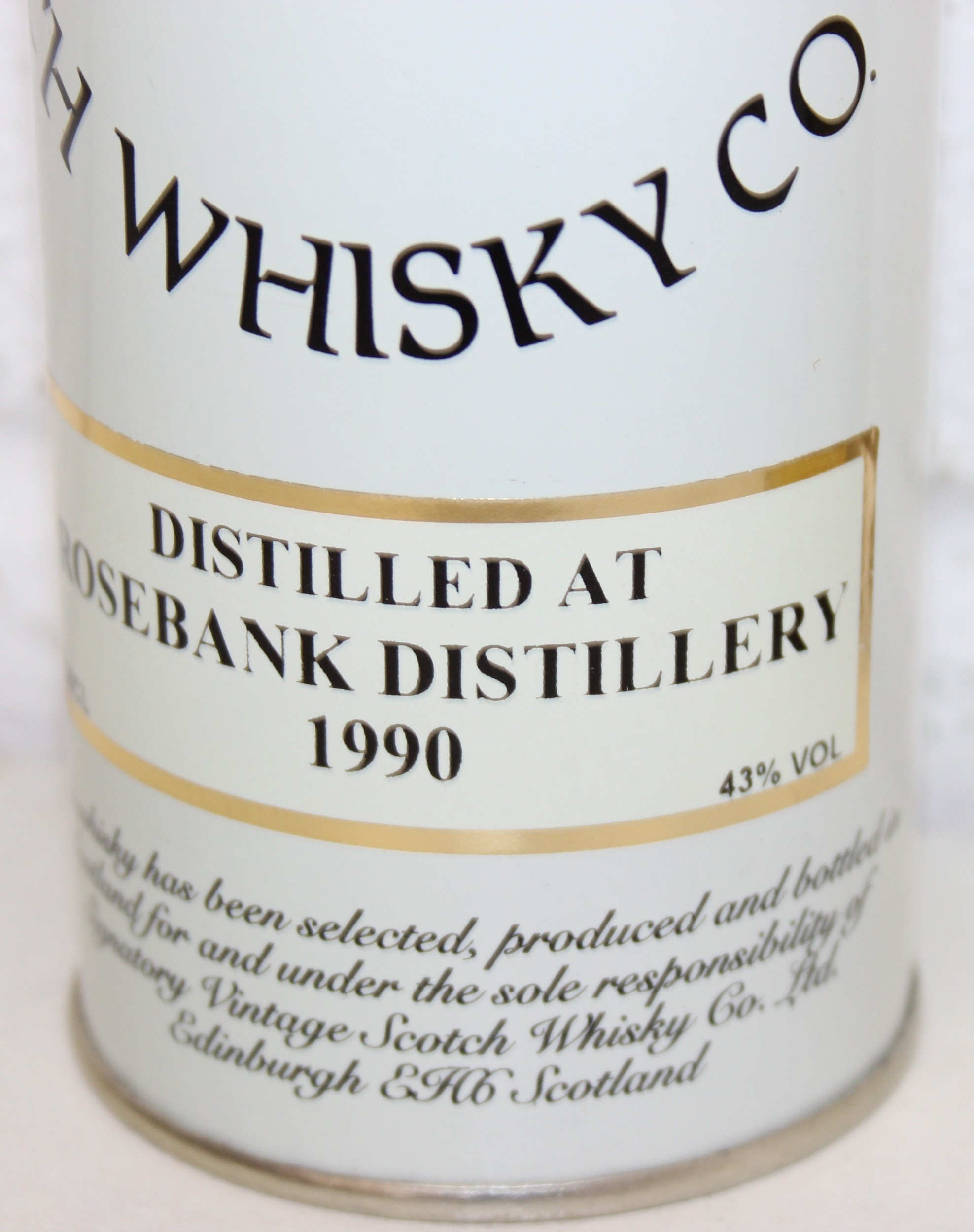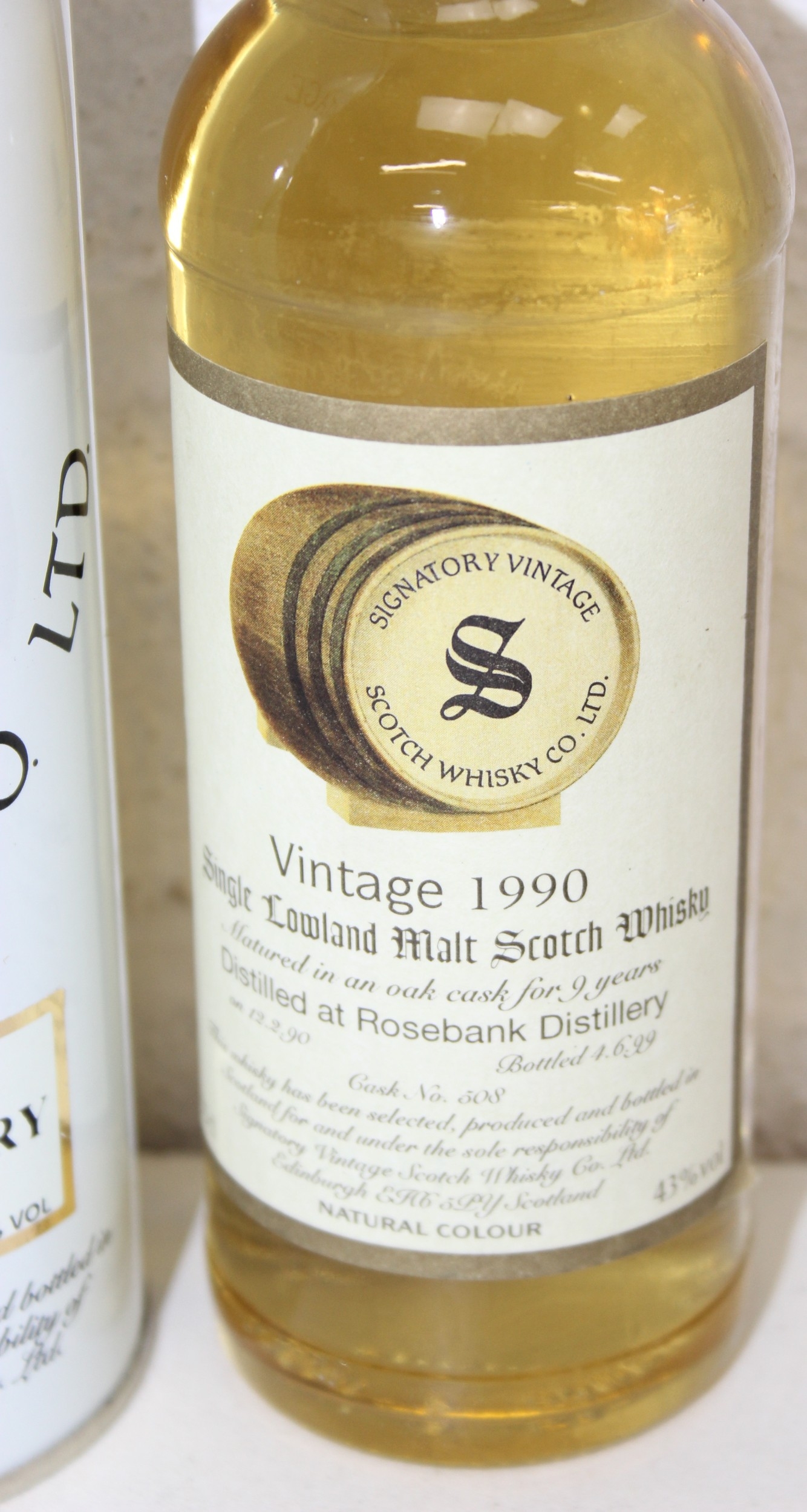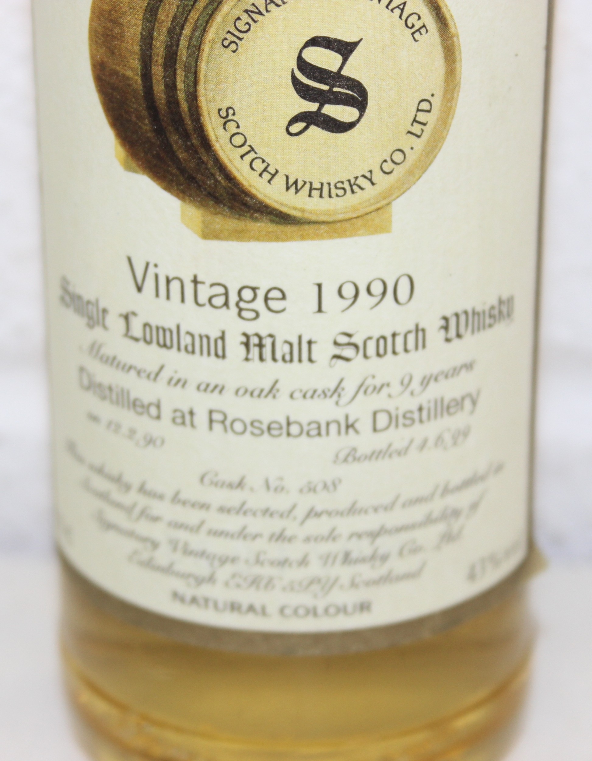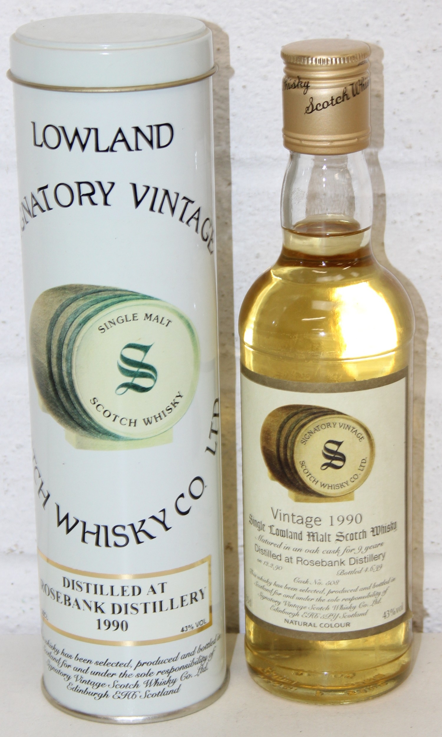 A bottle of Lowland Signatory Vintage Single Malt Scotch Whisky, 9 years old and distilled at Rosebank in 1990, with tin, 35cl, sealed