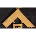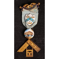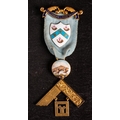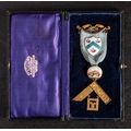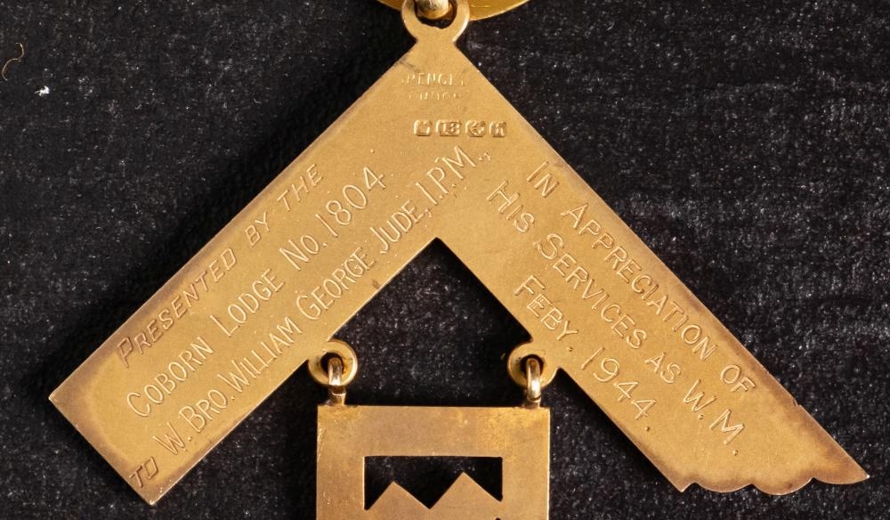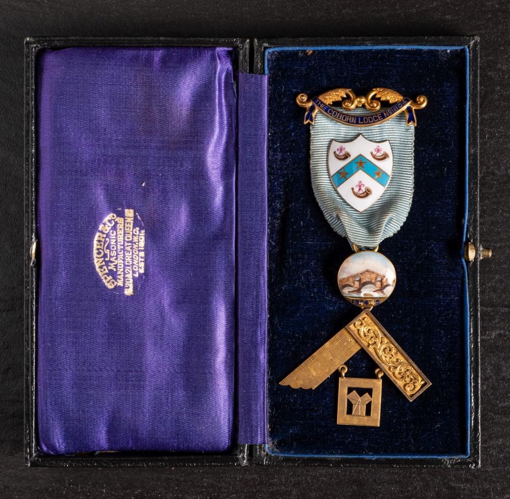 An 18ct gold and enamel Masonic jewel for 'The Coborn Lodge No.1804: with cyan colour ribbon , gold and enamel suspension bars, shield cartouche with circular suspension dated 1944-45 (damage to enamel) over gold square with personalised inscription to verso, in a leather case with Spencer & Co retailer's address, 32.1g