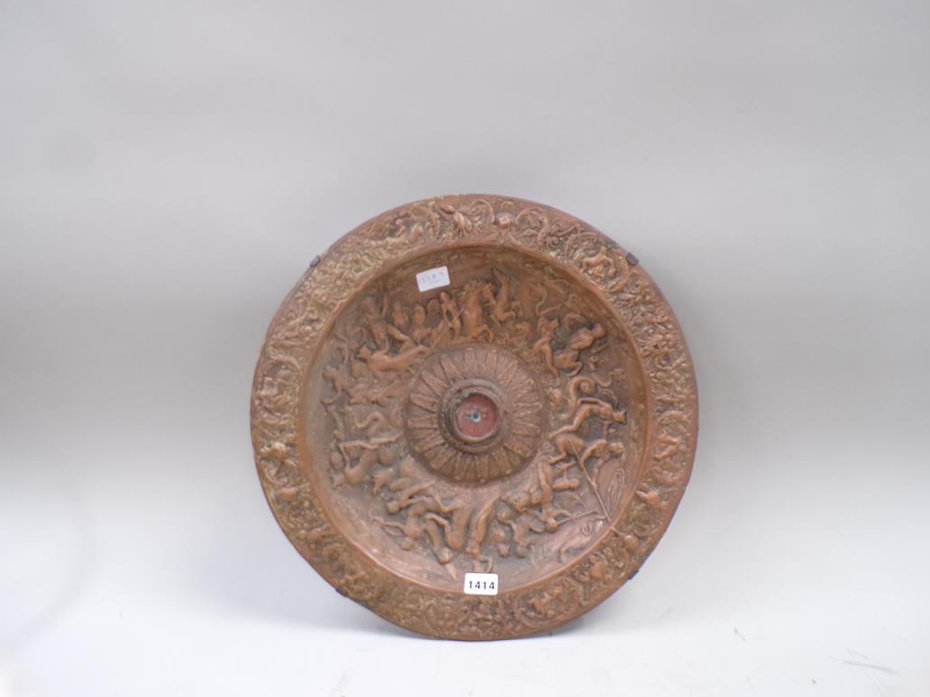 LATE 19c EMBOSSED COPPER CIRCULAR DISH WITH CLASSICAL SCENES 45cms DIA