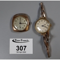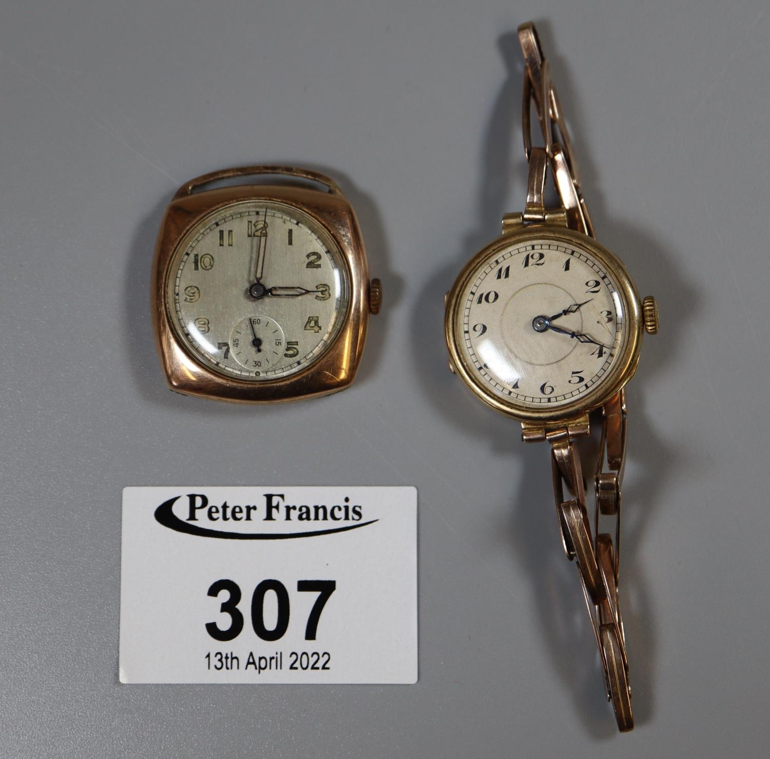 Cushion-shaped gold gent's small head wrist watch and a ladies gold wrist watch with expanding bracelet. (2)