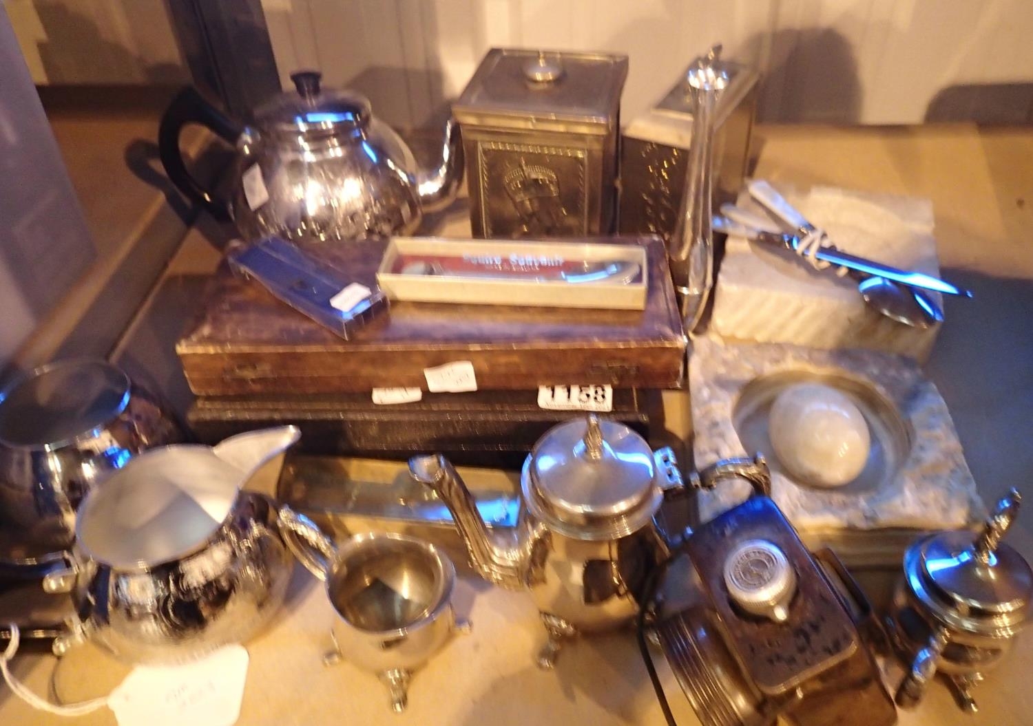 Mixed metalware including cased flatware, miniature silver plated tea set, brass Coronation tea caddy etc. Not available for in-house P&P, contact Paul O'Hea at Mailboxes on 01925 659133