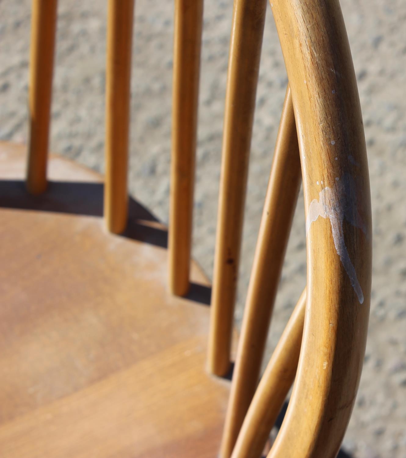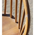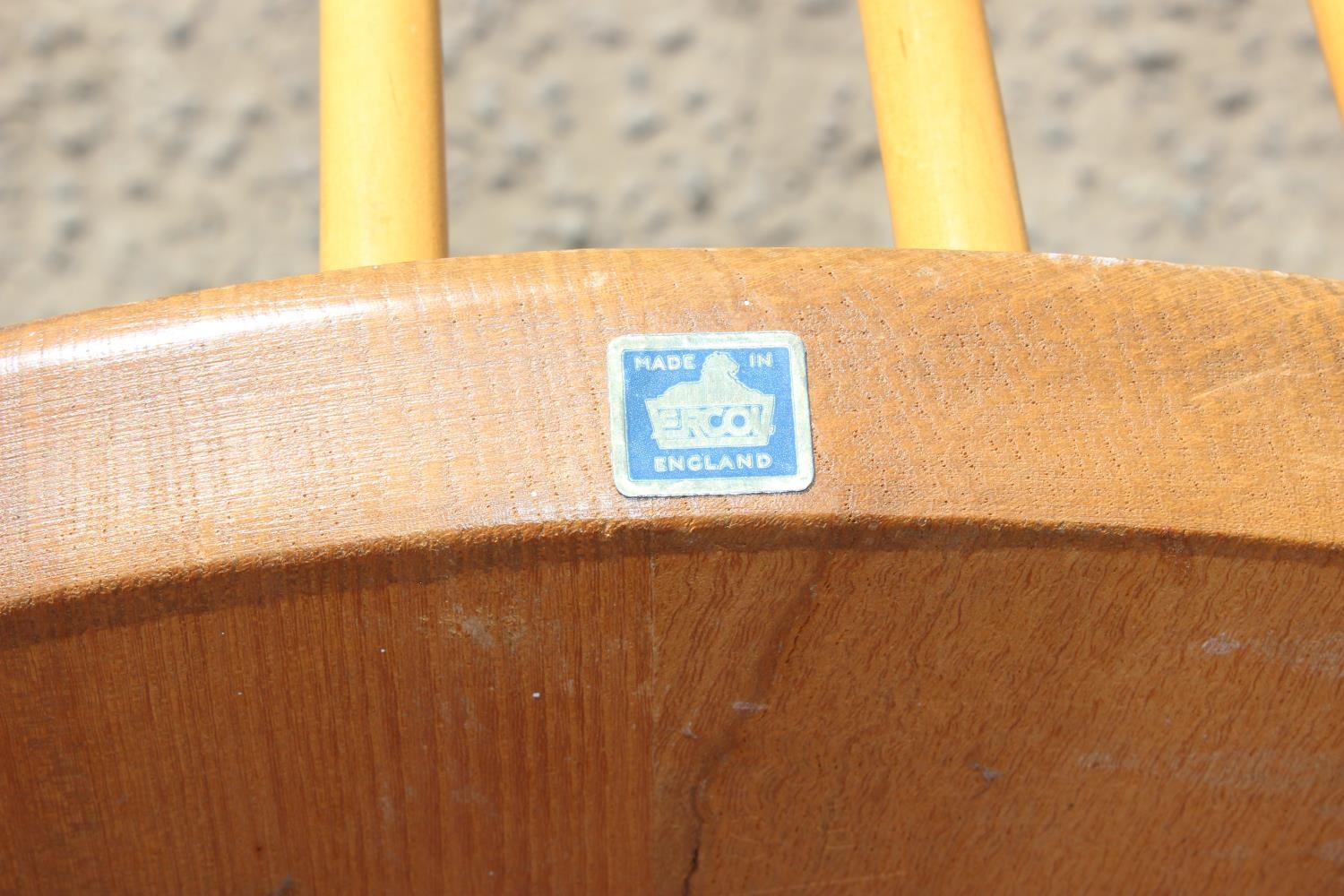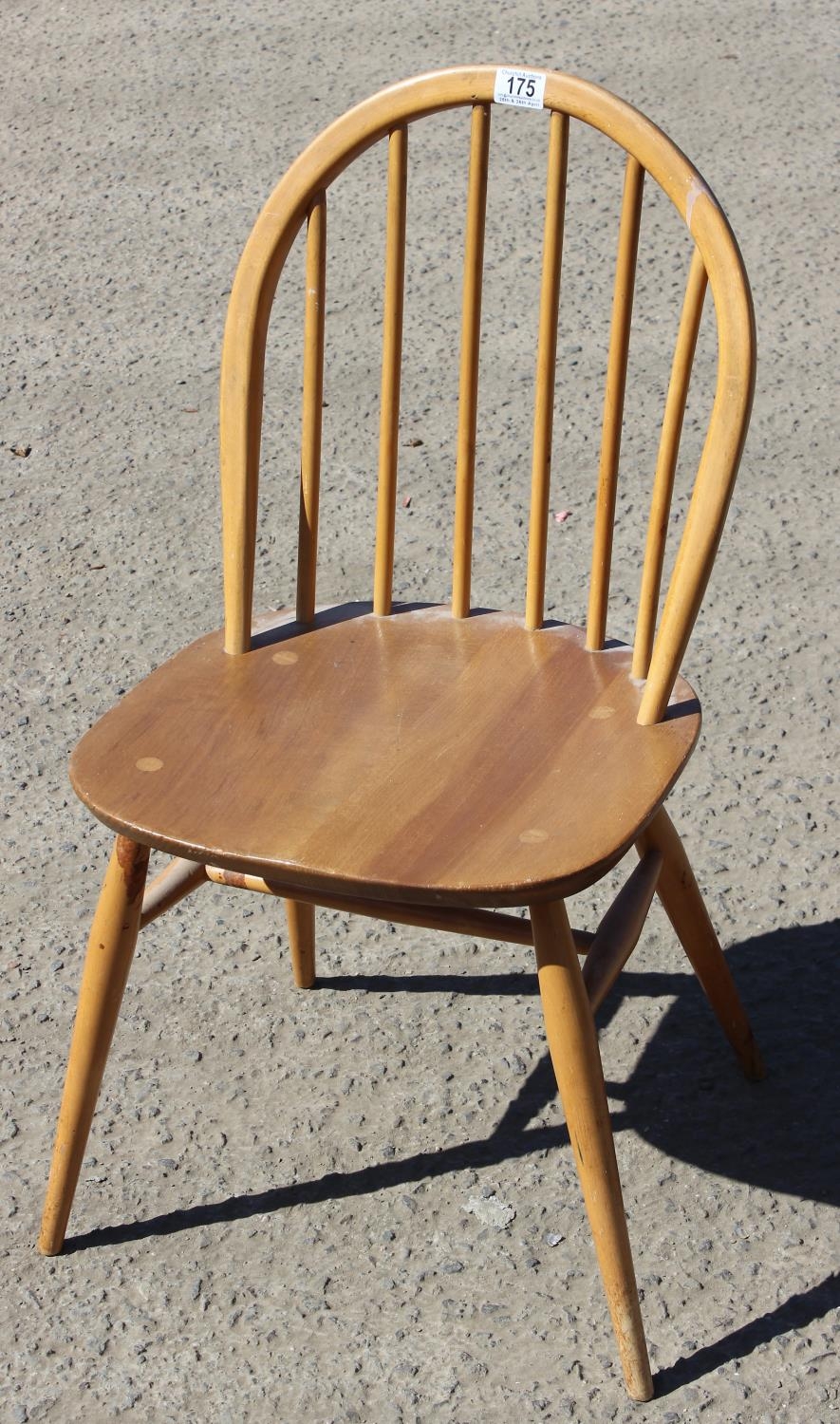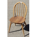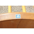 A single blonde Ercol hoop back dining chair with blue & gold label