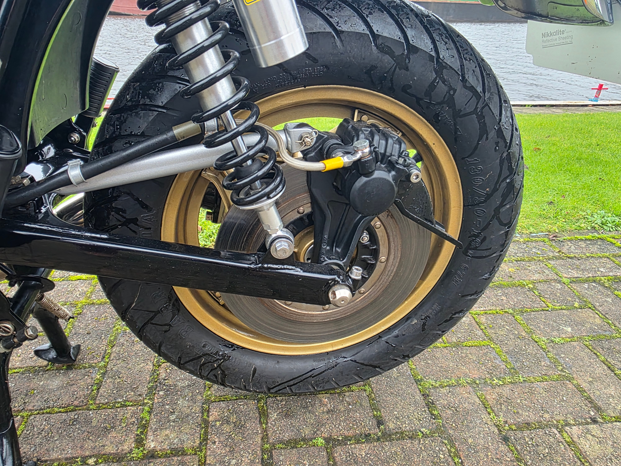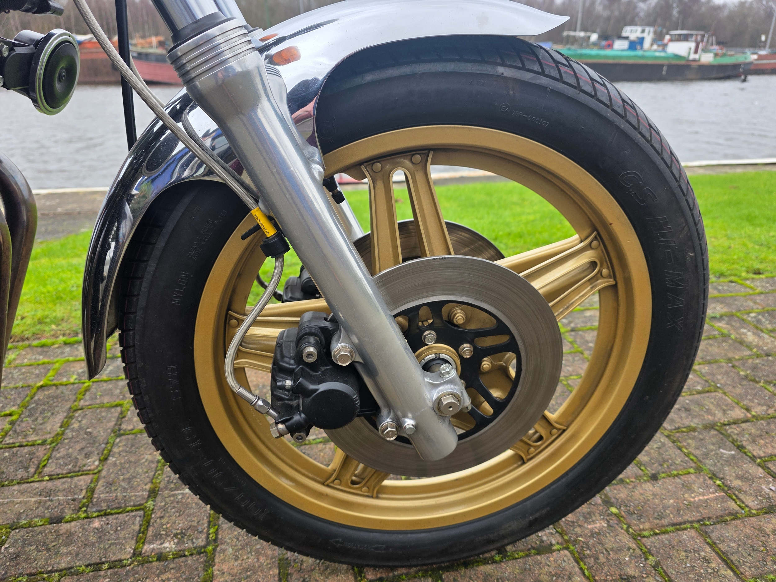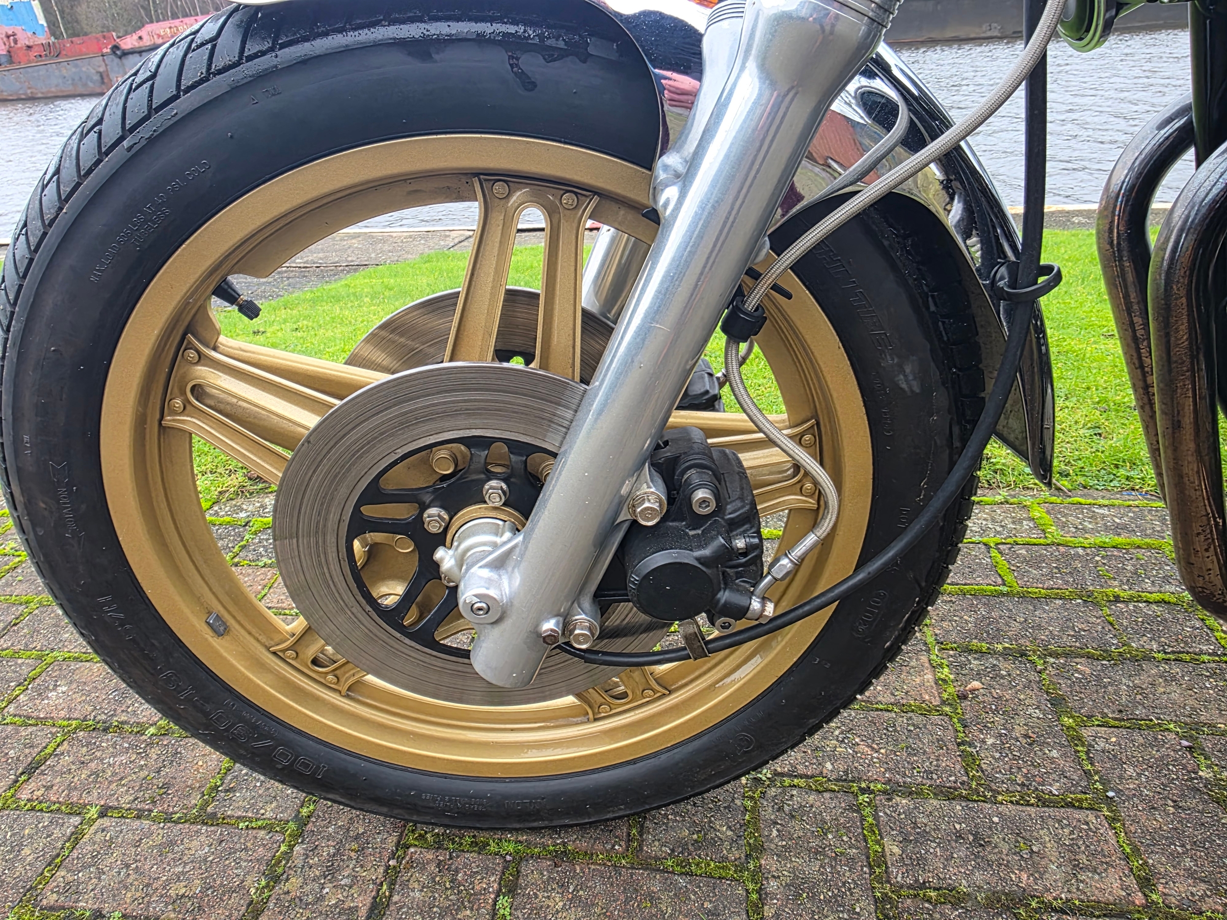 The air/oil cooled DOHC 902 cc engine has four 32 mm Keihin CV carburettors and electronic ignition. The front suspension relies on air pressure for preload while the rear uses air as the main springing medium. The bike has two front disc brakes and a single rear disc.