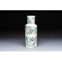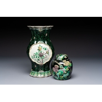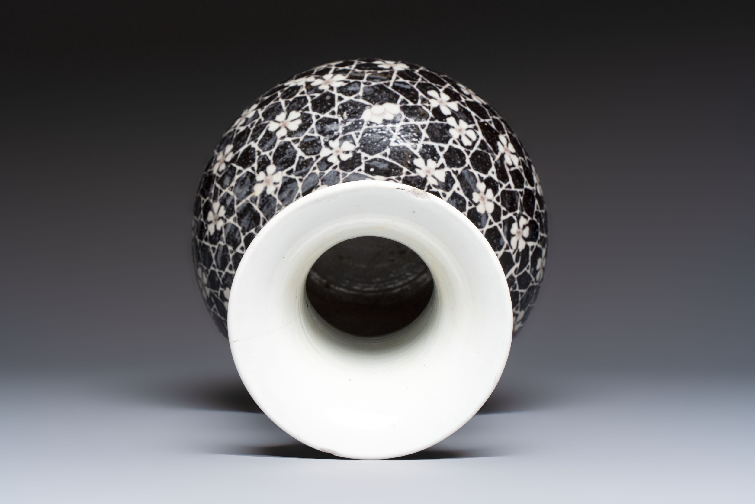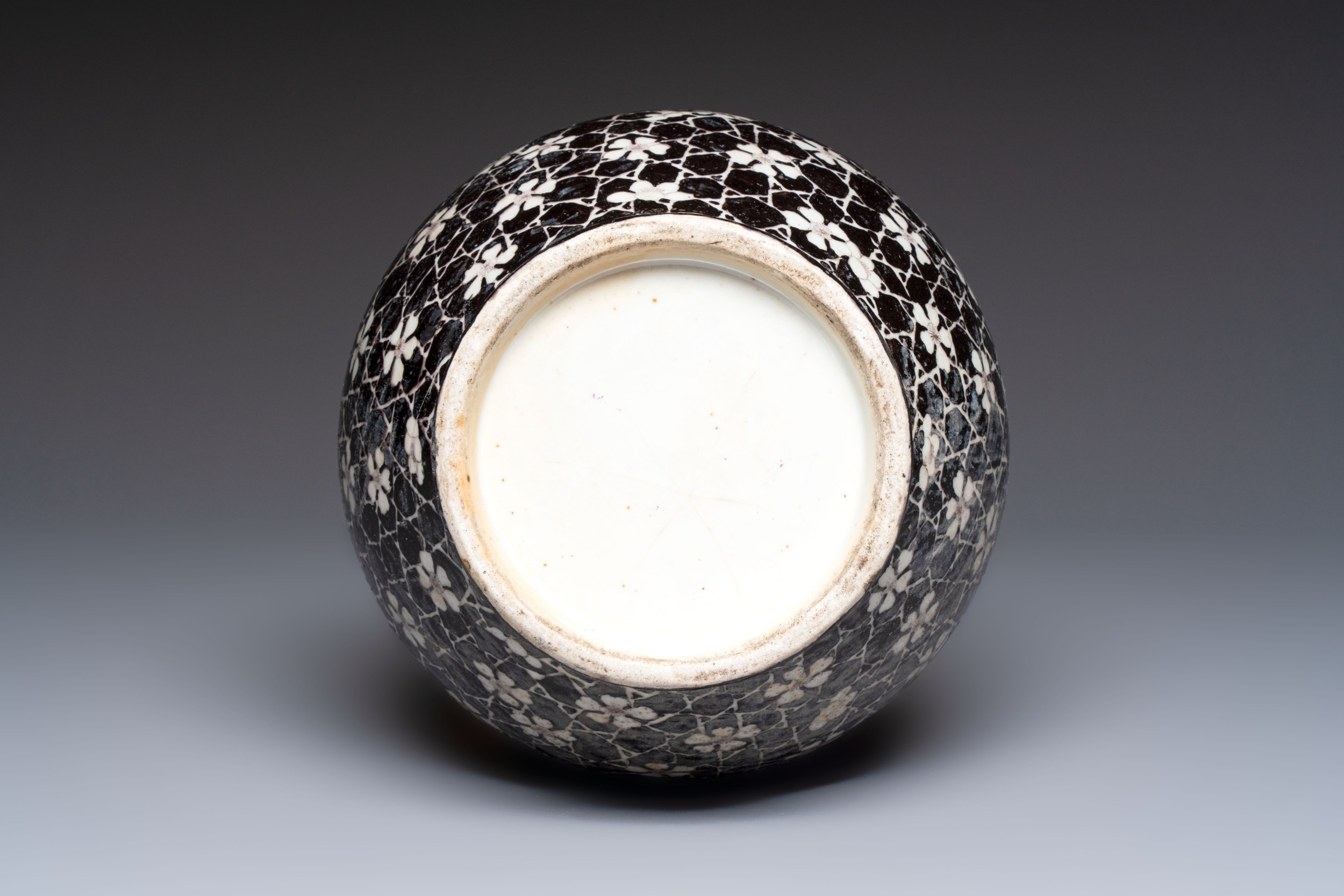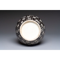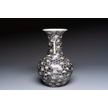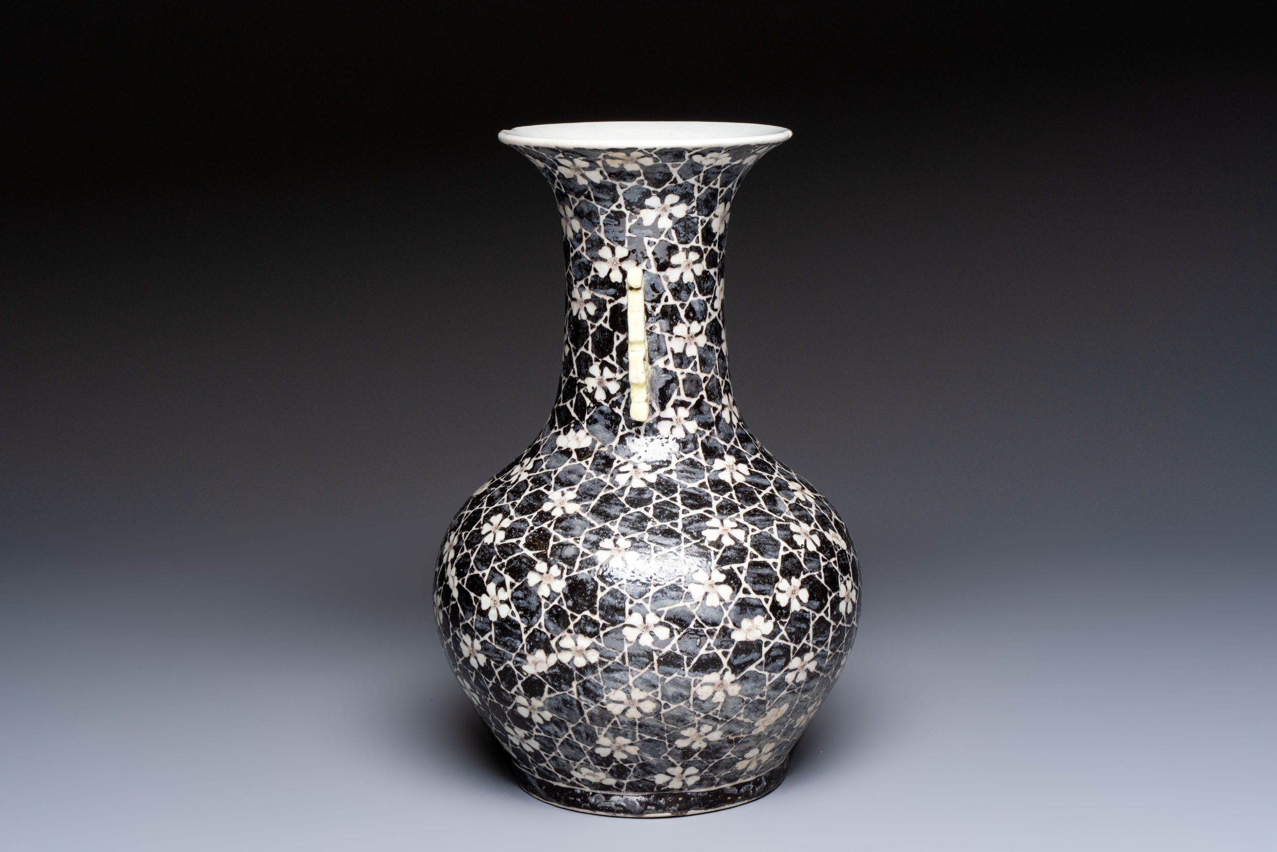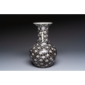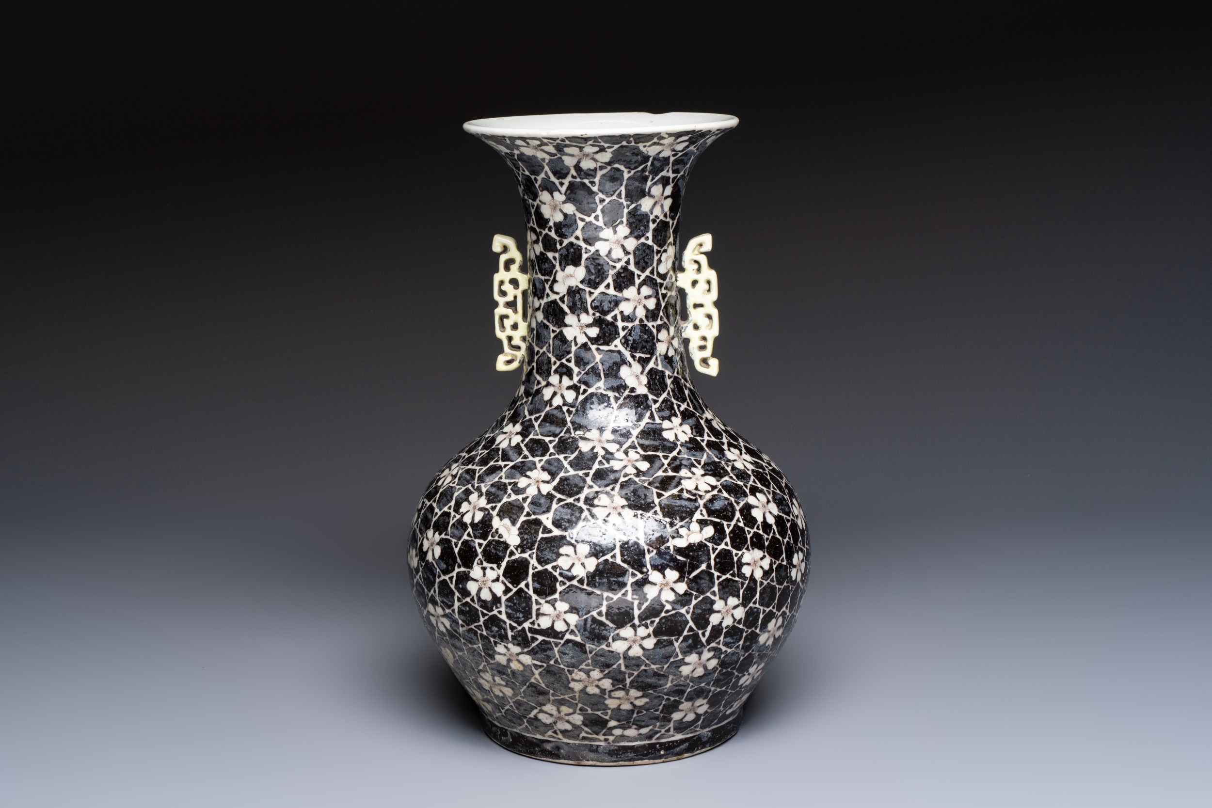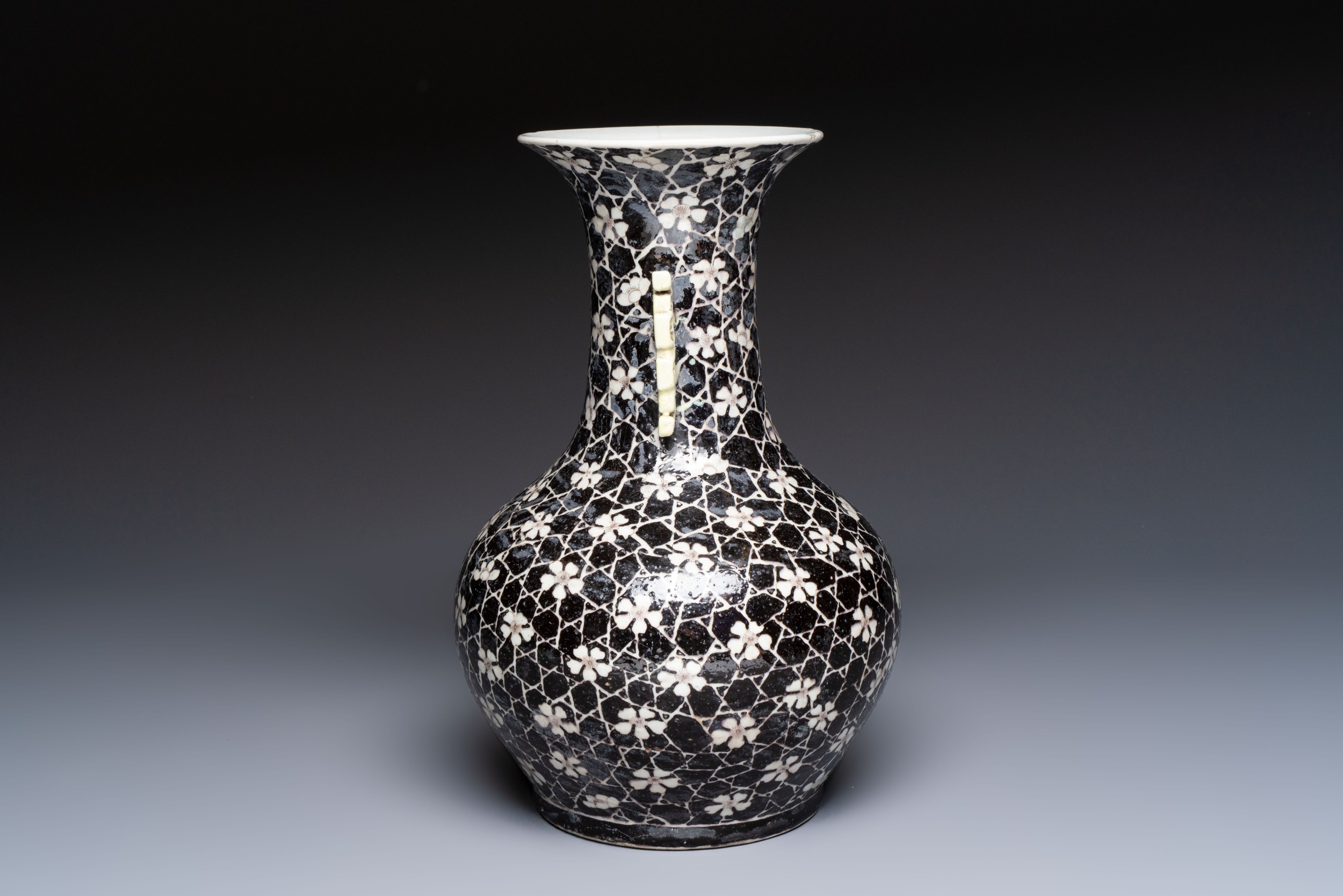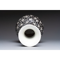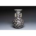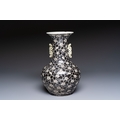 A rare Chinese famille noire 'Prunus on Cracked Ice' vase with 'Chilong' handles, 19th C.