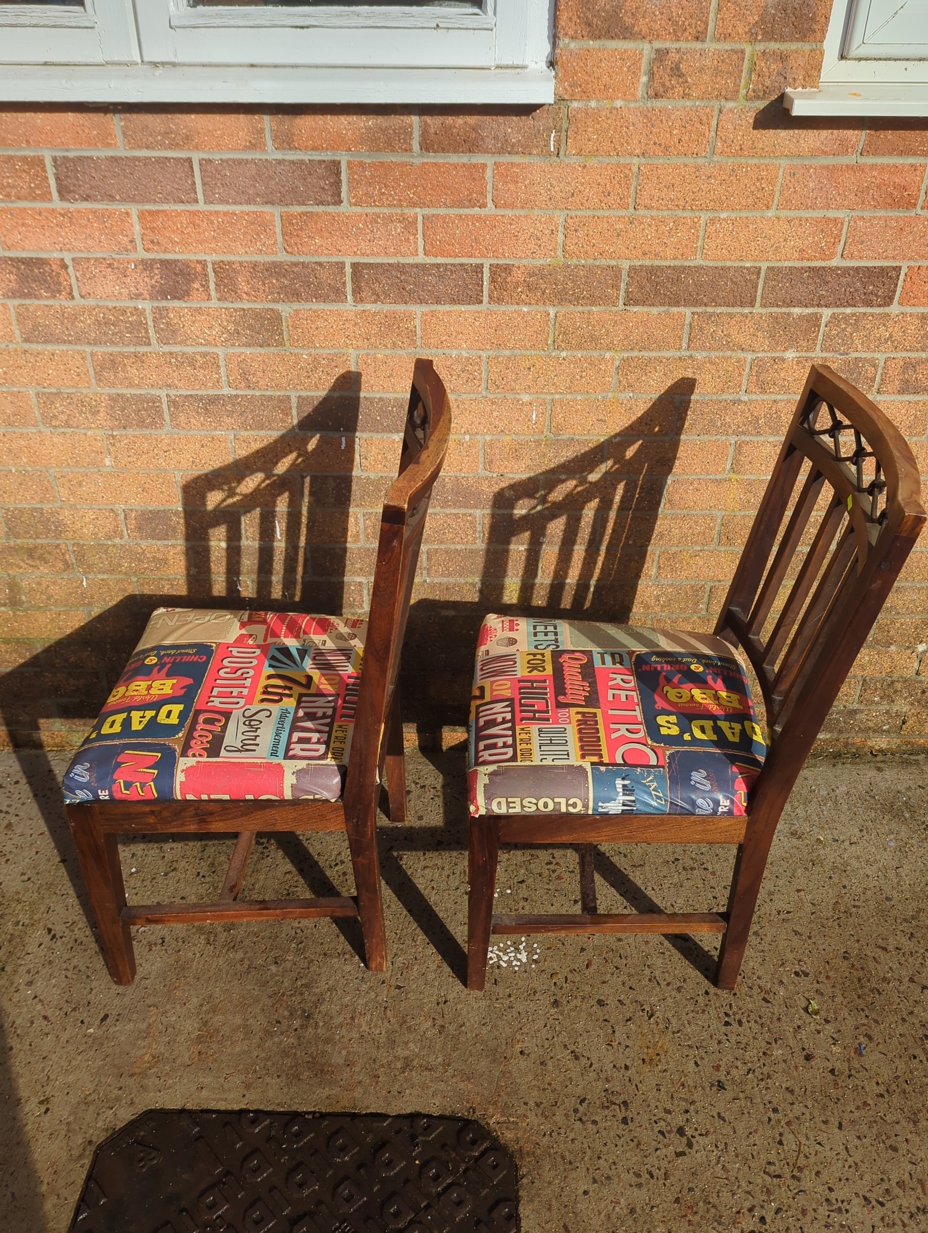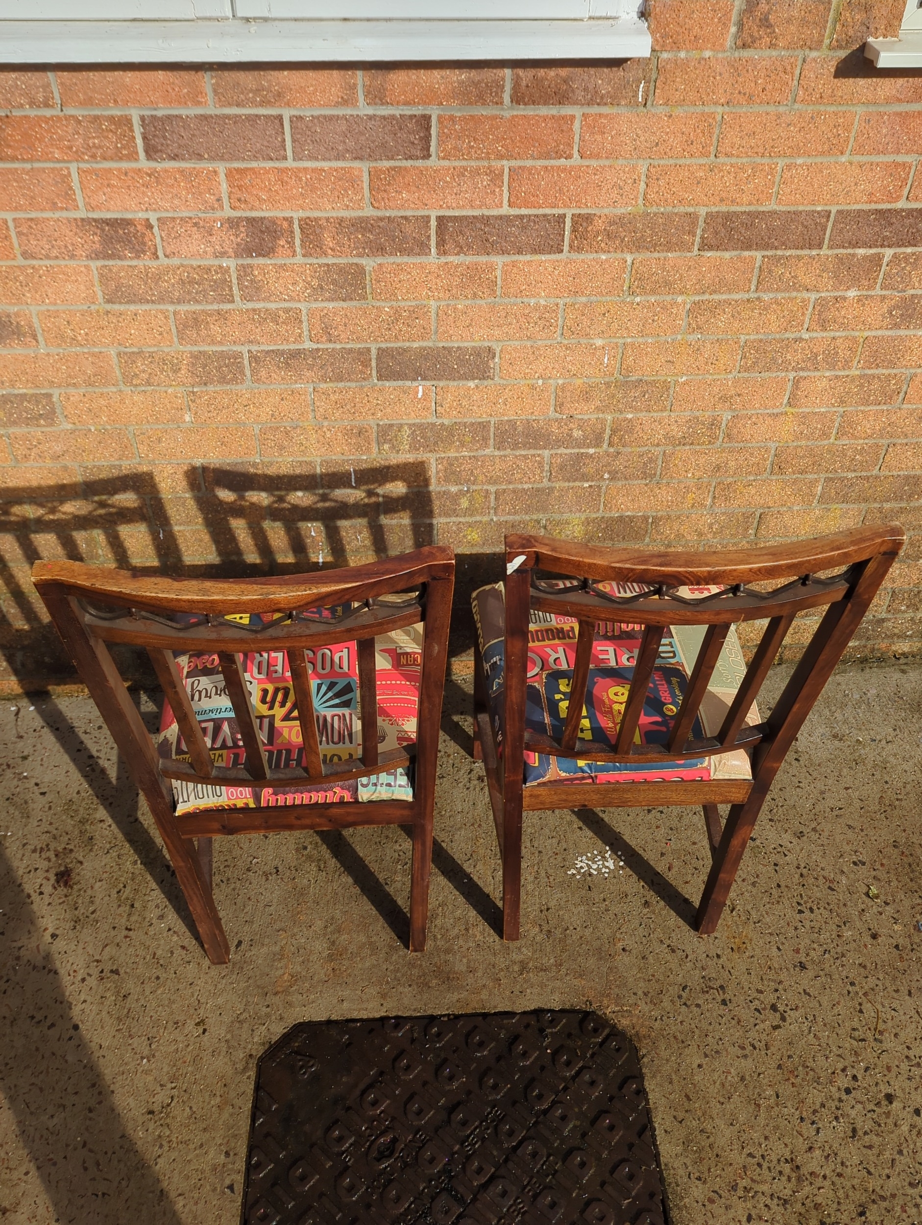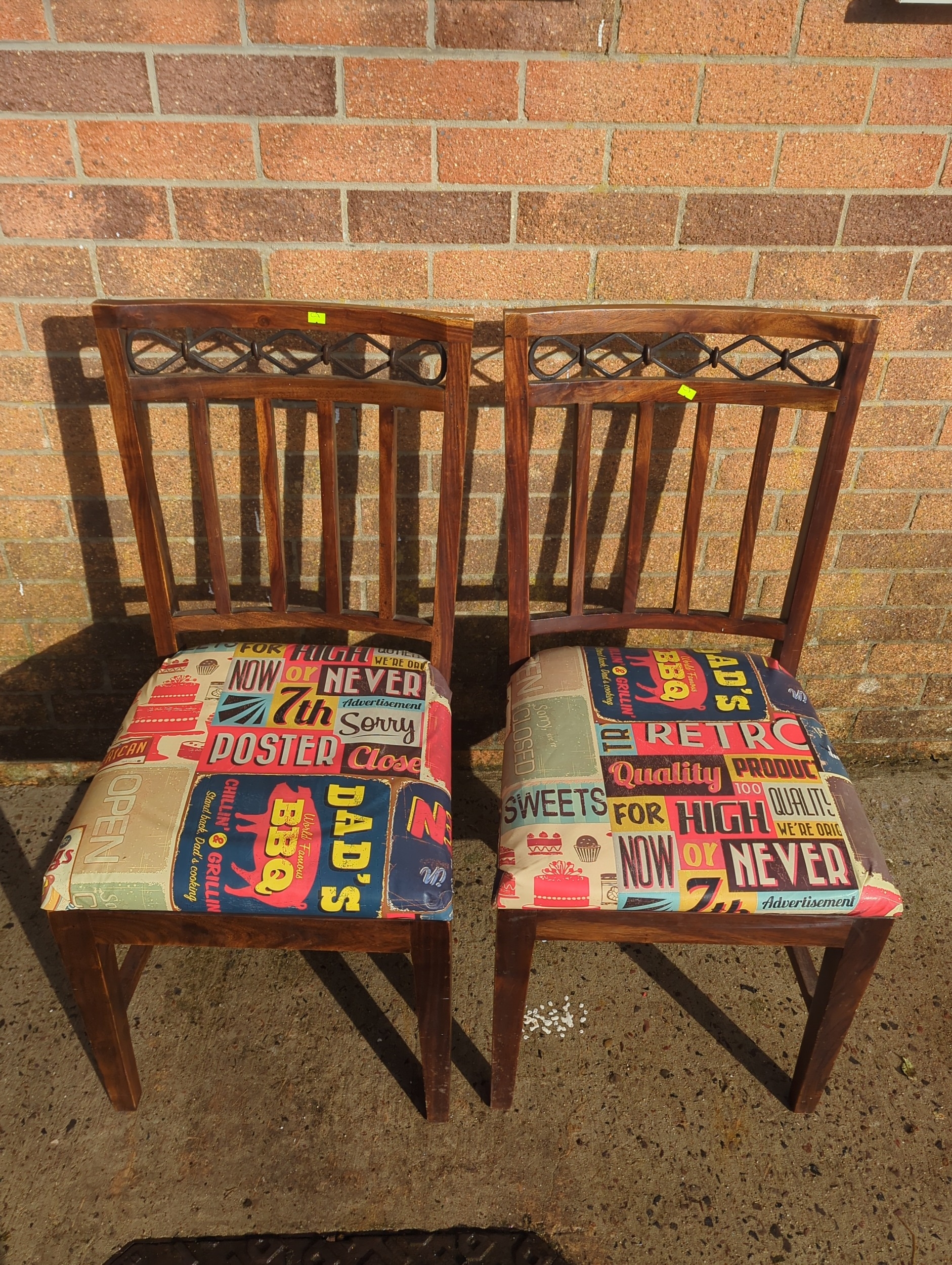 This lot includes two vintage-style chairs featuring eye-catching fabric with retro patterns and text designs. The wooden frames have a lattice back design, adding a classic touch to their robust structure. These chairs are perfect for adding a touch of nostalgia to any space.