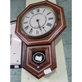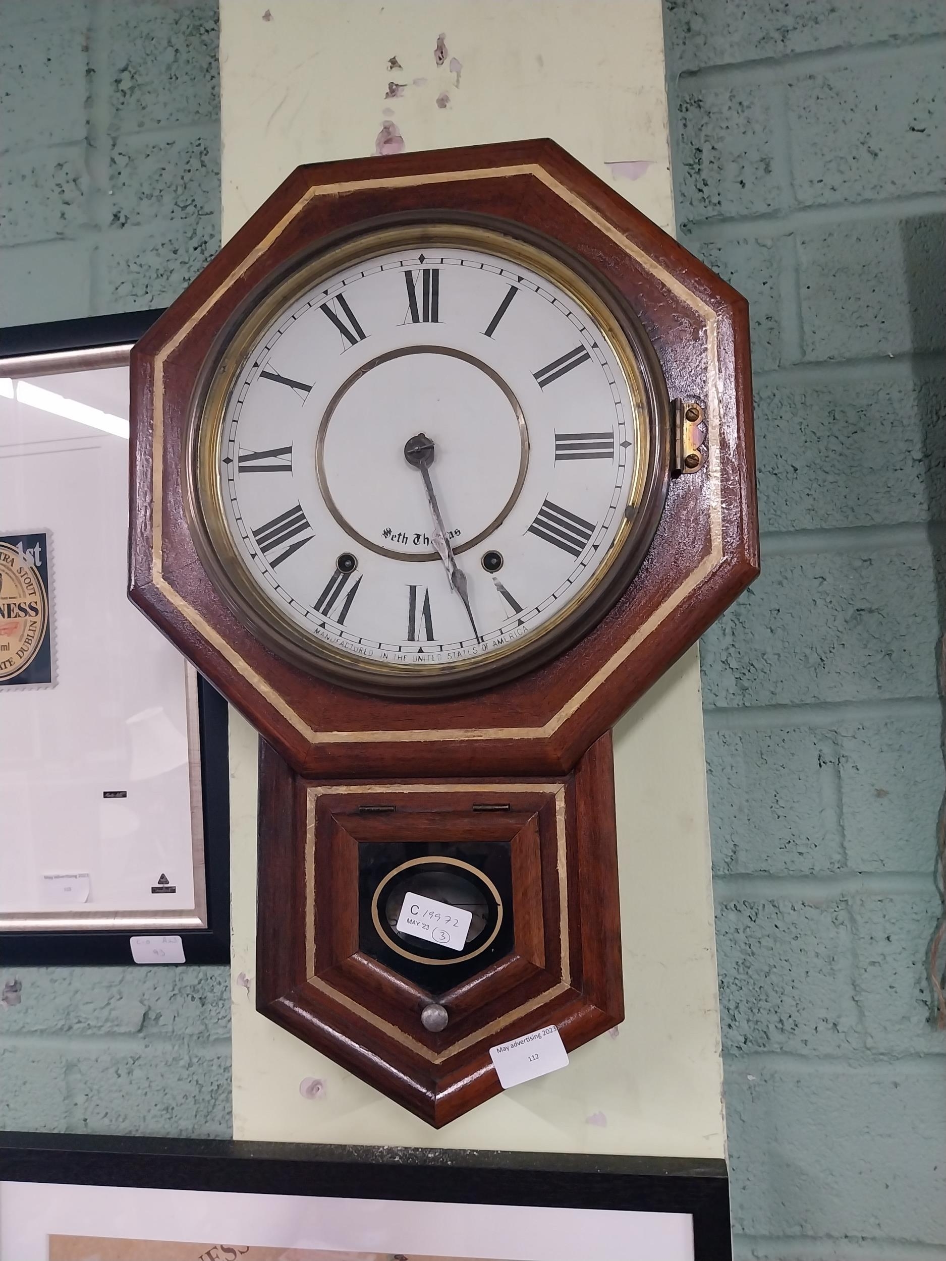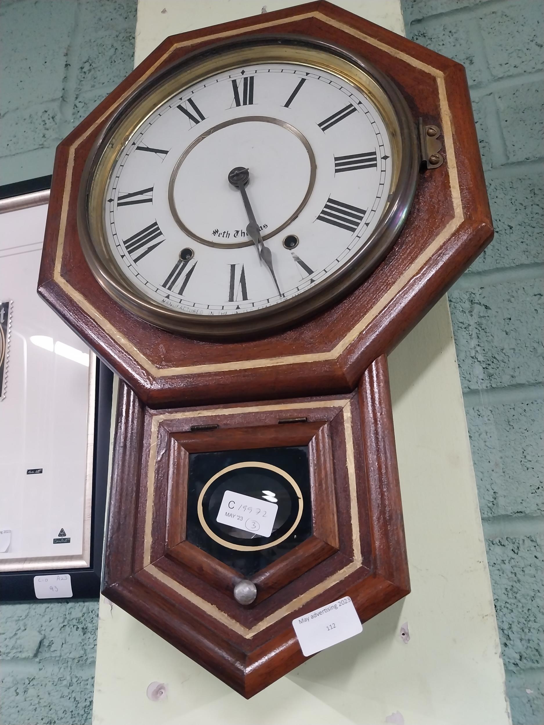 19th C. mahogany drop dial clock with Seth Thomas inscribed on dial. {53 cm H x 34 cm W x 11 cm D}.