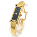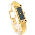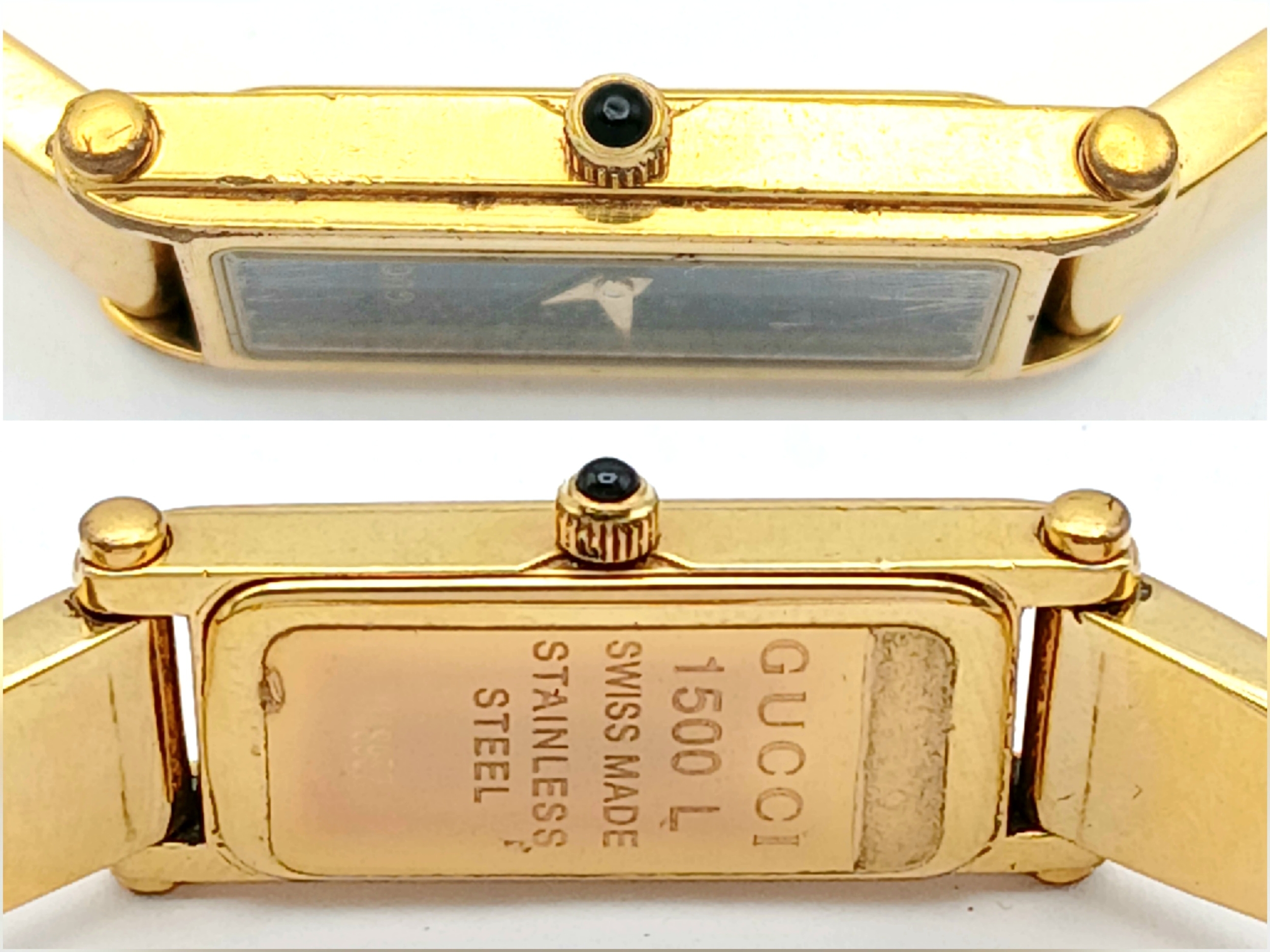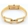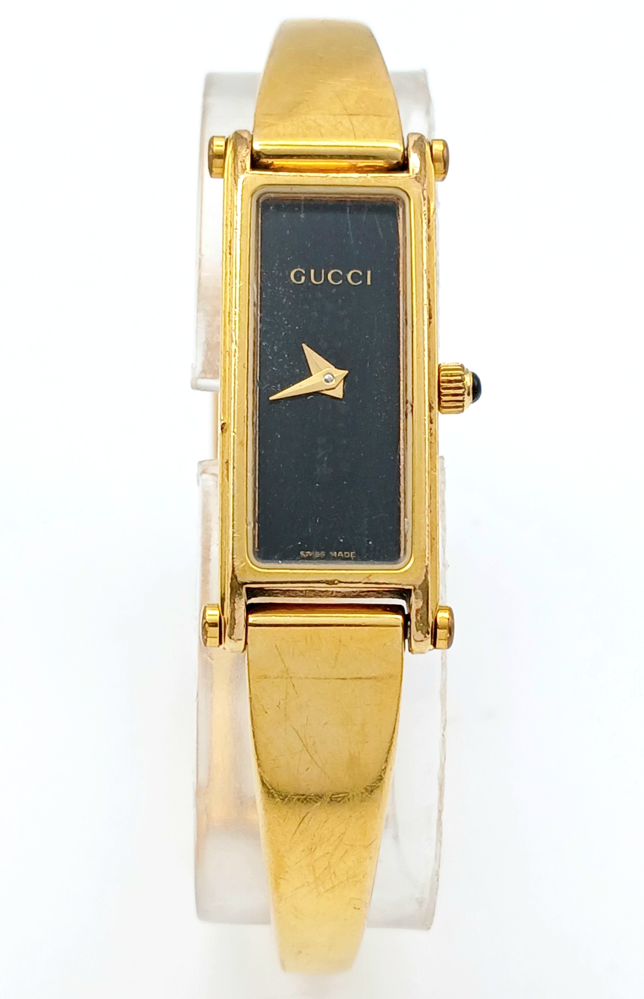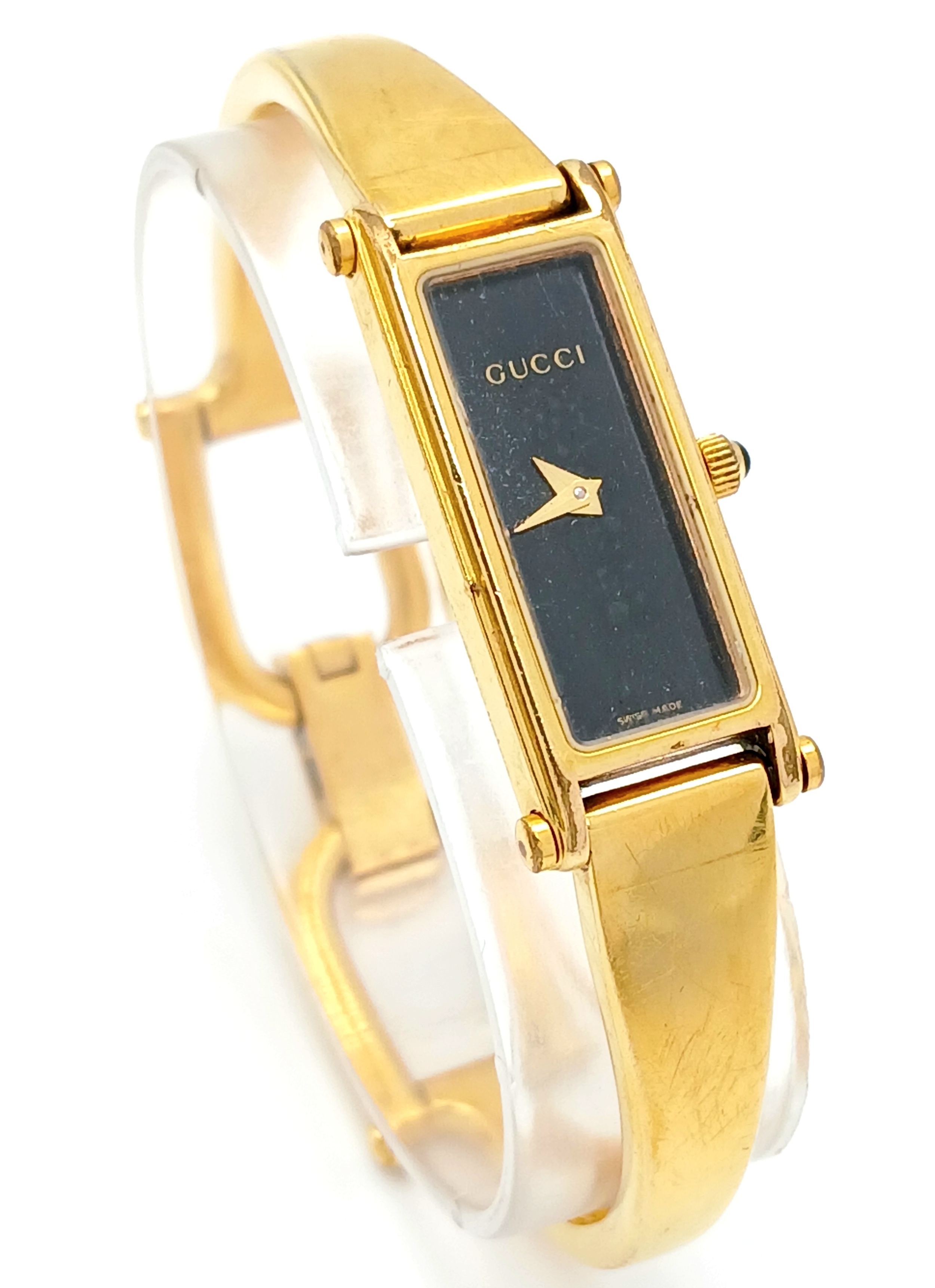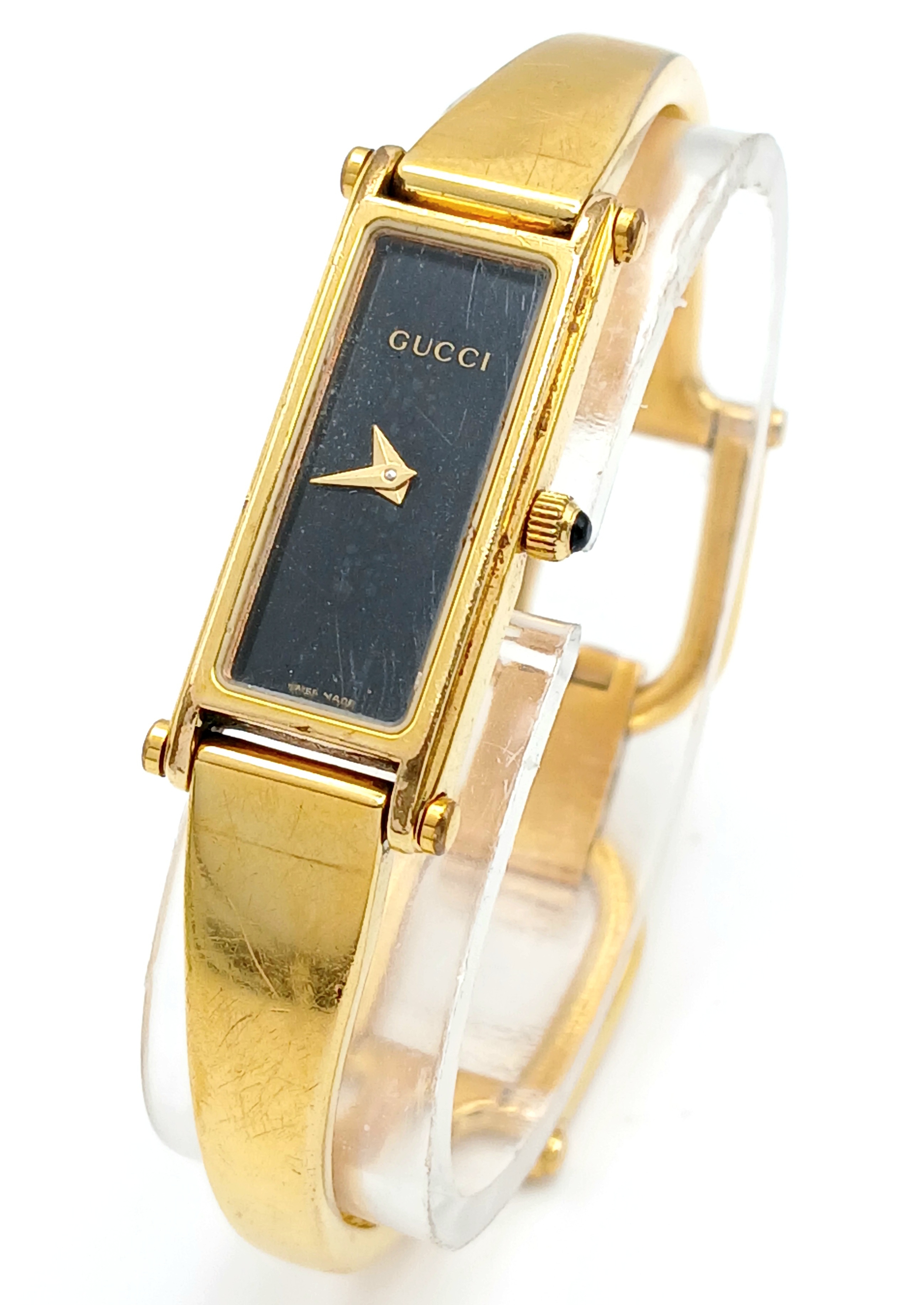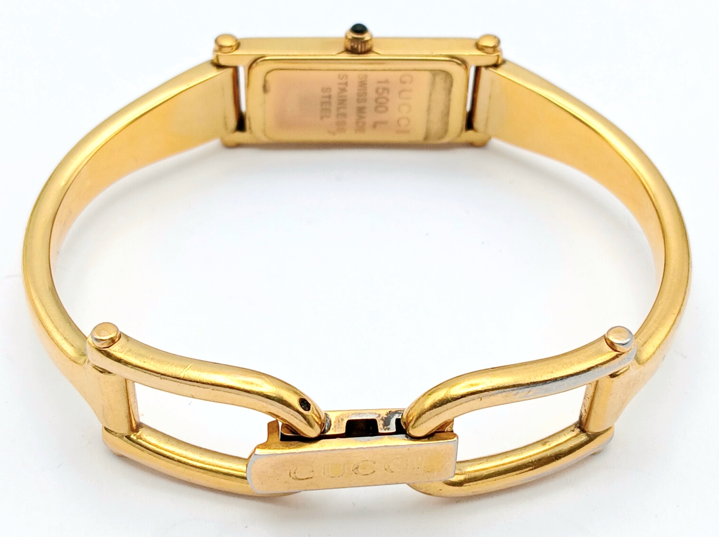 A LADIES GUCCI, GOLD TONE BANGLE WATCH. MODEL 1500L. IN FULL WORKING ORDER, NEW BATTERY FITTED RECENTLY. SLIGHT FADING IN PATCHES ON THE BANGLE. S/A 1457
